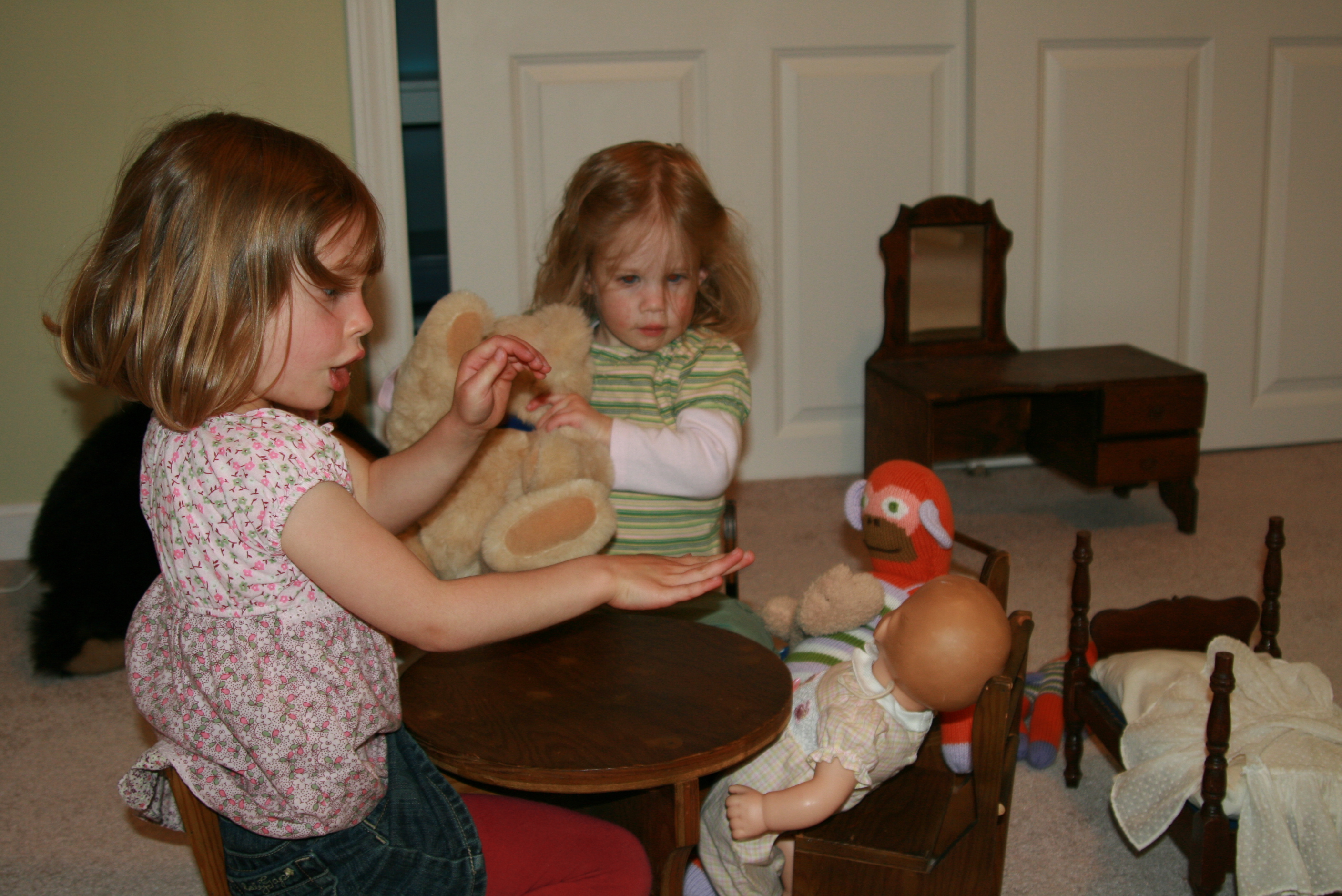 Grace and Tess, stop kicking each other, turn around, and eat.
