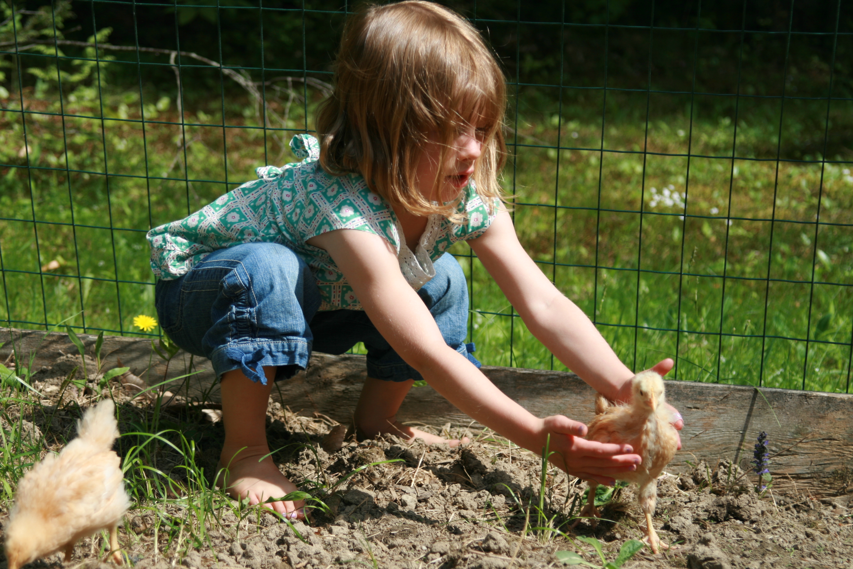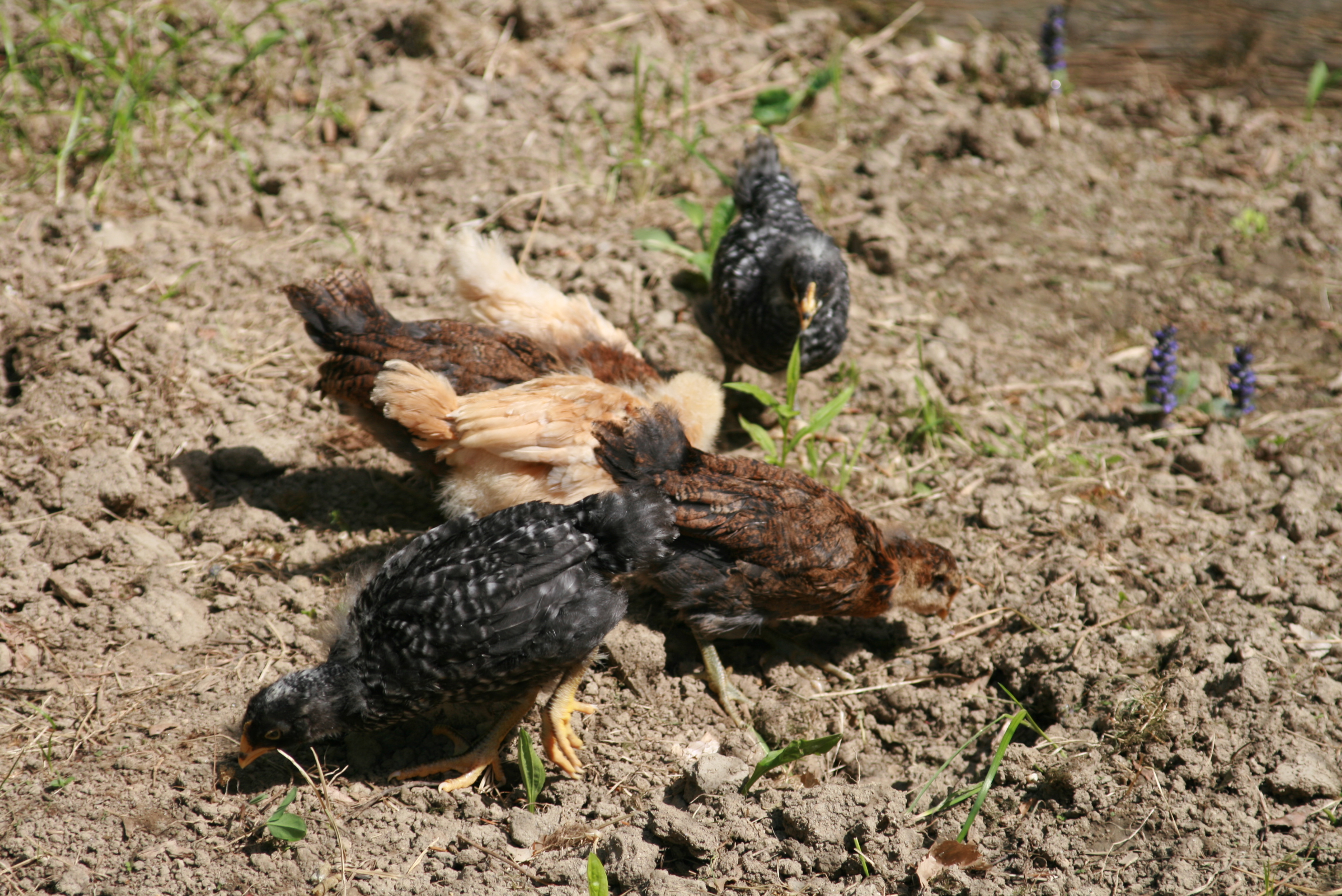 On Friday the weather was warm and sunny, so Grace and I let the chicks out to play in the half of the garden that hasn't been planted yet, but is fenced in. It was very fun – and hilarious – to watch the chicks get to act like real chickens, pecking and scratching and flapping their wings. Afterwards, when they were back in their dog crate, they collapsed in a happy, exhausted heap together. They may act like real chickens sometimes, but they're still babies.