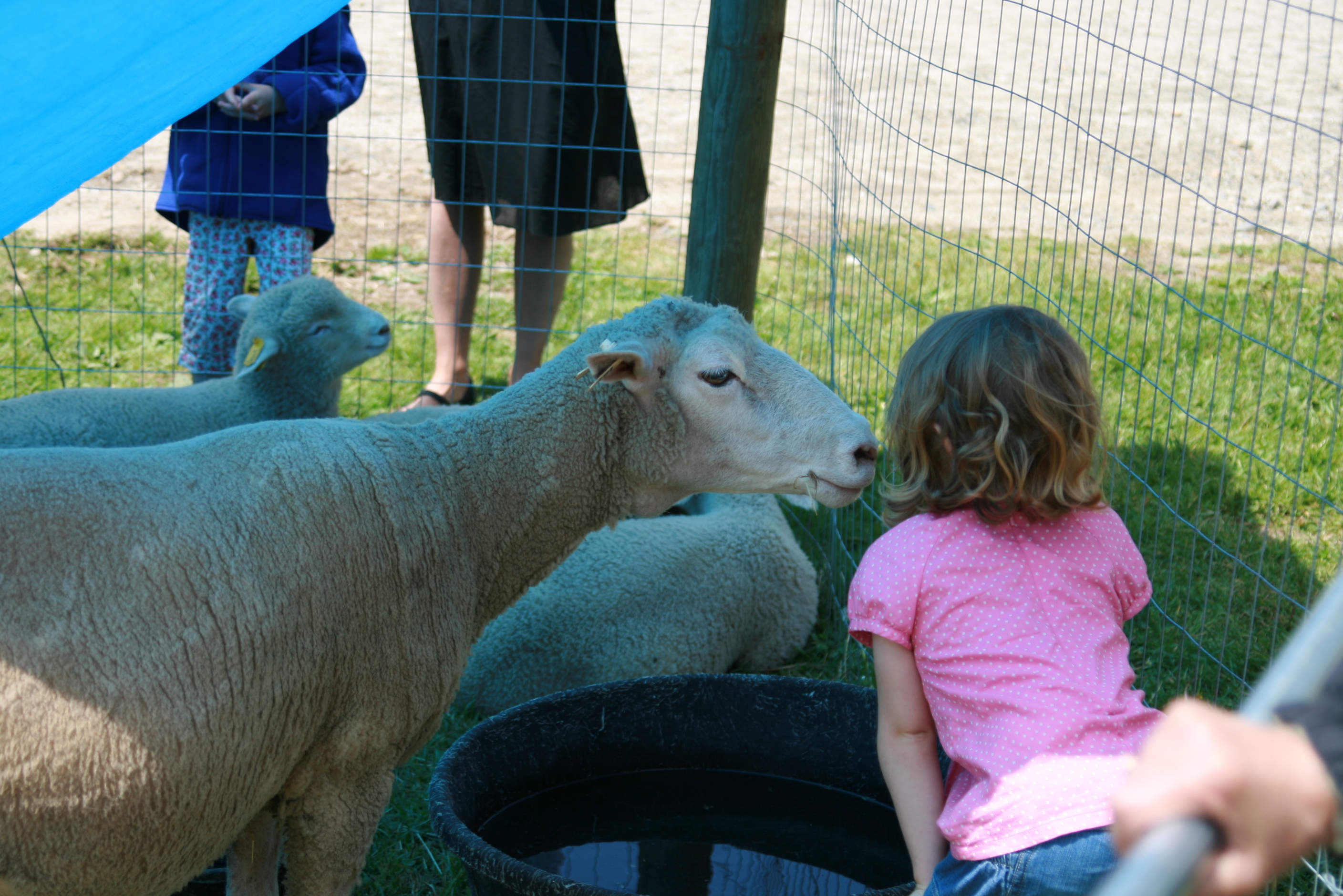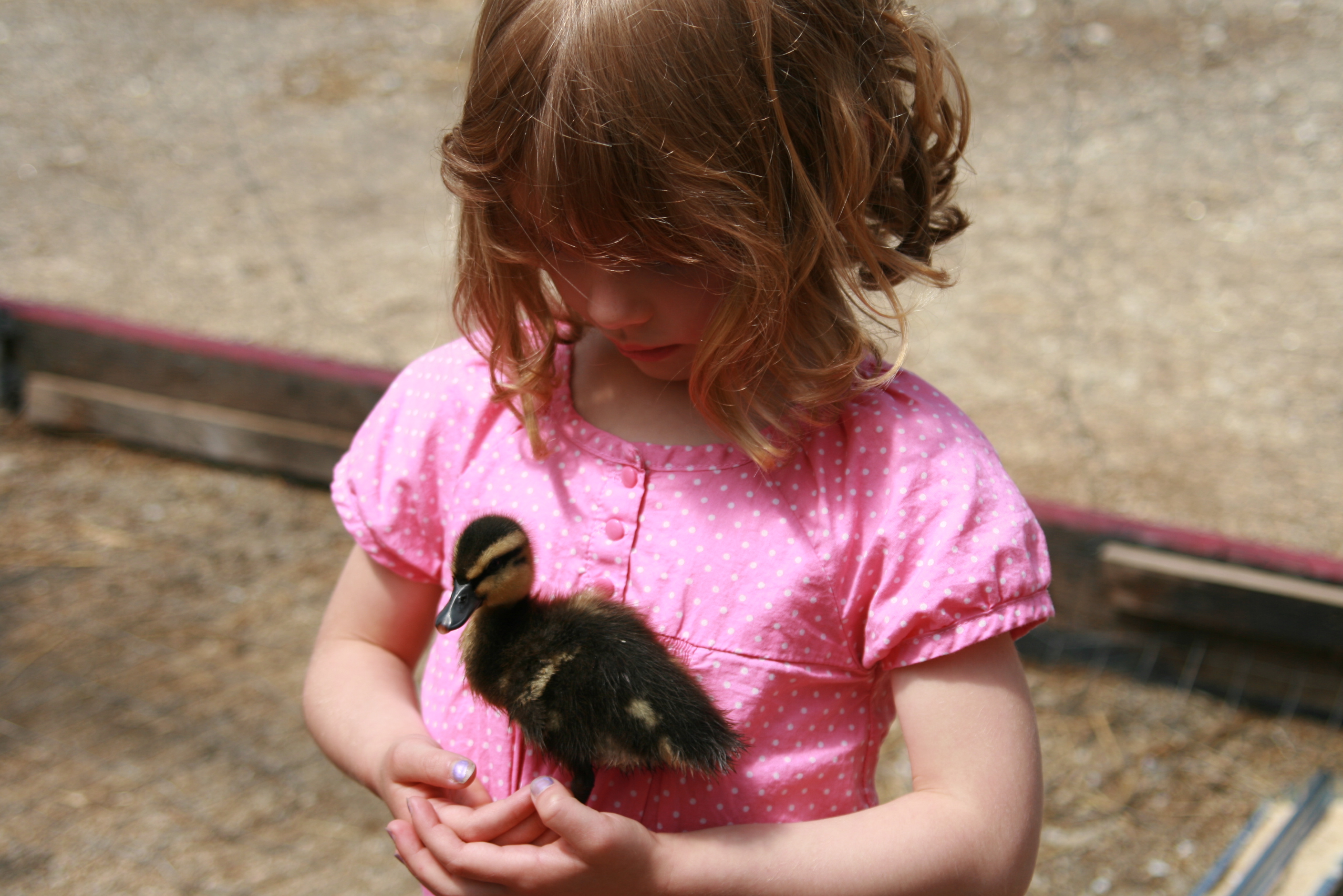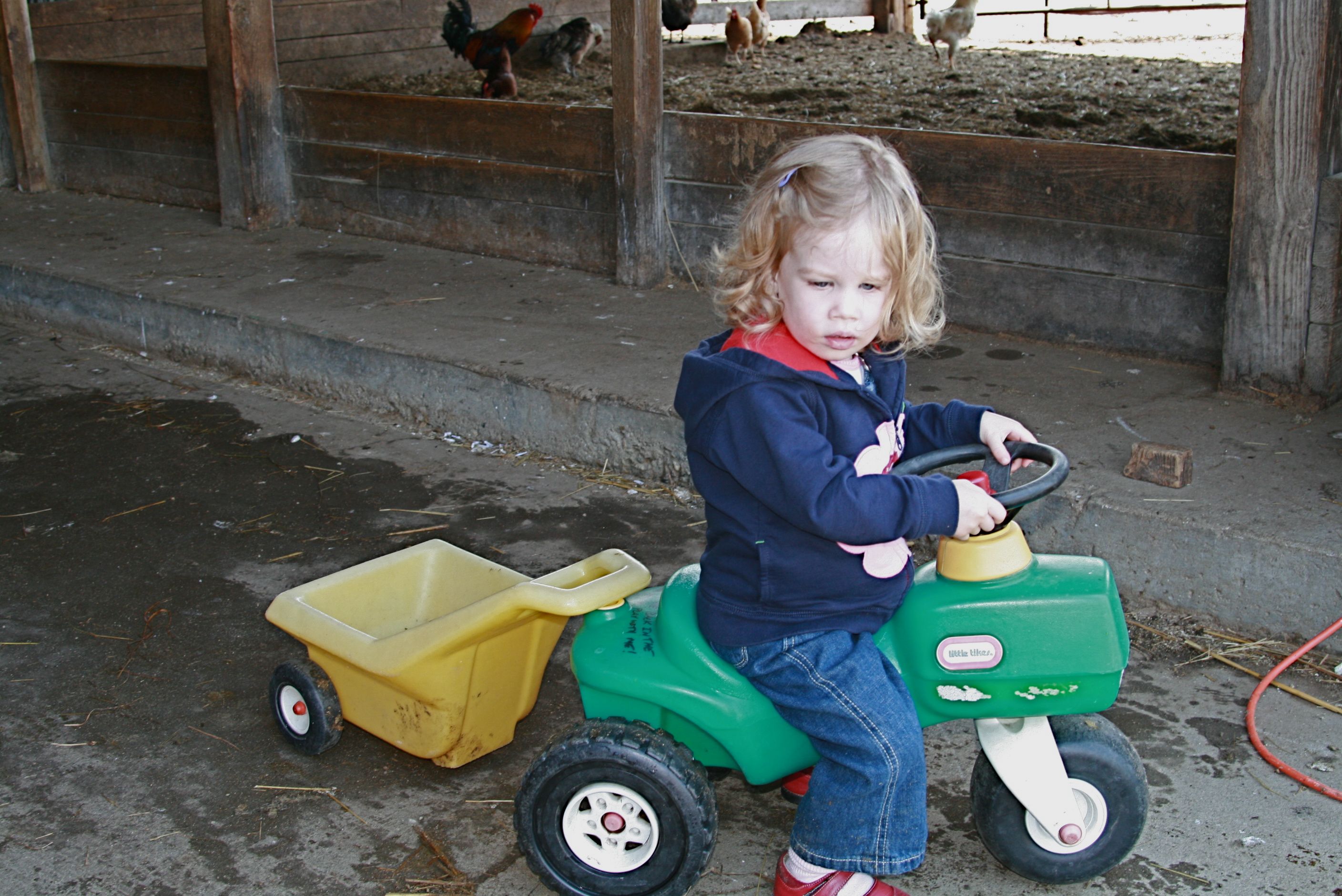 On Sunday we headed to a local farm to visit all of the animals. The girls got to pet lambs and baby goats. Grace held a one-week-old duckling, saw a nest of baby birds, and came nose-to-nose with a mama sheep. Adam checked out the roof on the chicken coop, and the construction of the chicken run (I'd like to think this was because he loves our chicks, but really I think he just likes using power tools). Tess mostly liked the play tractor. All of this is good practice, though, as we embark on our own little farm adventure. Maybe next I can convince Adam to build us a barn…