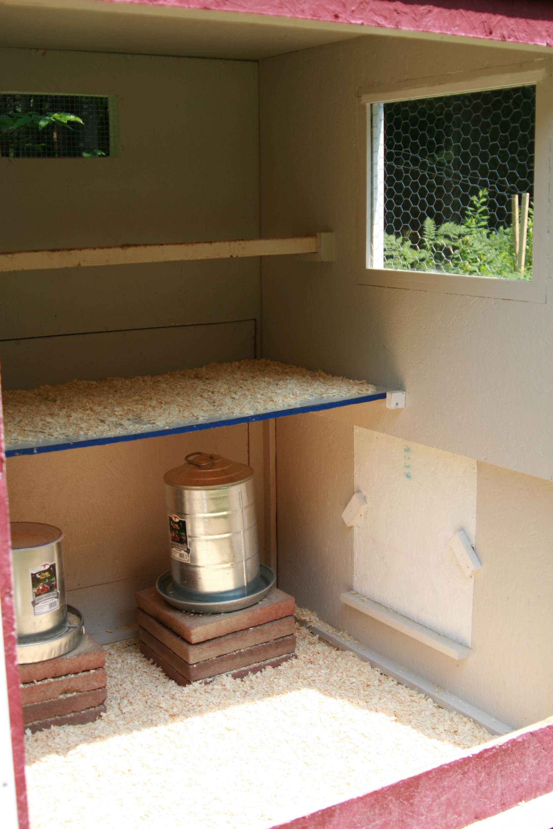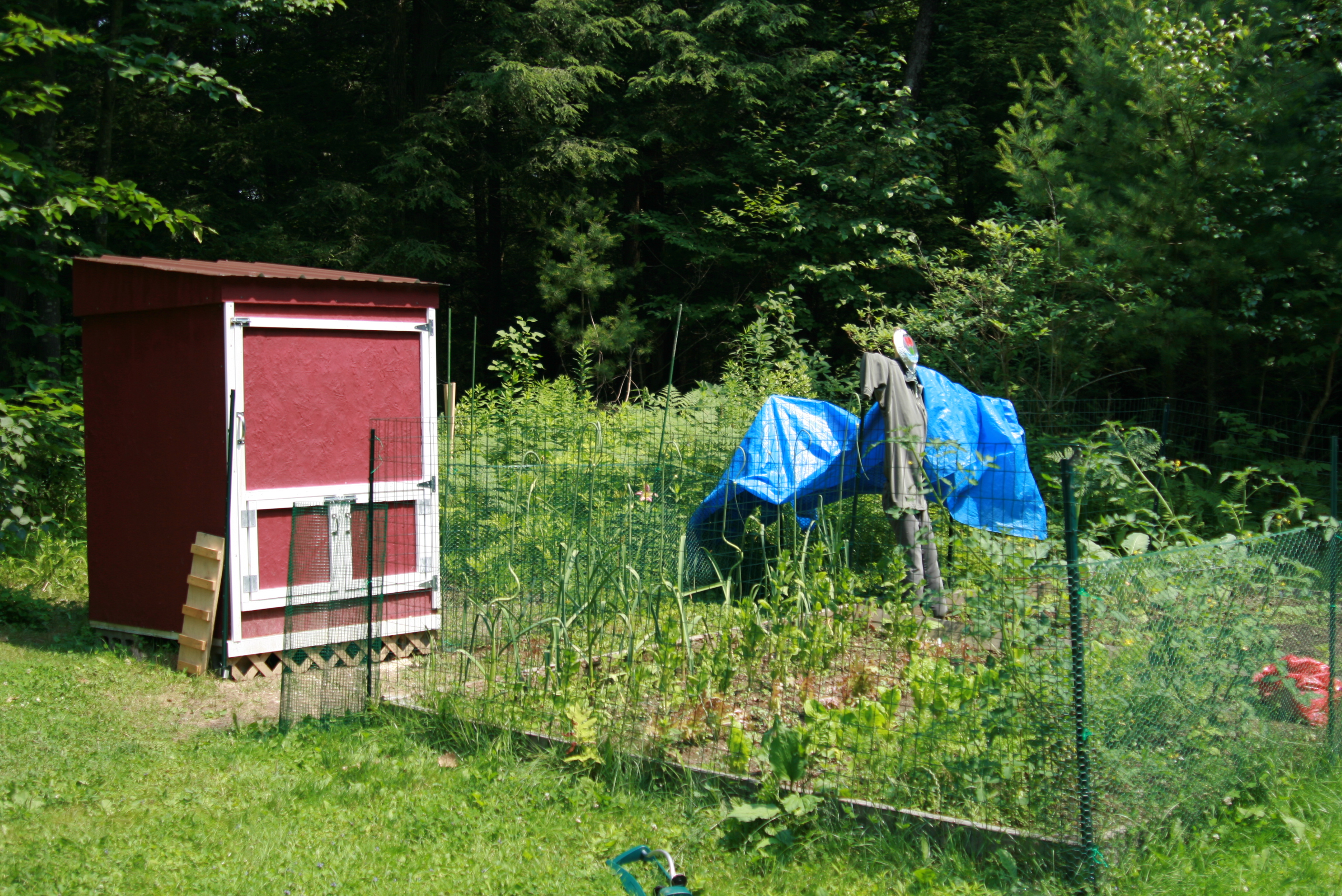 Introducing the Chicken Fortress, the Coop deVille, or whatever you choose to call it (we are still undecided). As you can see, it is off to the side of the yard, next to the garden, so it gets sun but is out of the way. It does indeed seem to be predator proof, as we have already discovered raccoon paw prints on the side of the coop, but the chicks have remained unharmed (phew!). We owe many thanks to “Toolman” Tim, who devoted several Saturdays to aid in the coop construction; “Workhorse” Bret, whose skilled hands and brotherly advice contributed to a perfectly built roof; “Handy Grandpa” Tom, who helped Adam erect the coop; and “Get-it-done” Robin, whose expertise made the metal roof installation seem like a walk in the park. Of course, I am also eternally grateful to Adam, who labored very hard in his “free” time to build the chicks a safe and warm home. Below is an interior shot of the coop, with the vent, perch, droppings board and window. Nest boxes will be added in another 10 weeks or so when the chickens are ready to start laying. The white door at the bottom will eventually open into the “brooder,” an additional 4′ x 4′ area to give the chickens more room to roam in the wintertime (so hopefully this addition will be completed in the fall – it is not insulated and should be faster to build). Anyway, the chicks seem to be very happy there, although I had to teach them to sleep on the perch at night by physically placing them each up there for a few nights in a row (at first they preferred to sleep like puppies, all piled up on top of each other on the floor). And today, when the sky began to darken and we heard the rumblings of thunder, Grace and I had to run around the yard for about 20 minutes to get the chicks to come into the coop. Because as much as they like their new digs, they like scratching and pecking in the yard more. I suppose we won’t hold that against them.