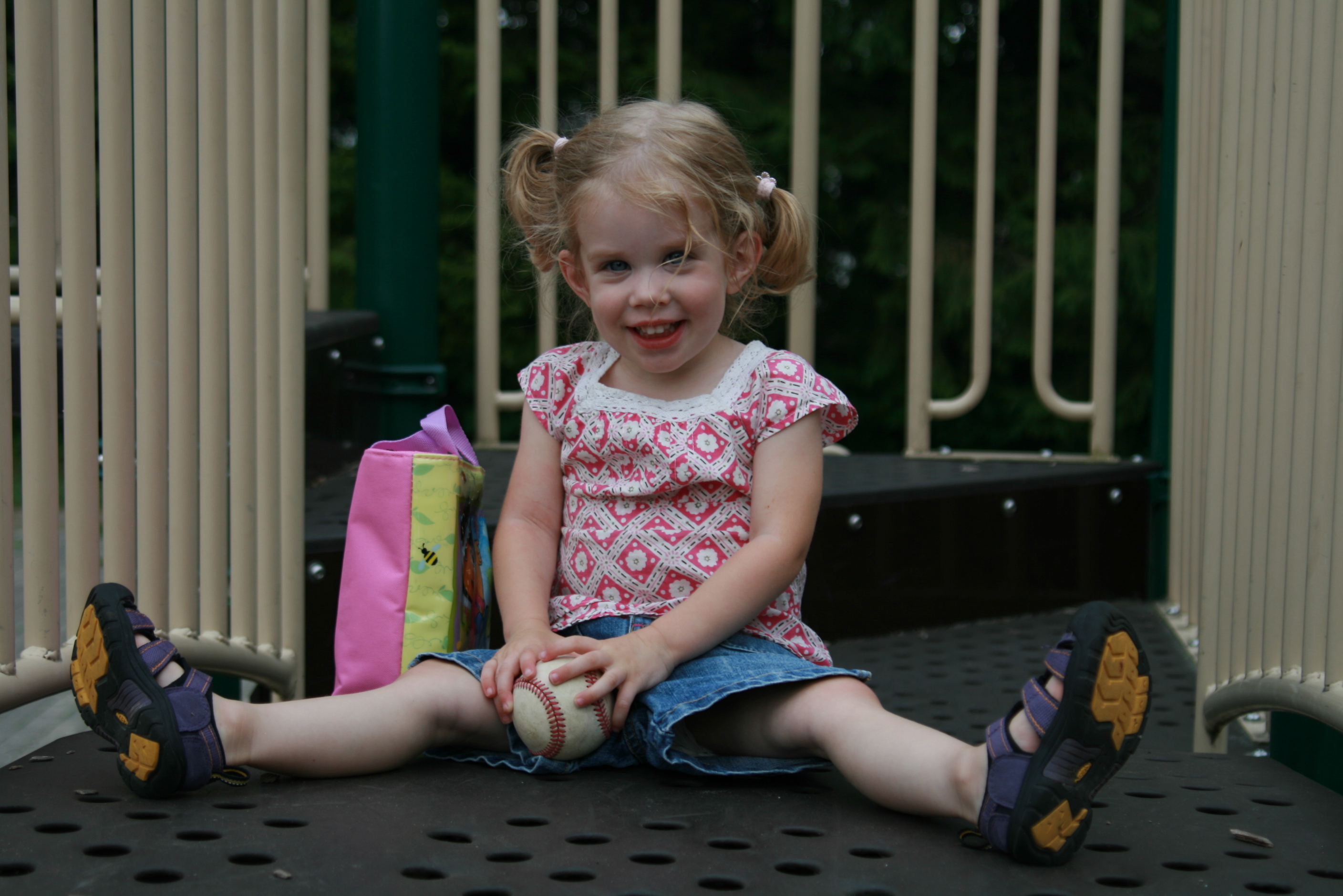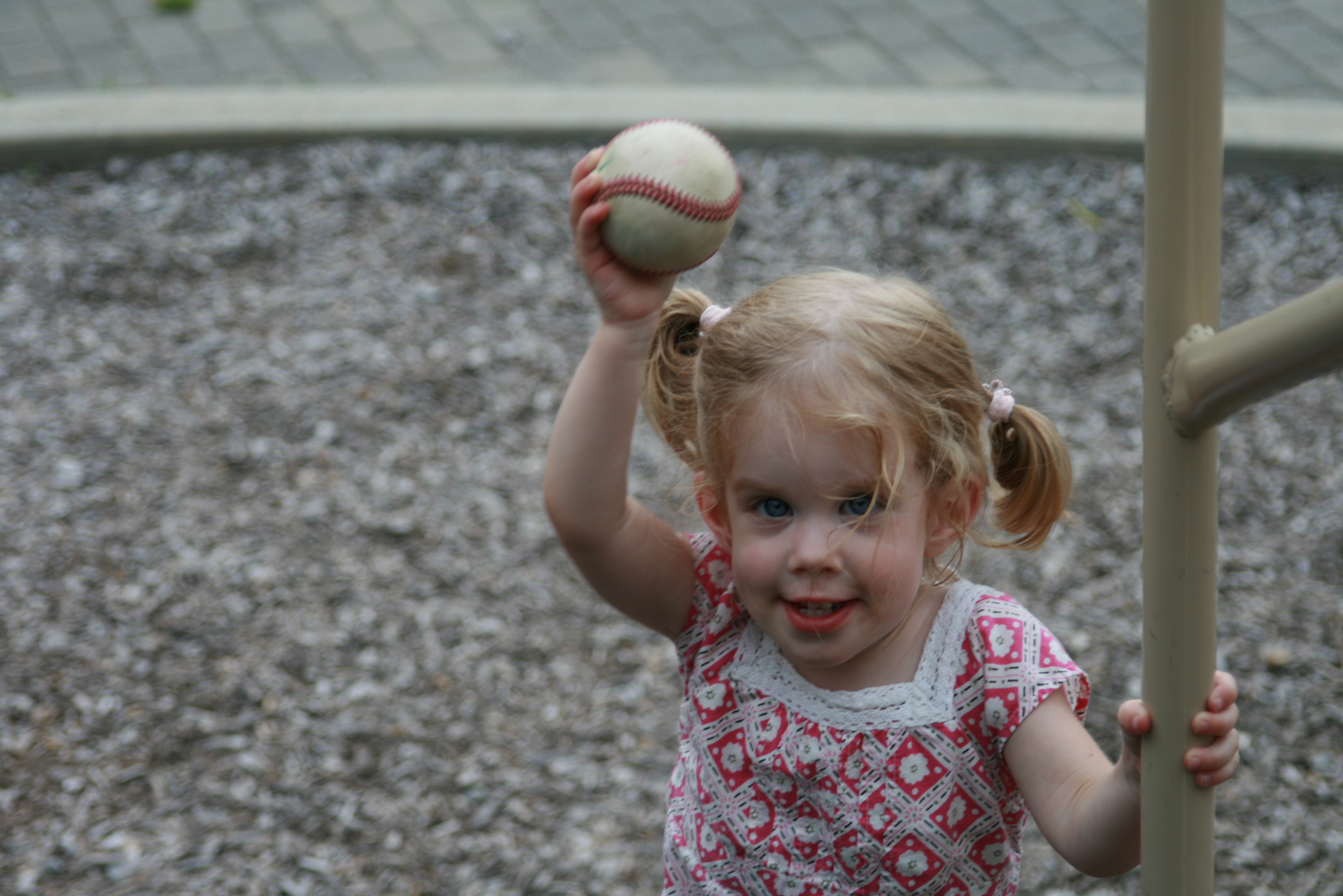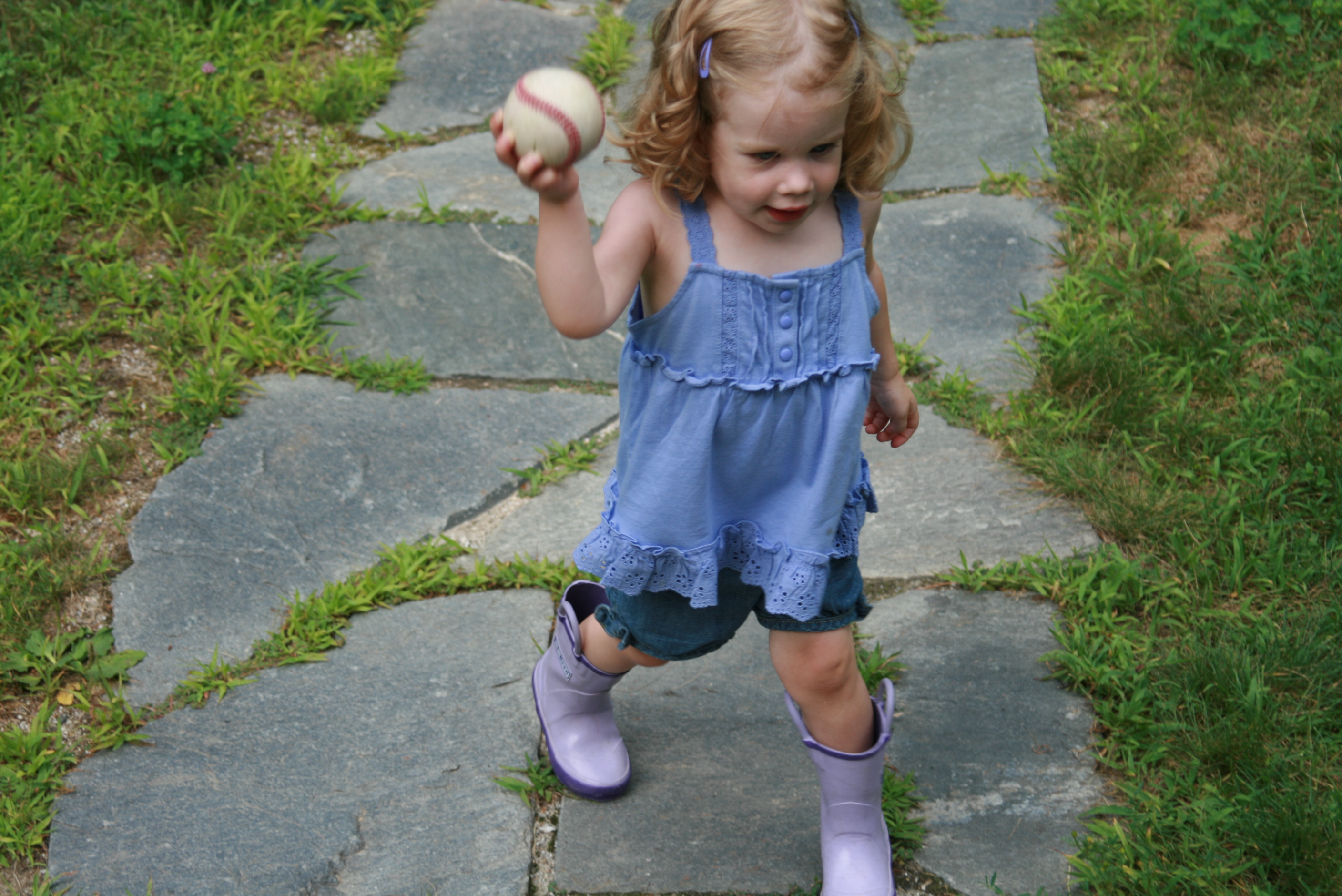Tess received a new purse the other day as a gift, and she has been carrying a baseball around in it. Yes, a baseball of all things. She loves to roll it around and show it off to people (my, how she charmed the cashier at the supermarket!). If she’s going to have a future as a ball player, though, she needs to learn that rubber boots are not the best footwear for running the bases.