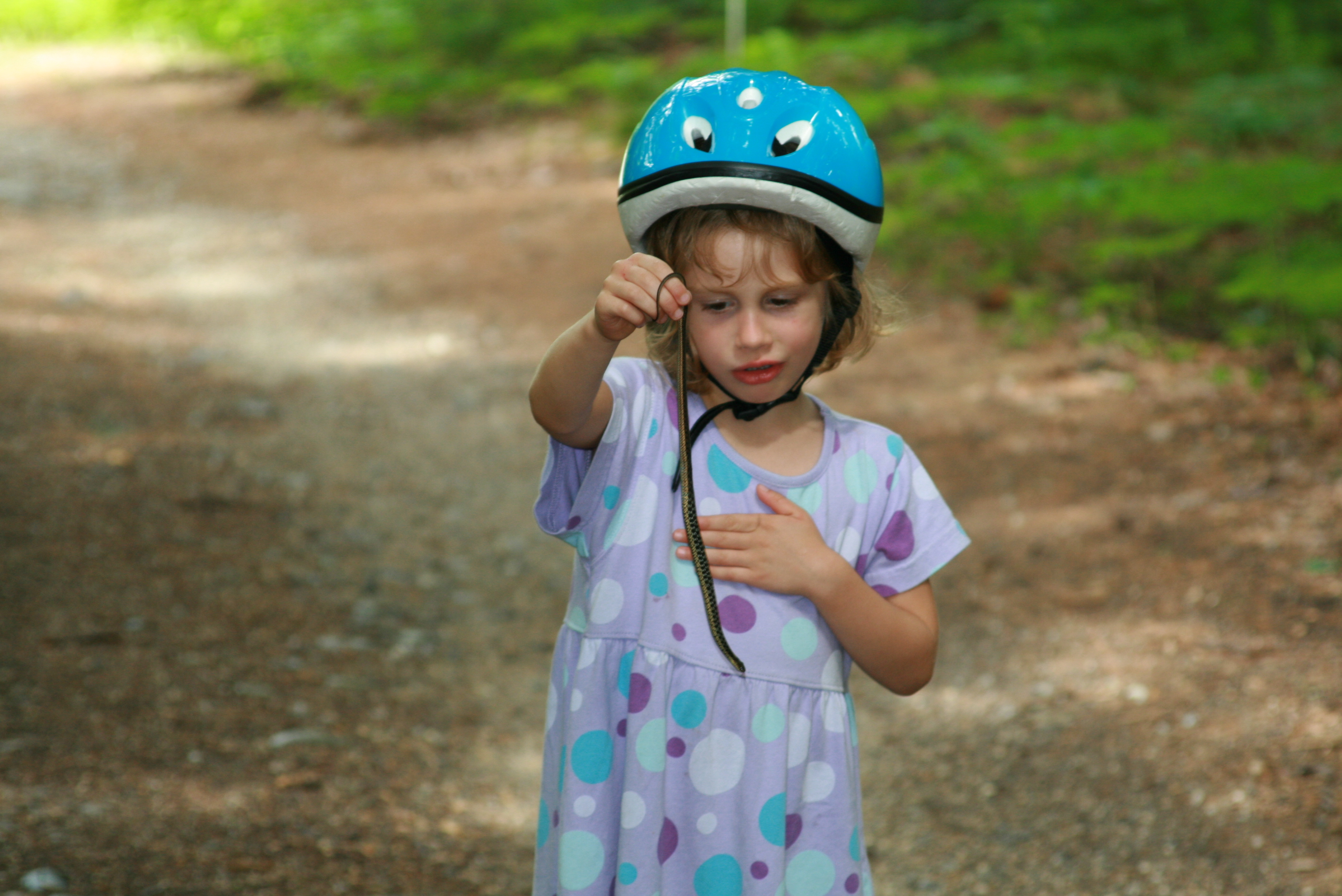Yesterday, Grace was riding her bike down the driveway when I spotted a garter snake slithering across. I pointed out the snake to Grace, and of course, she jumped off her bike and proceeded to follow the snake into the woods. And of course, she caught the snake, and held it nicely with two hands, very calmly checking it out. I was very proud of my snake-catching girl (and proud of myself for successfully suppressing the urge to yell, “No! Don’t touch it – snakes are creepy!”). And of course, I ran and got my camera – very quickly. After I had snapped a couple of shots, she calmly walked back into the woods and released the snake. It wasn’t until then that she said, “It bited me!” Garter snakes aren’t venomous and don’t have fangs, but I could see the mark on her hand, and then I was doubly proud of that tough, animal-loving kid – who had continued to hold the snake after it had bitten her – of course. That’s some very good training for an animal rescuer, but I’m pretty sure that her first time catching a snake was also her last. Later, she was telling the story to her Grandpa on the phone, and she said, “Grandpa – if you see a garter snake, don’t pick it up. They bite!” Right, and they’re creepy.