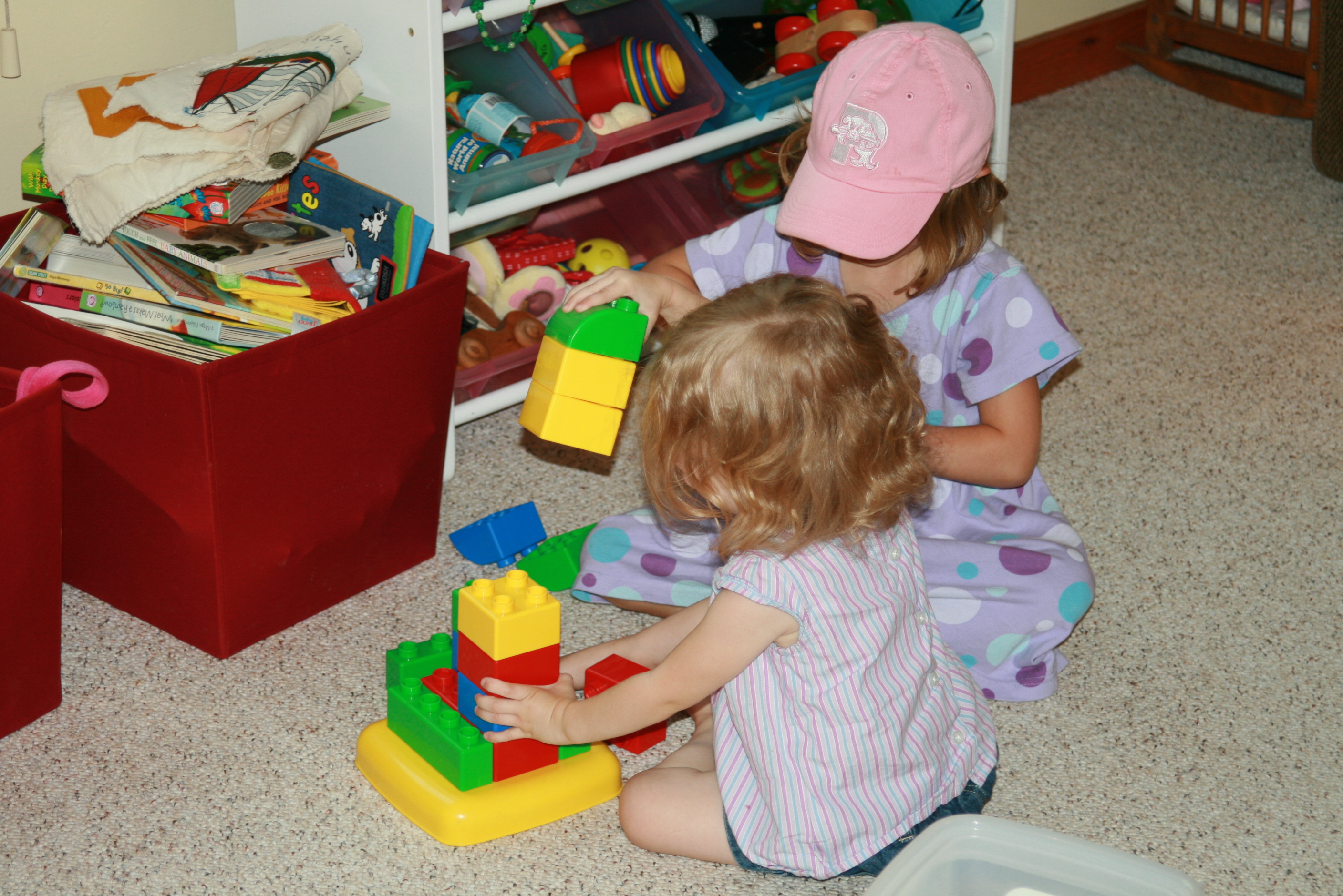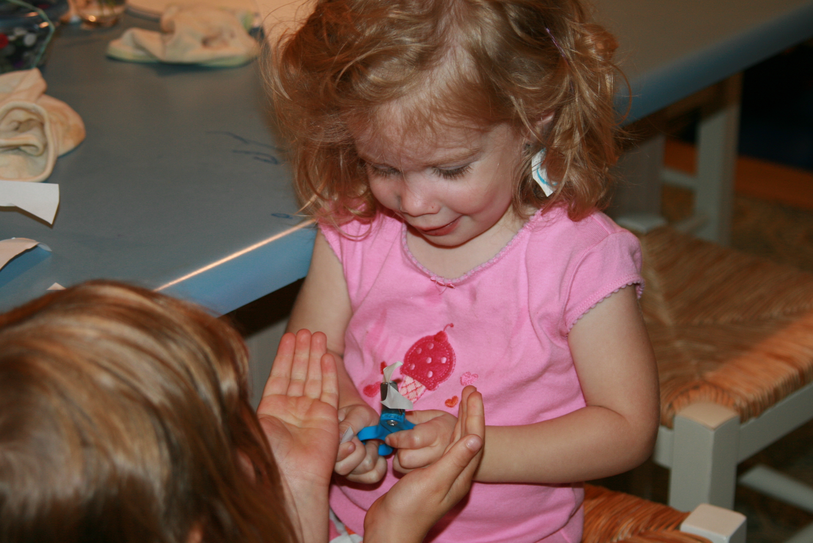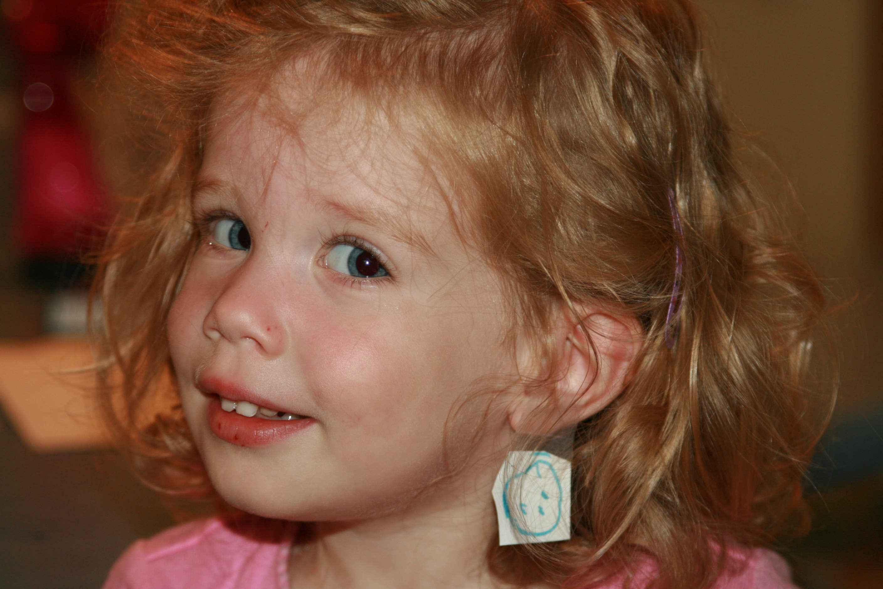Grace has been very good to her little sister lately. I think she genuinely enjoys her company, but most of all, I think she likes feeling like a big kid when she teaches Tess how to do things, like use scissors or ride her tricycle. And of course, Tess wants to do whatever her big sister does, even if it means wearing “earrings” scotch-taped to her ears. Those two are building their own little loving relationship – and it’s very sweet to watch.