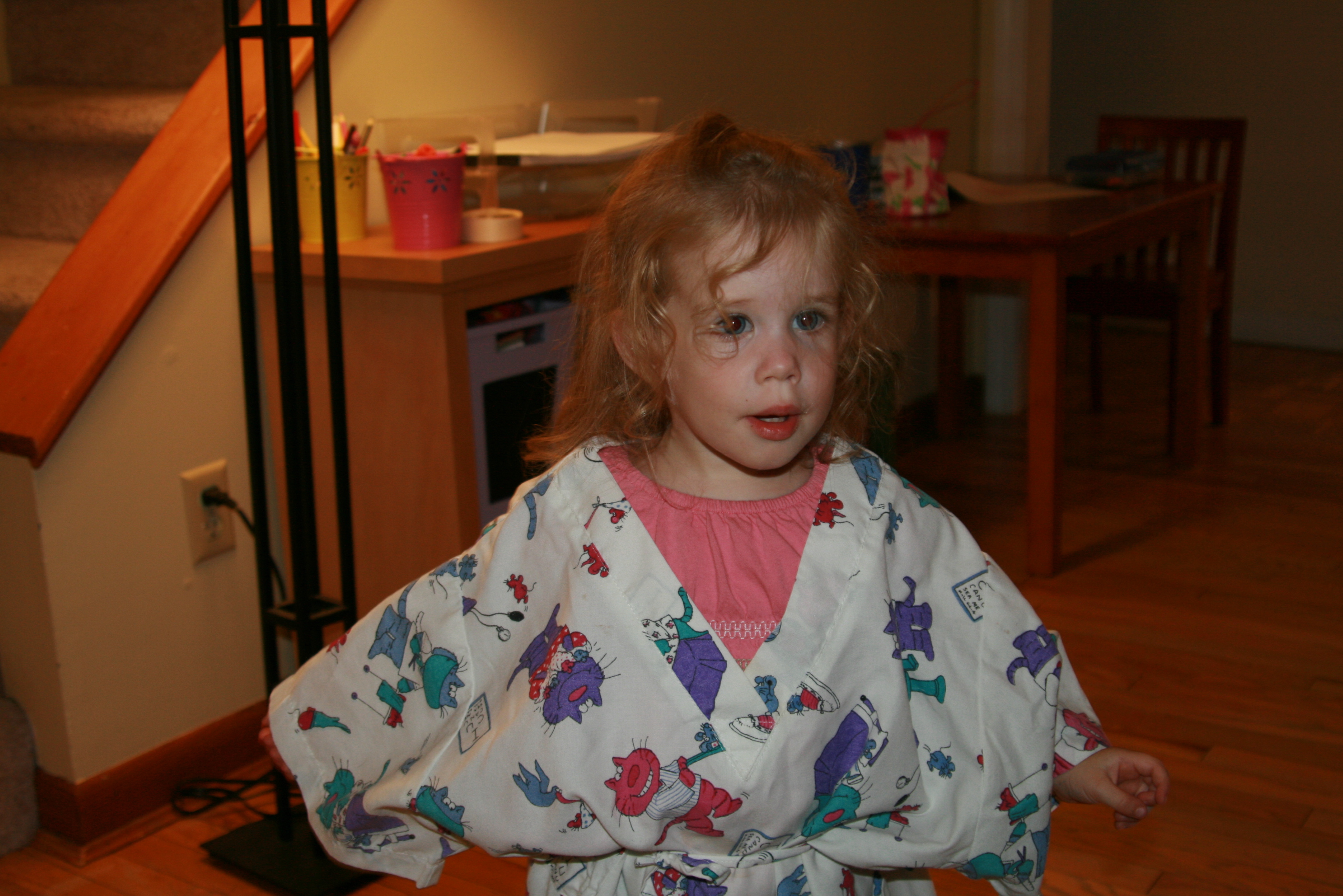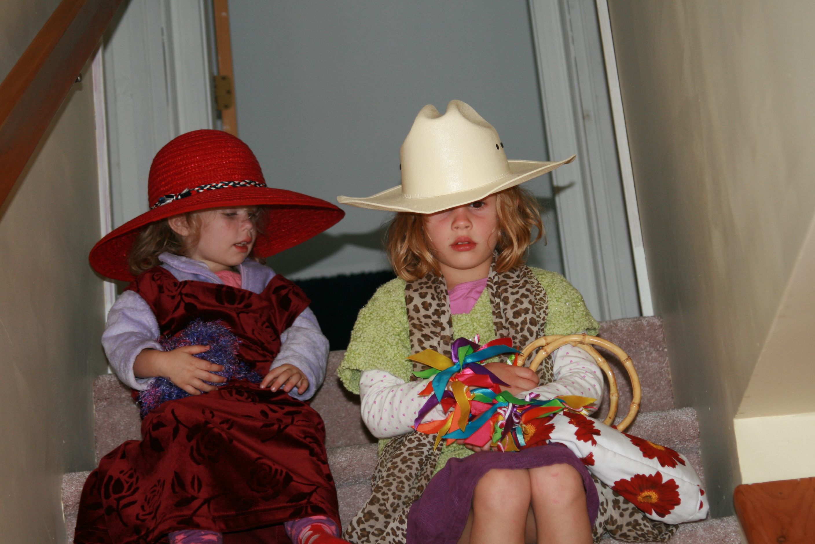 This afternoon, while I was preparing dinner, Grace and Tess played very nicely together. They got dressed up — Grace was a very flamboyant cowgirl, and Tess wore an evening gown, which she proceeded to trip over several times (hence the alternate outfit seen below). Then, each kid did a song-and-dance routine for me. They even pulled a chair to the exact spot from which I was to view the performances. Adorable. Perhaps I should buy a piano so I can accompany them — that would make winter afternoons a lot more interesting.