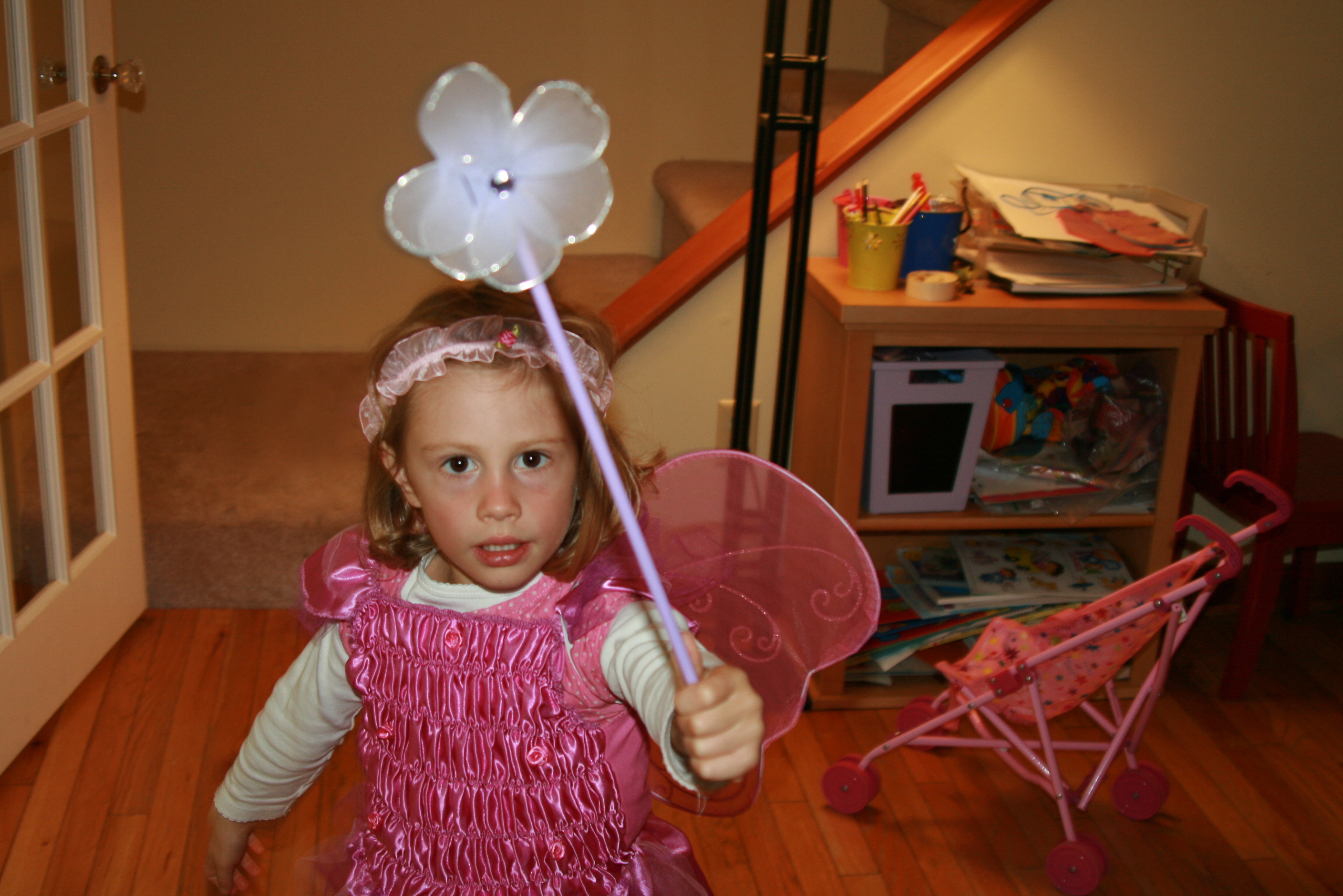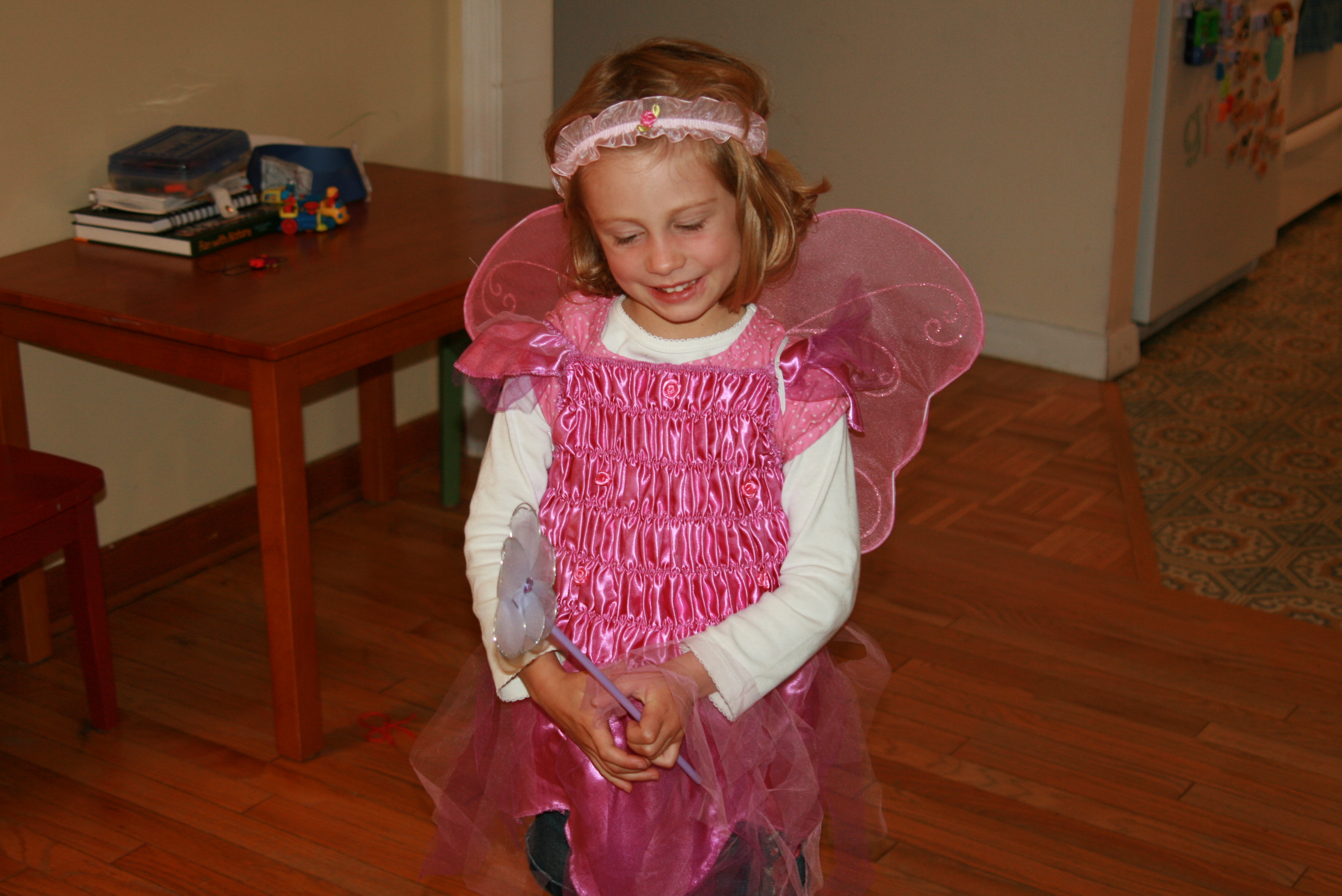 Every time Grace has come home from her friend Elyse's house lately, she has asked me why Elyse's bedroom is so much more fun than hers. Clearly it is because Elyse has a frilly, girly dress-up kit in her room, complete with fairy wings and magic wands. Of course, I would love for Grace and her friends to play quietly in her room for many minutes at a time without adult intervention — so I got her a fairy dress-up kit, too. Needless to say, she likes it.