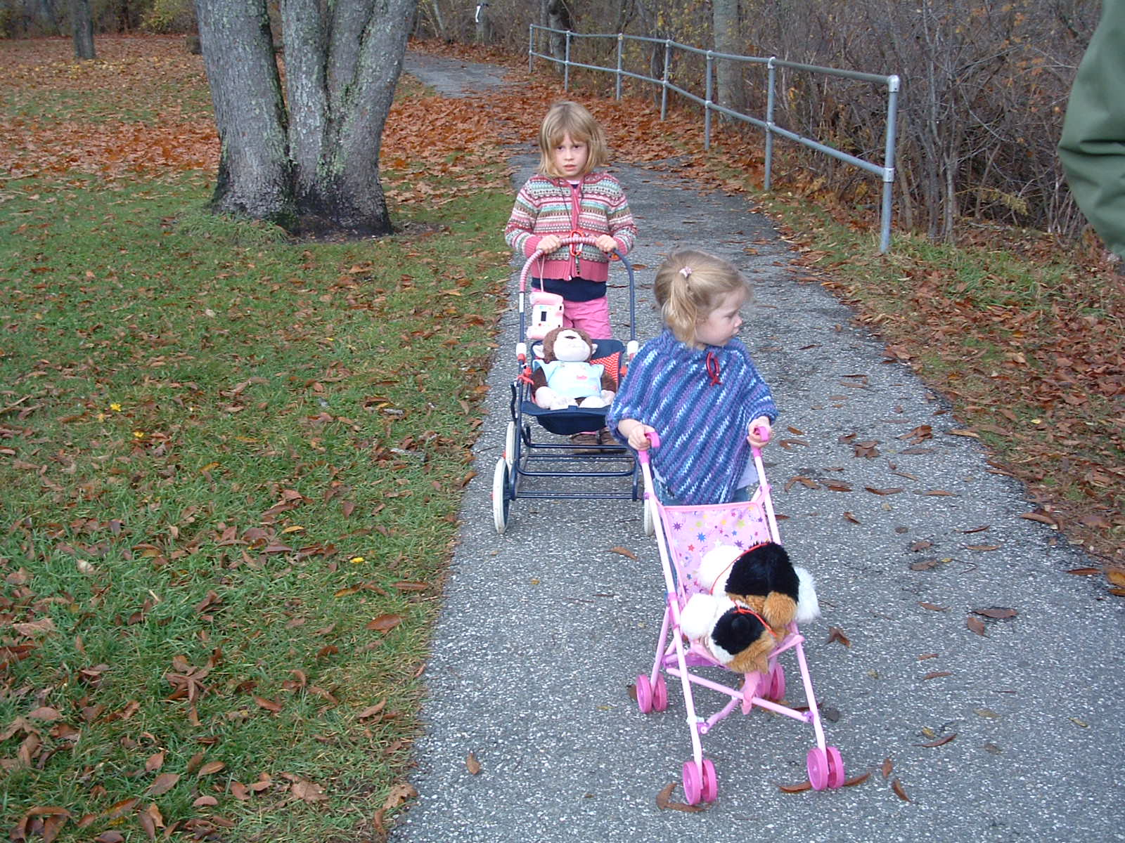 Our walk the other day started out so lovely — the girls had asked to push their strollers, each with their current favorite animal "daughter" along for the ride. The novelty of this was enough to make Tess walk eagerly along the path, instead of asking to be carried.