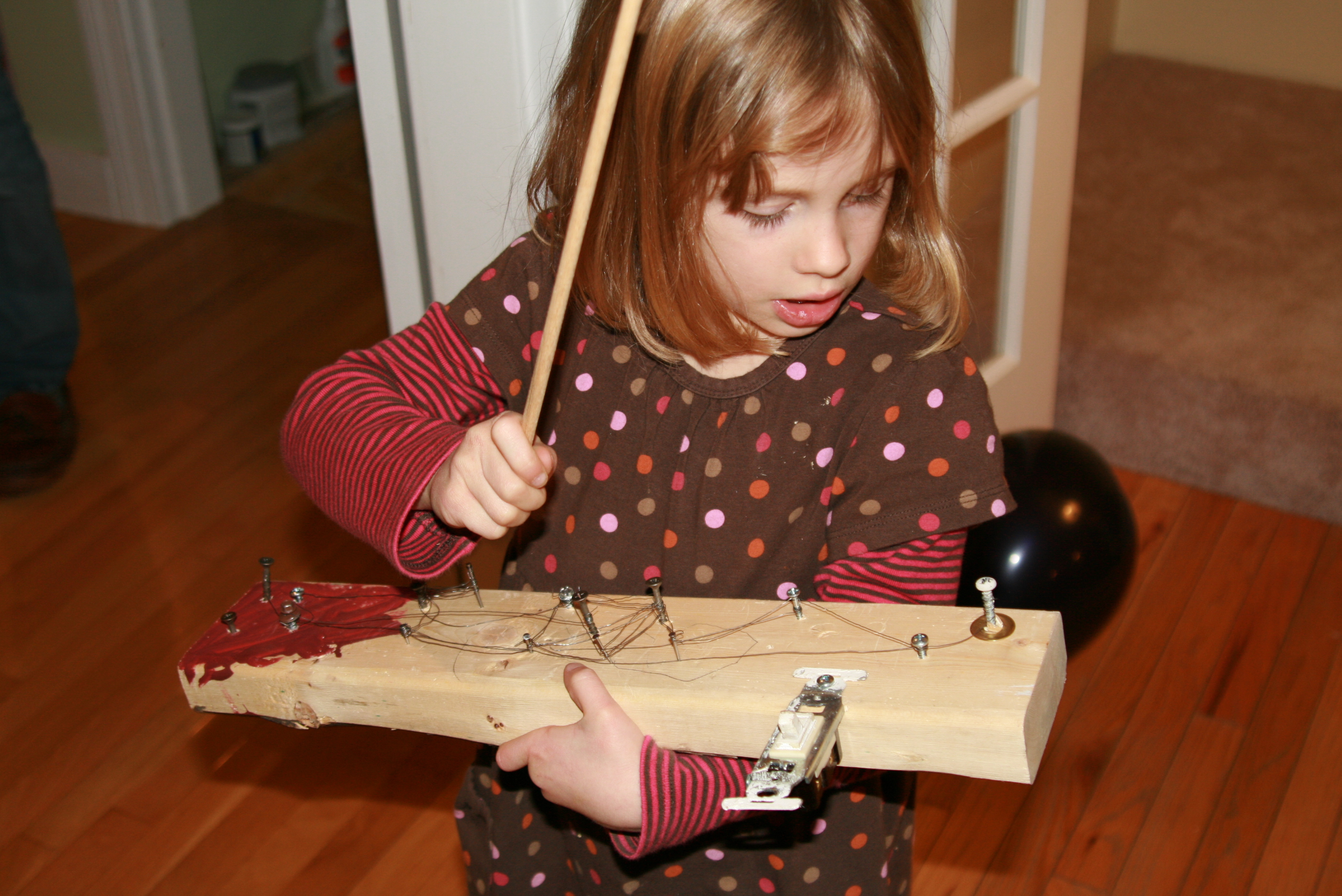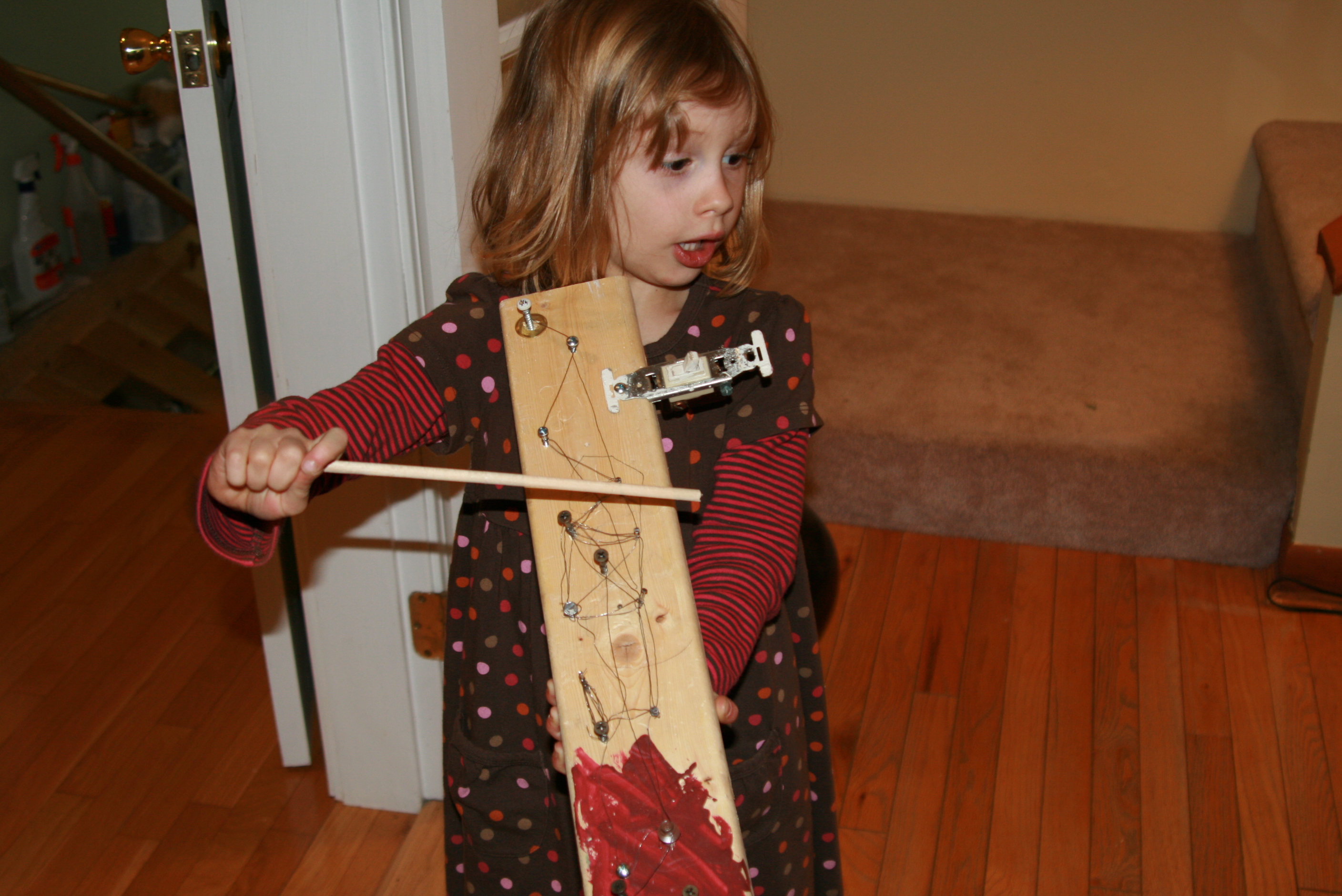 The design of this one-of-a-kind instrument began several weeks ago when Adam let Grace hammer some nails into a piece of wood while he was working on the chicken coop. Shortly thereafter, she let herself into the basement, opened a can of red paint, and started painting it before I realized where she was and what she was doing — yikes! Next, with supervision, Grace added some wire, a few screws, and of course, a lightswitch. And now for Christmas, she would like her own toolbox. I can't even begin to imagine what she might create, but I do know that she can no longer reach the paint.