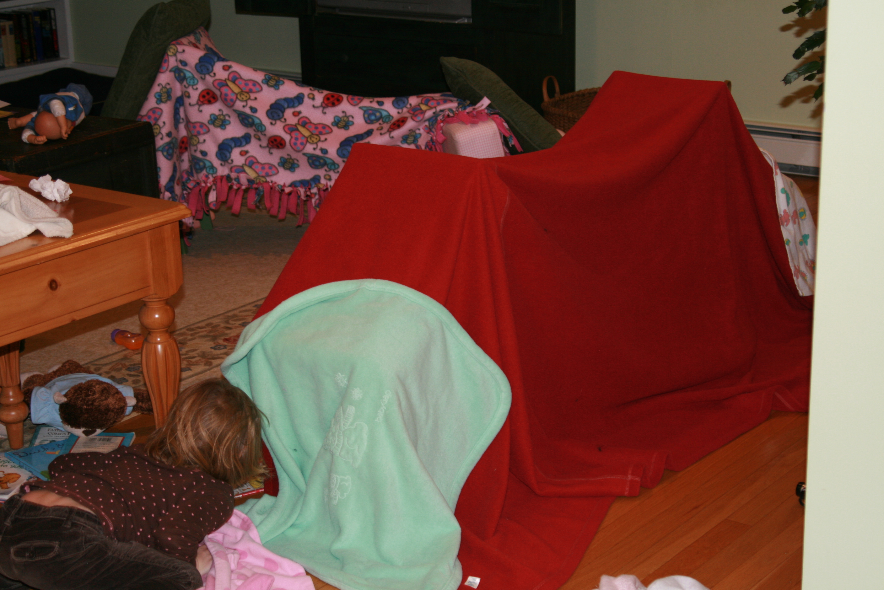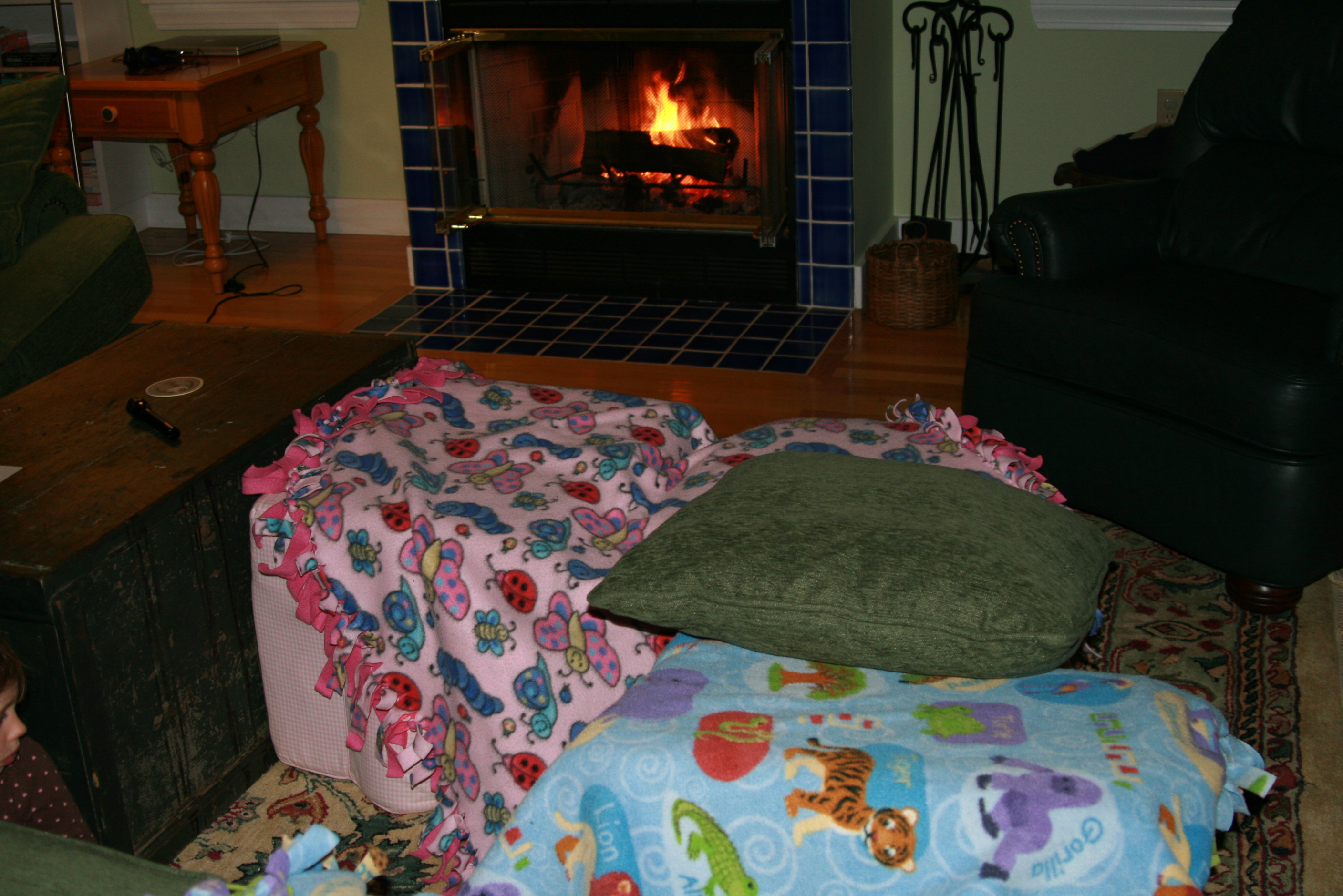 We recently started a new Sunday evening tradition around here — a nice fire in the fireplace, and some fort building nearby. The girls like to cover their little chairs with blankets, and then hang out underneath with flashlights, books and animal friends. While this is going on, Adam tries to take in some football, and I make soup (tonight, potato leek) and bread (wheat honey oat). Creating this warm, cozy space makes the long, mid-winter evenings seem a little less… long.