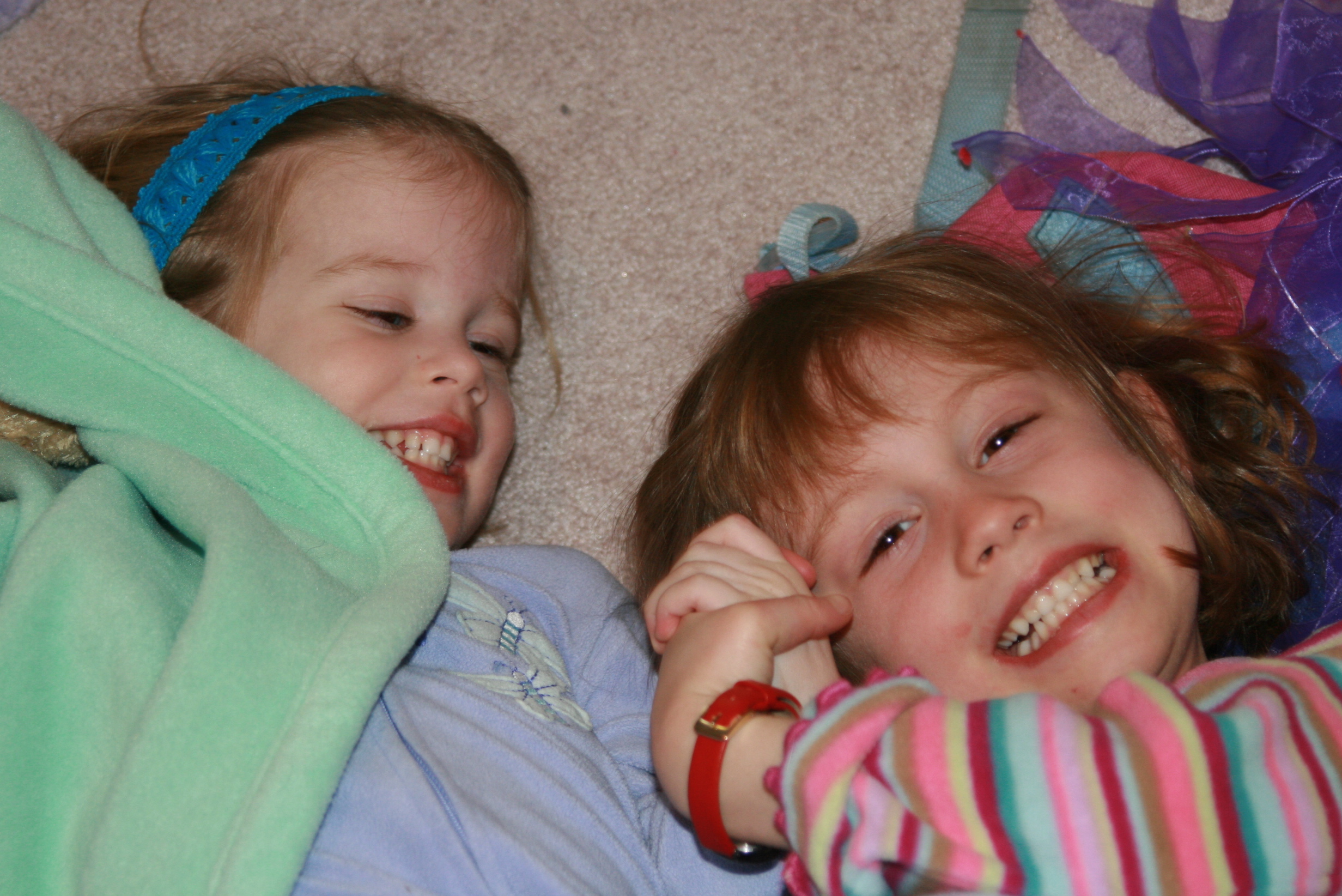 This is February vacation week, when most lucky Mainers head to Florida for some sun — to re-energize in order to be able to survive the rest of this long winter. Then there are those of us sorry souls who are stuck at home, desperately looking forward to a vacation at another time. Most kids' activities (dance/music classes, library story times, etc.) are cancelled for the week, and we're forced to entertain our children with few options — and limited outside, running-around time due to the massive amounts of snow and cold, gray weather. While these days can be a bit long and stressful for me, they provide the girls with quite a bit of playtime together. Mostly, this goes well, and I am grateful that they have each other for entertainment. I am constantly amazed by Grace's ability to come up with creative things to do — today they took their animal friends to the "park" and yesterday they made musical instruments for family band time (see the water-bottle-and-button shakers and rubber-band guitar below). Grace is generally very sweet to her sister, and truly enjoys teaching Tess things and recruiting her to take part in imaginary scenarios. And I admire Tess's ability to enthusiastically play along without question, and to put up with Grace's crazy energy. What scares me a little, though — when it's not making me laugh — is the fact they are starting to plot against me, by holding tightly onto each other in a civil disobedience kind of way, when I interrupt their fun for terrible things like getting dressed (see first and last photos).