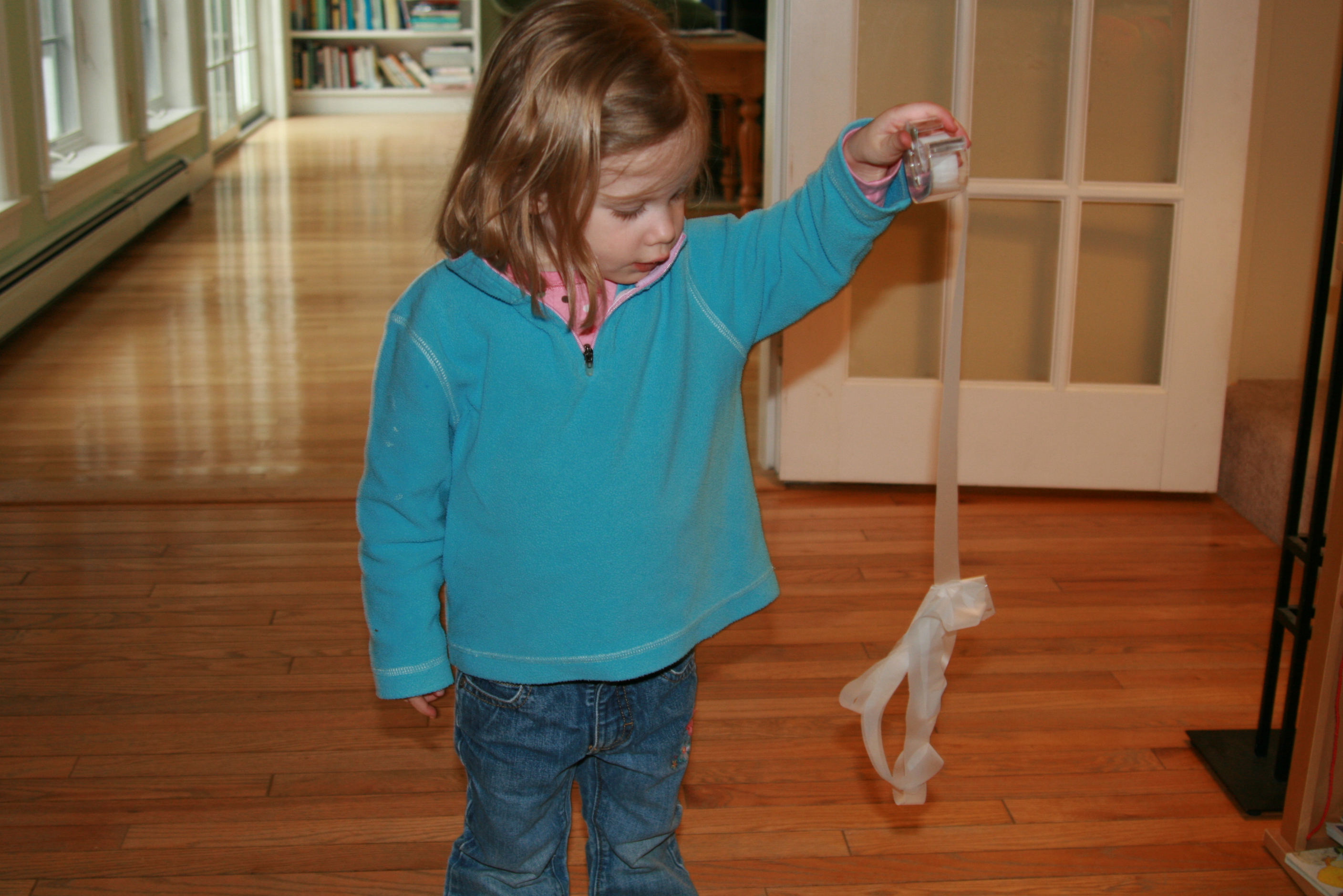 "Mommy, I need your help!" Tess cried. She clearly has not yet developed her sister's finely honed Scotch-tape skills. Until she does (and I'm sure she will), I think it would be best for everyone if I put it out of her reach. I already spend enough money on that stuff.