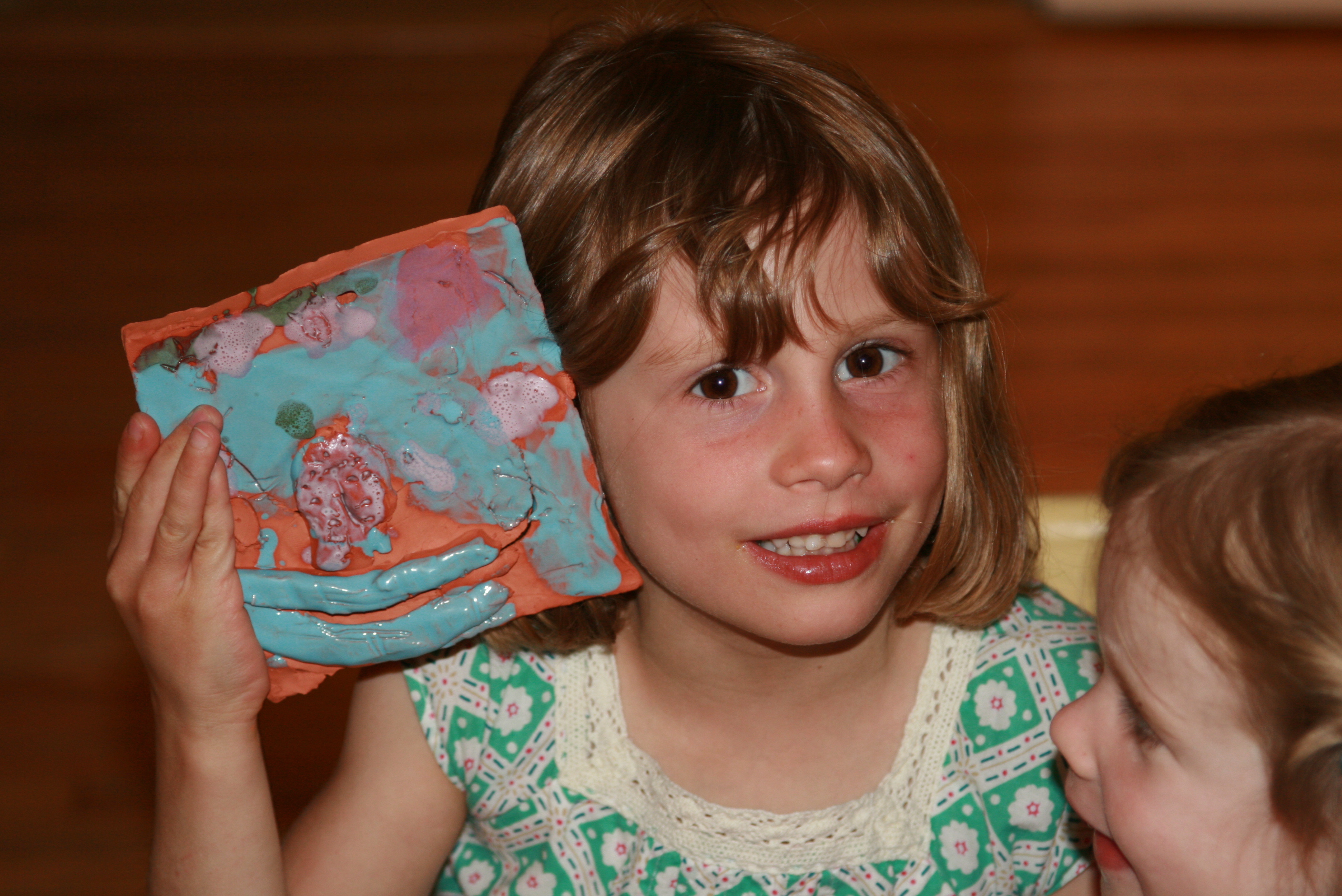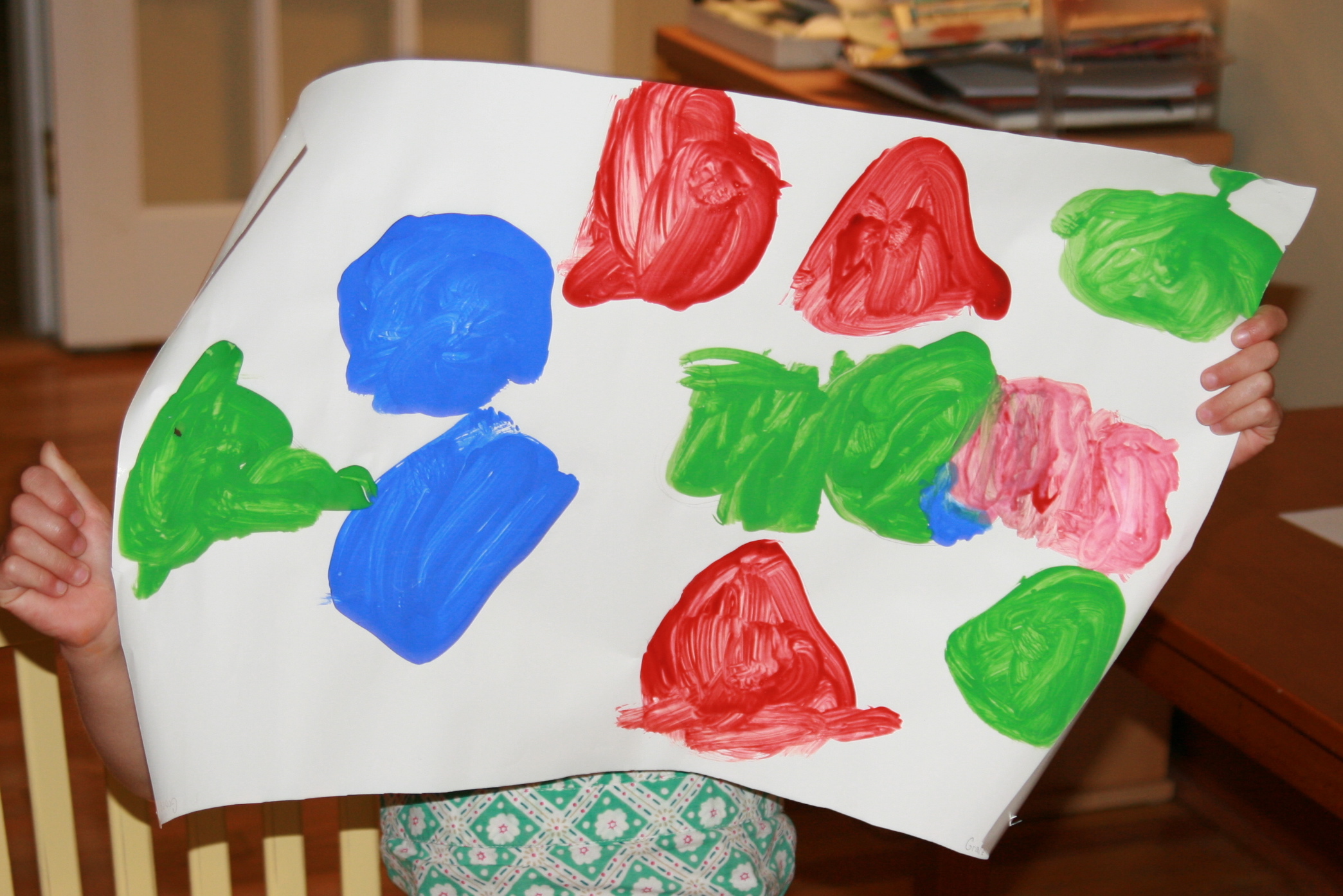 I'm not sure exactly why, but I just love it when our kid brings home things she's created at school. Perhaps it's because I very distinctly remember bringing home my own creations (usually misshapen clay dogs), which my parents also proudly displayed. Or maybe it's because I love listening to Grace explain exactly how she made something, or exactly what it represents. Maybe I just love the twinkle in her eye as we oooh and aaah over her art. At any rate, Adam's going to have to find a new place for his first editions — I'm clearing off some shelves for a permanent display of our children's masterpieces.