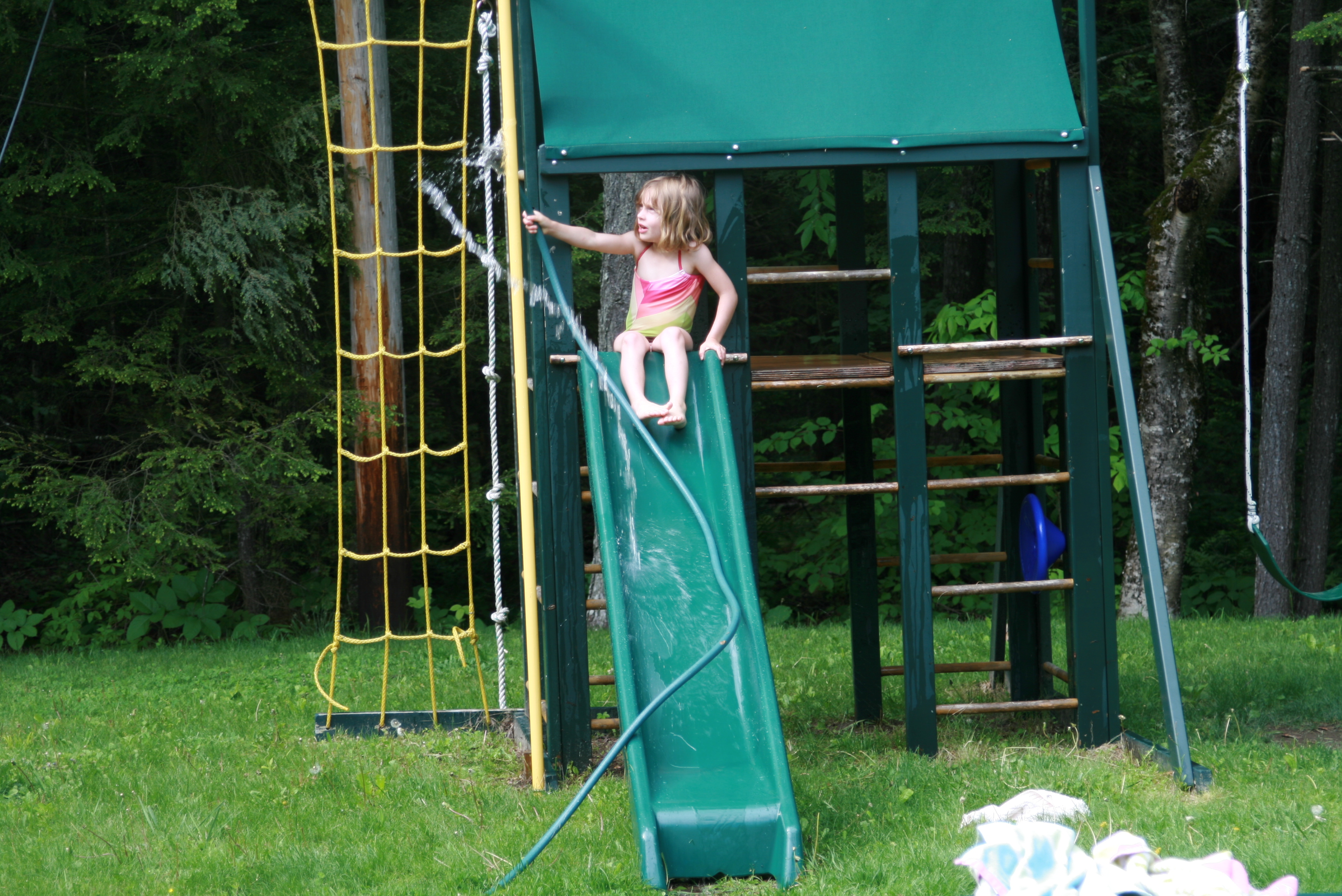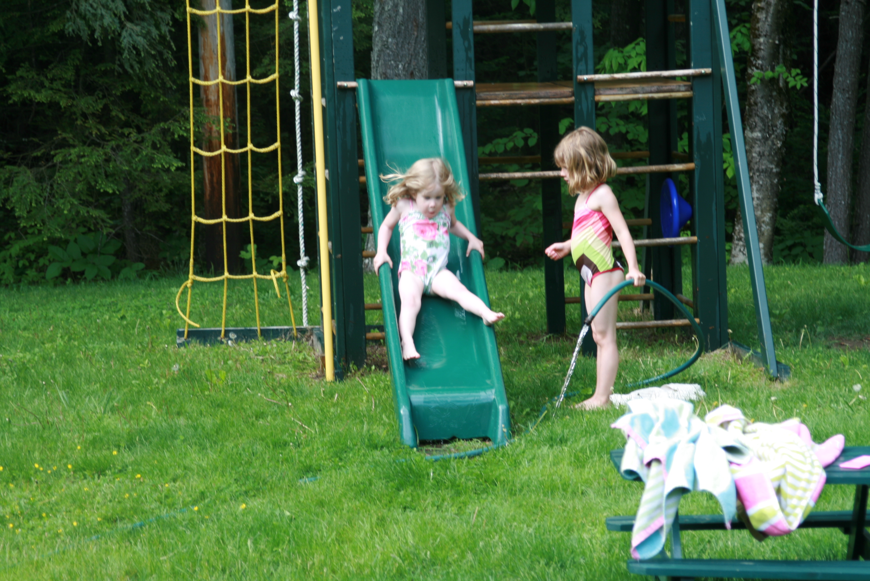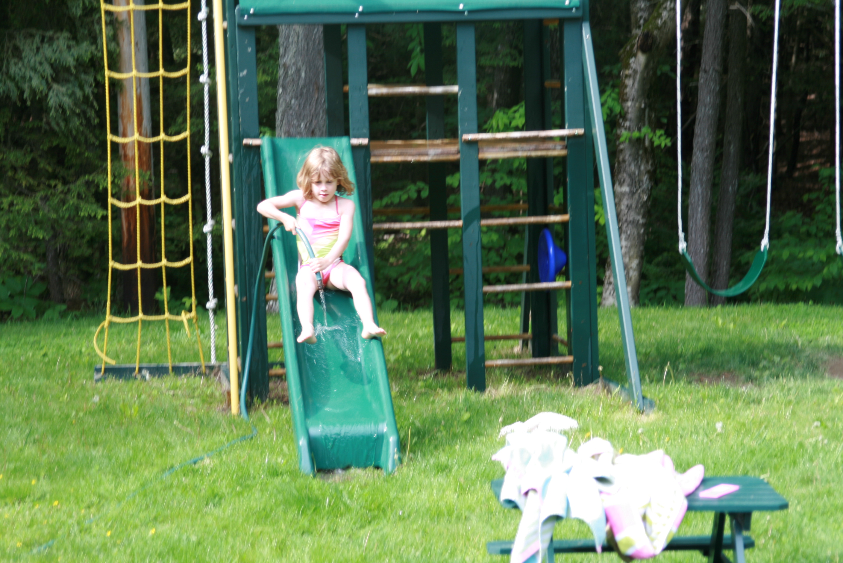 Today, we were playing outside in the beautiful weather when Grace announced that she and Tess were going inside to the bathroom. They emerged a few minutes later with their swimsuits on, carrying their beach towels. Grace then turned on the hose and dragged it over to the swingset, creating her own water slide. Hilarious. Tess took a few turns, too, landing on her bottom with a big splat, and a big smile. Unfortunately, this fun didn't last for too long, since it was only 68 degrees, and the water from the well is cold. But I love the fact the girls can come up with their own fun plan, and execute it themselves. June is going to be good.