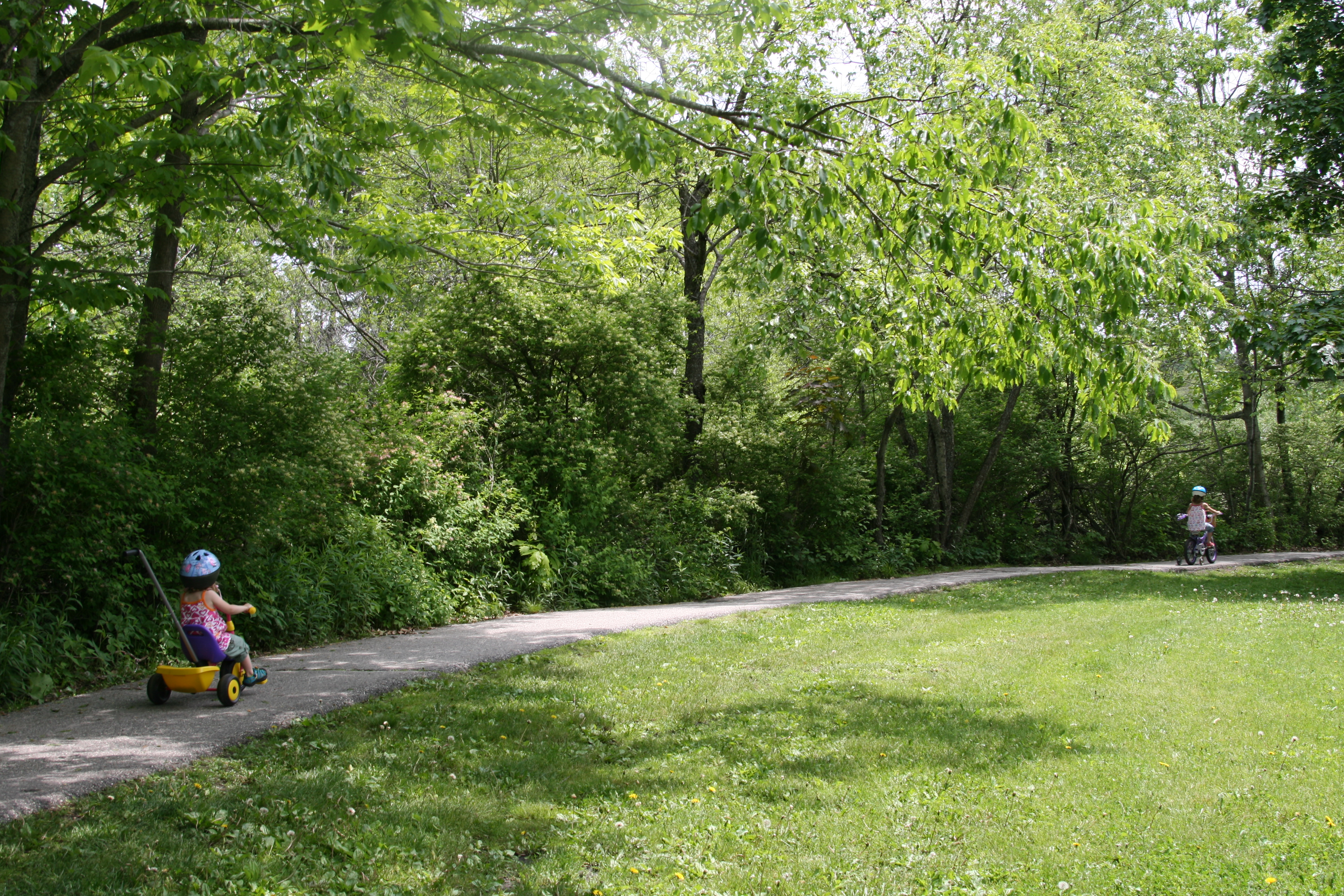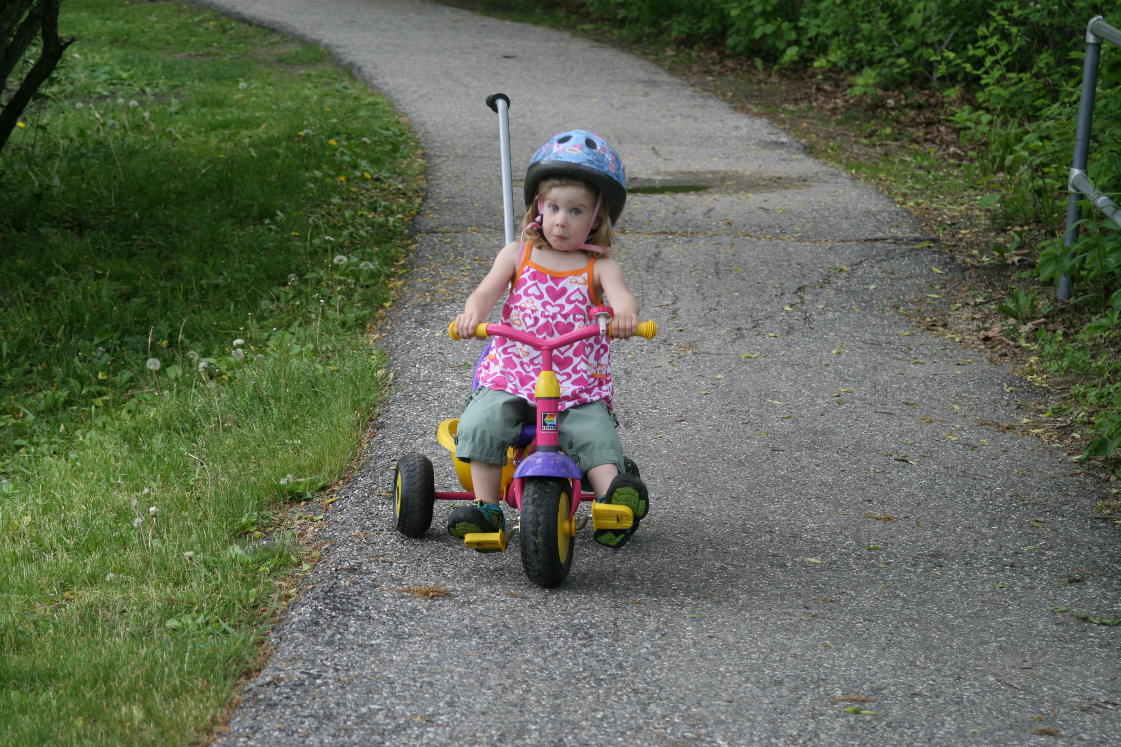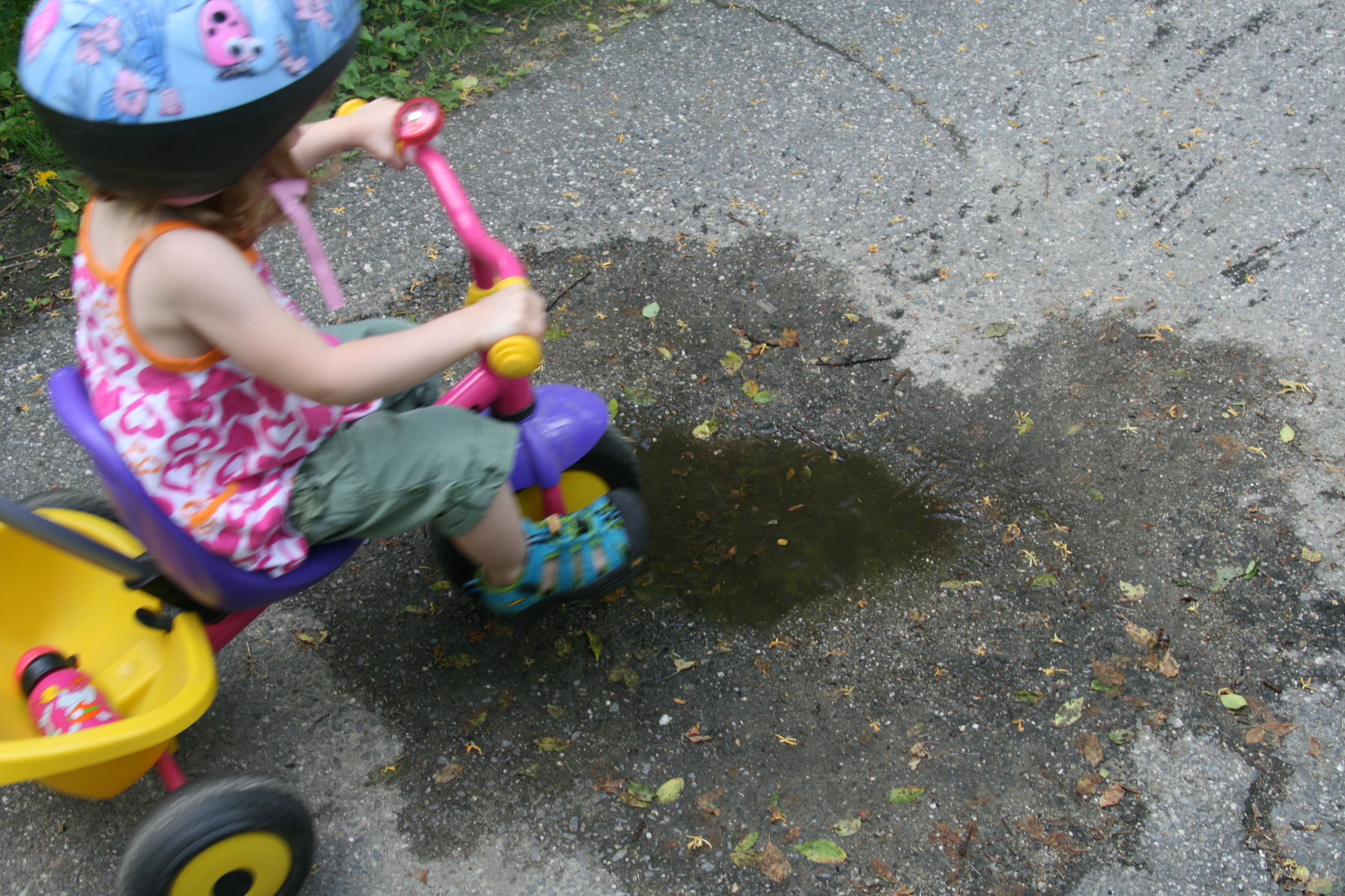 Tess wants to keep up with her big sister, so she has suddenly taken an interest in her tricycle. Now she can pedal around all by herself! Of course, this means following her sister right through the middle of puddles. And when she can't keep up anymore, she just ditches her trike and runs!