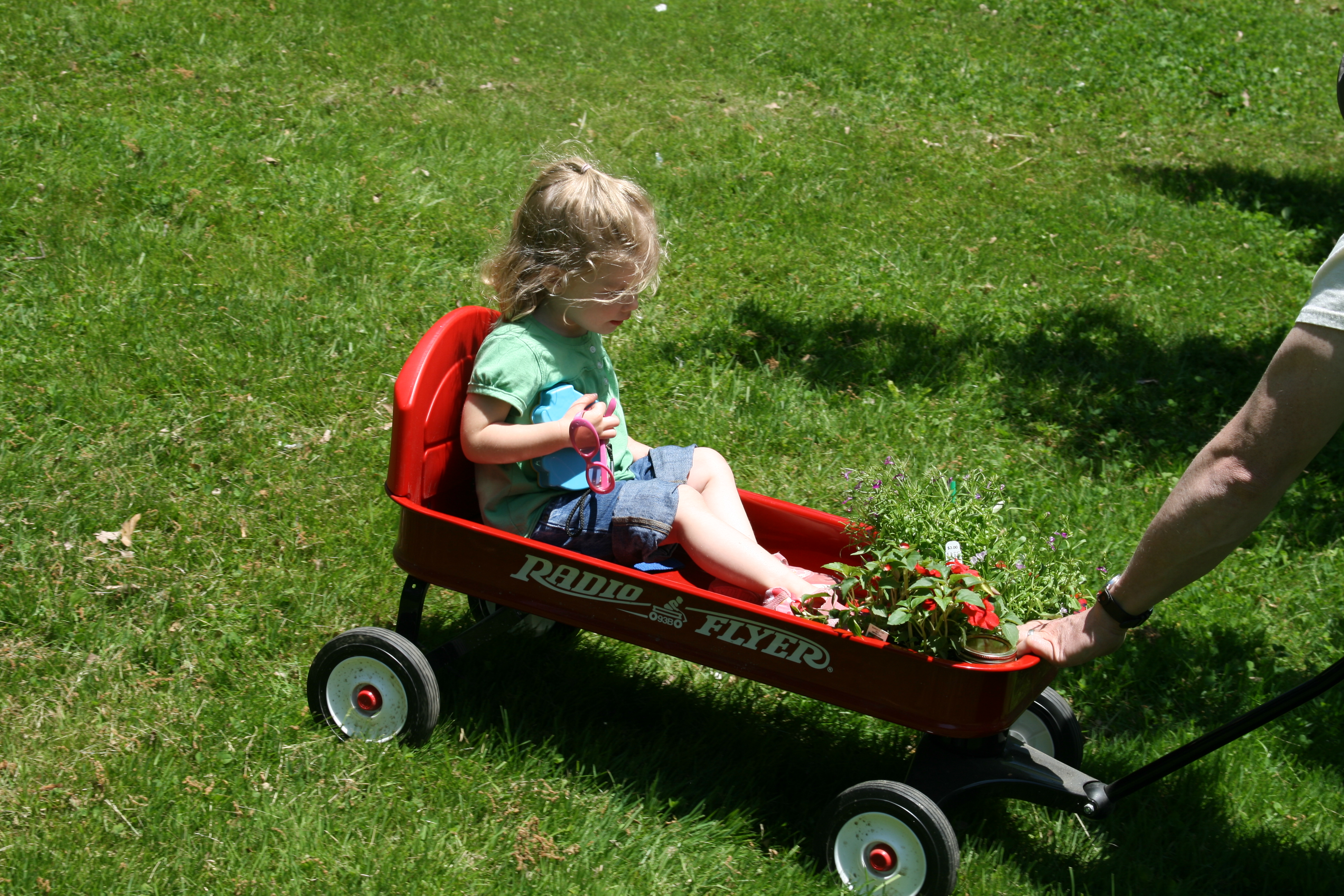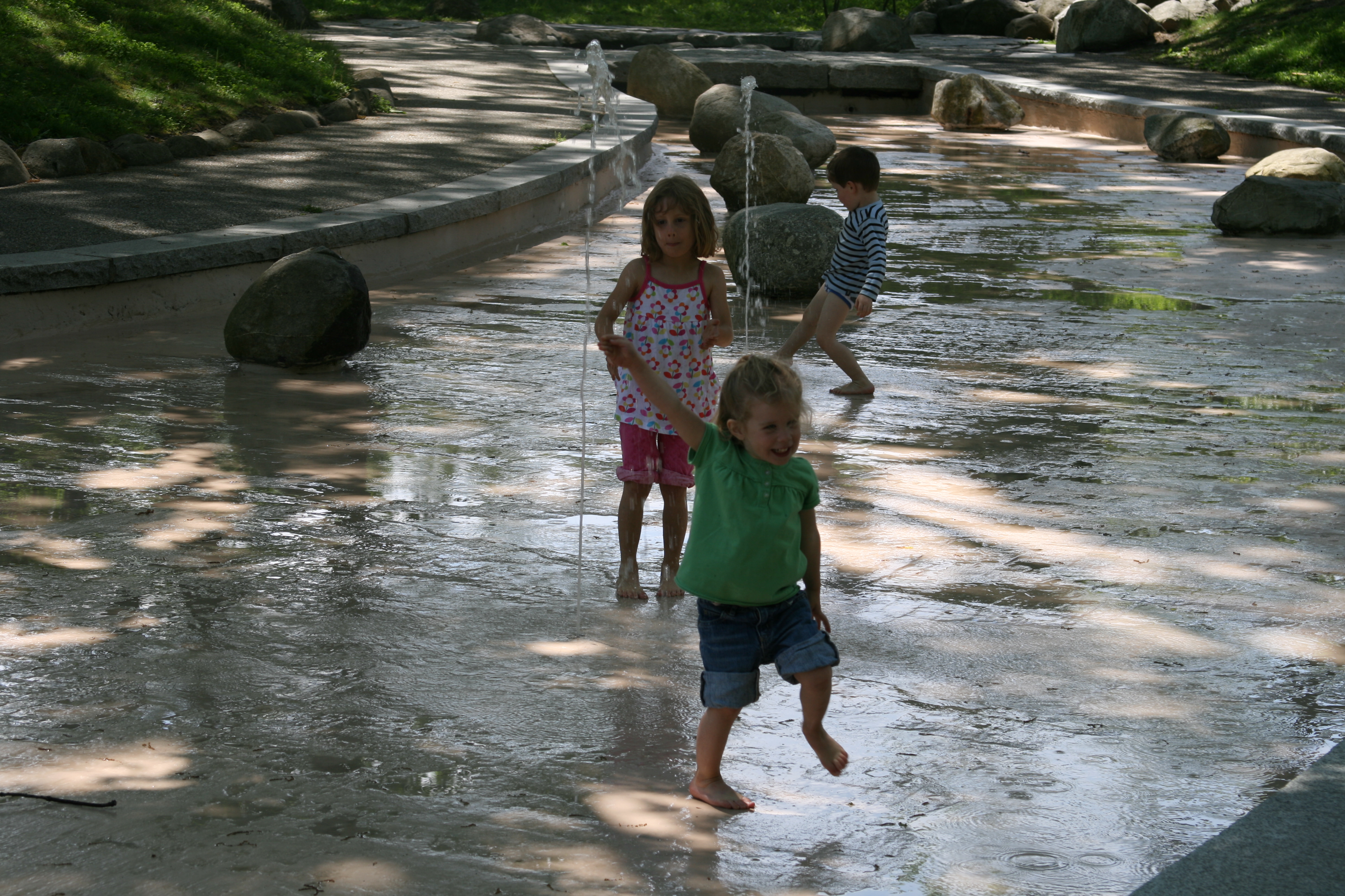 On Saturday we visited the Portland farmer's market for the first time this season. I had forgotten just how fun — and beautiful — the market is. We shopped for annuals, ran into several friends, and played in the water fountain. Right now, there's very little water in the fountain, and there are a few places where water shoots up every so often. Grace stood right on top of them, blocking the water with her foot and getting pretty wet in the process. Tess, on the other hand, didn't really want to get wet, but loved the excitement of playing near the little geysers. In fact, she was so thrilled by this that she was moved to perform a 'donkey kick.' I guess we'll have to visit the farmer's market more often.