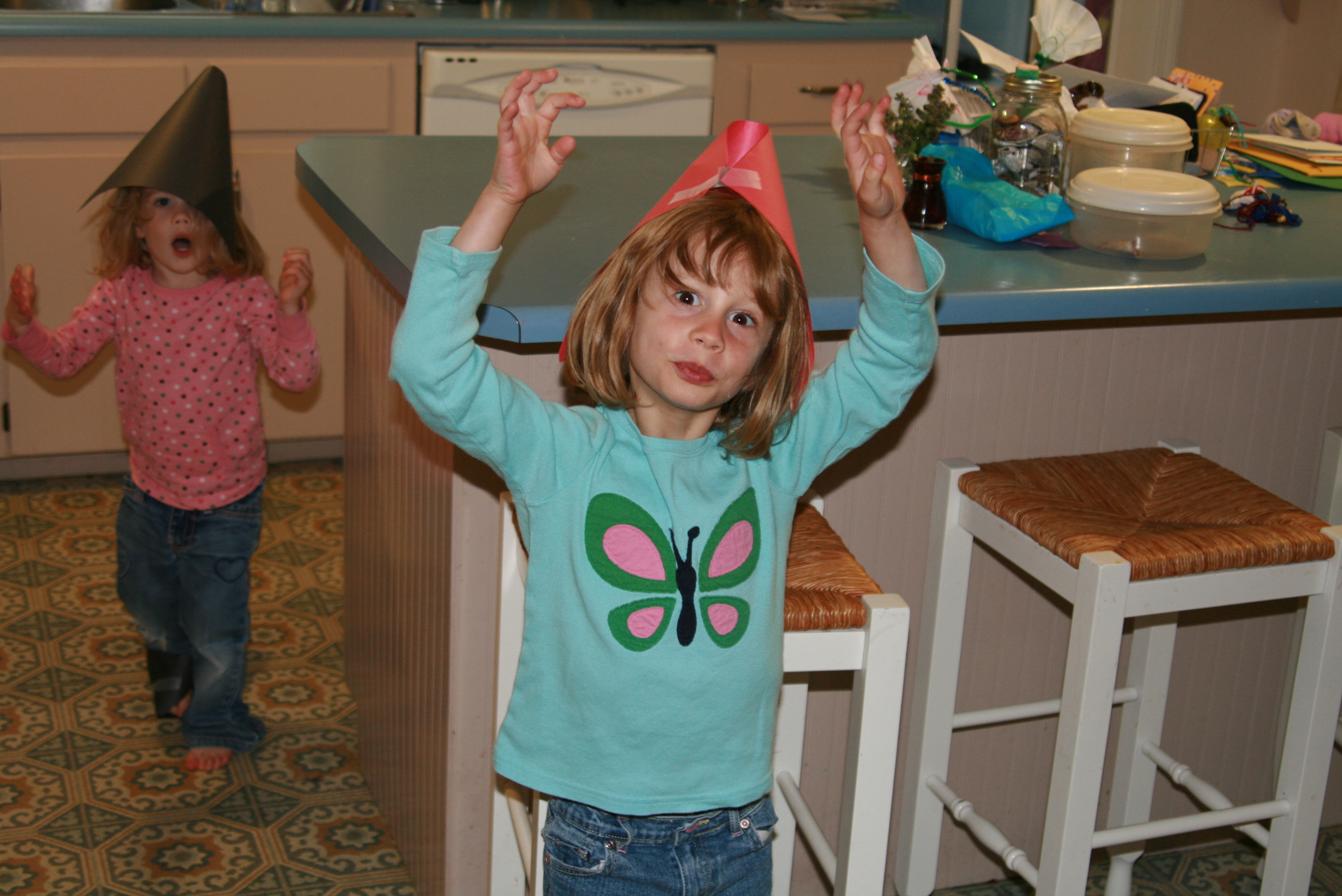 I didn't know that robots like to wear pointy hats and hold their arms up. Our two little crazies teach me something new every day. Not necessarily useful, but definitely new.