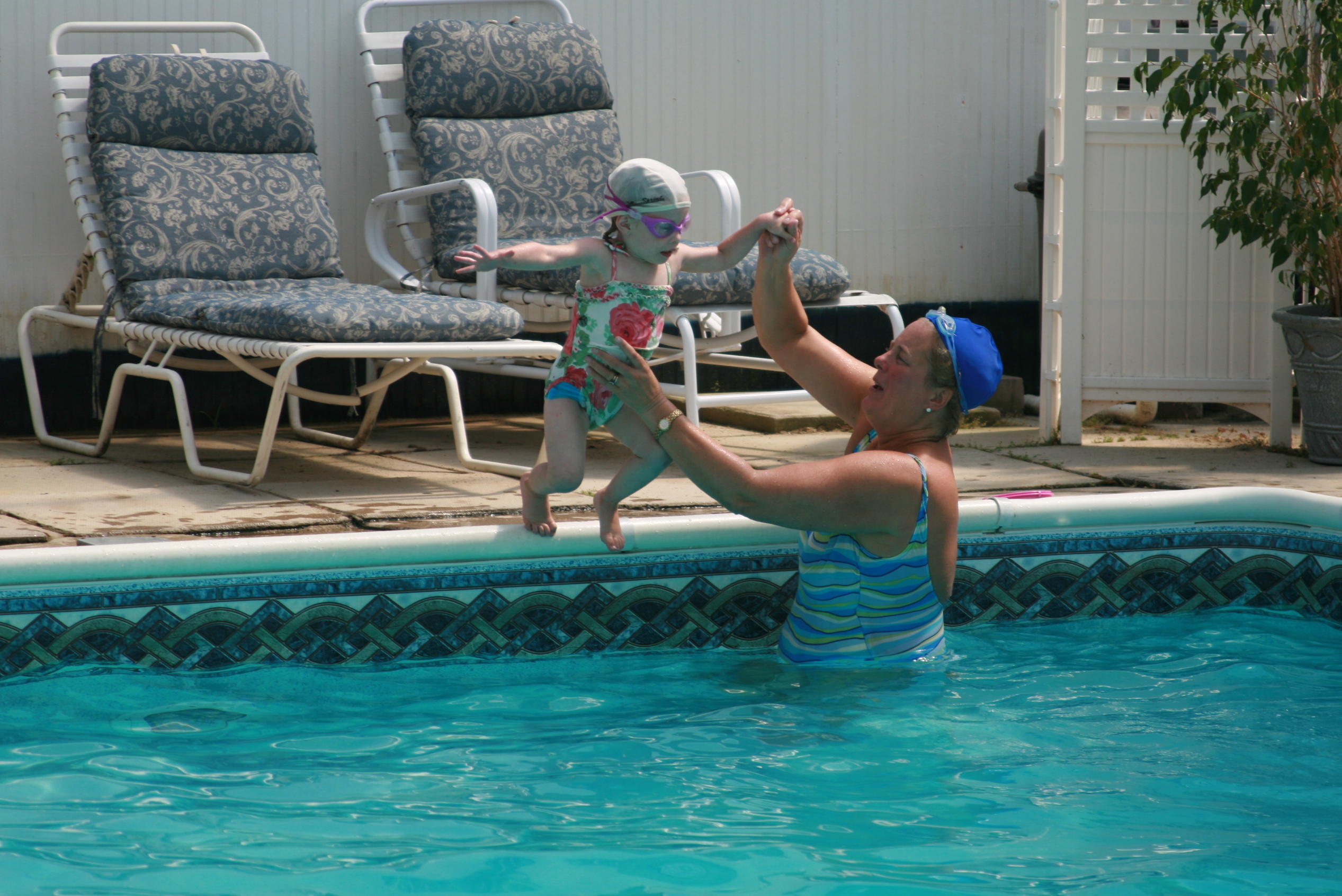 Tess is progressing well with her swimming lessons. She only wears the floatation belt for part of the class, and has become completely comfortable in the water. She jumps right in, disappears underwater for a few seconds, and then pops up with a huge grin on her face.