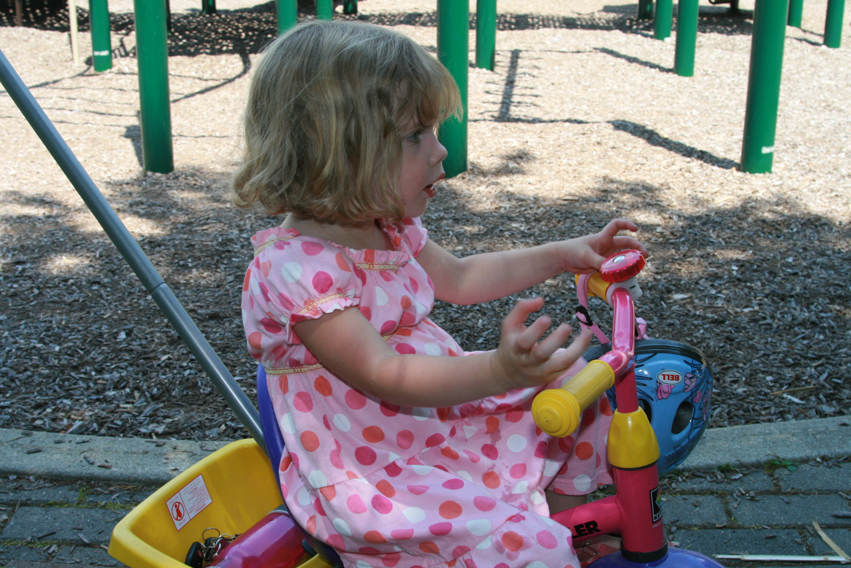 A few days ago, while Grace was otherwise engaged, Tess and I took her trike to the park per her request. She rode that thing around and around the playground, down the trails and back. It was as if we had brought a playmate with us — the trike even picked with paths we should take, and Tess sang happy little songs to it. Perhaps I need to start inviting real friends along to our playground outings — we don't want the poor child to think her trike is her only friend.