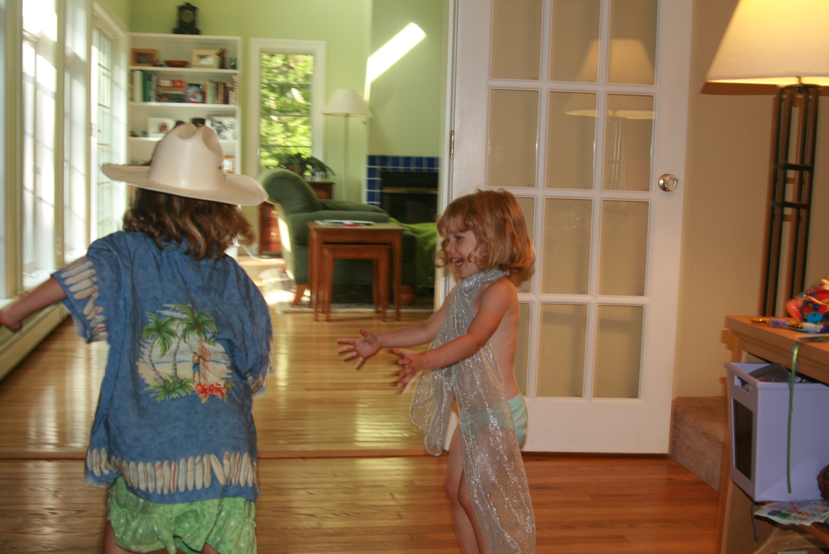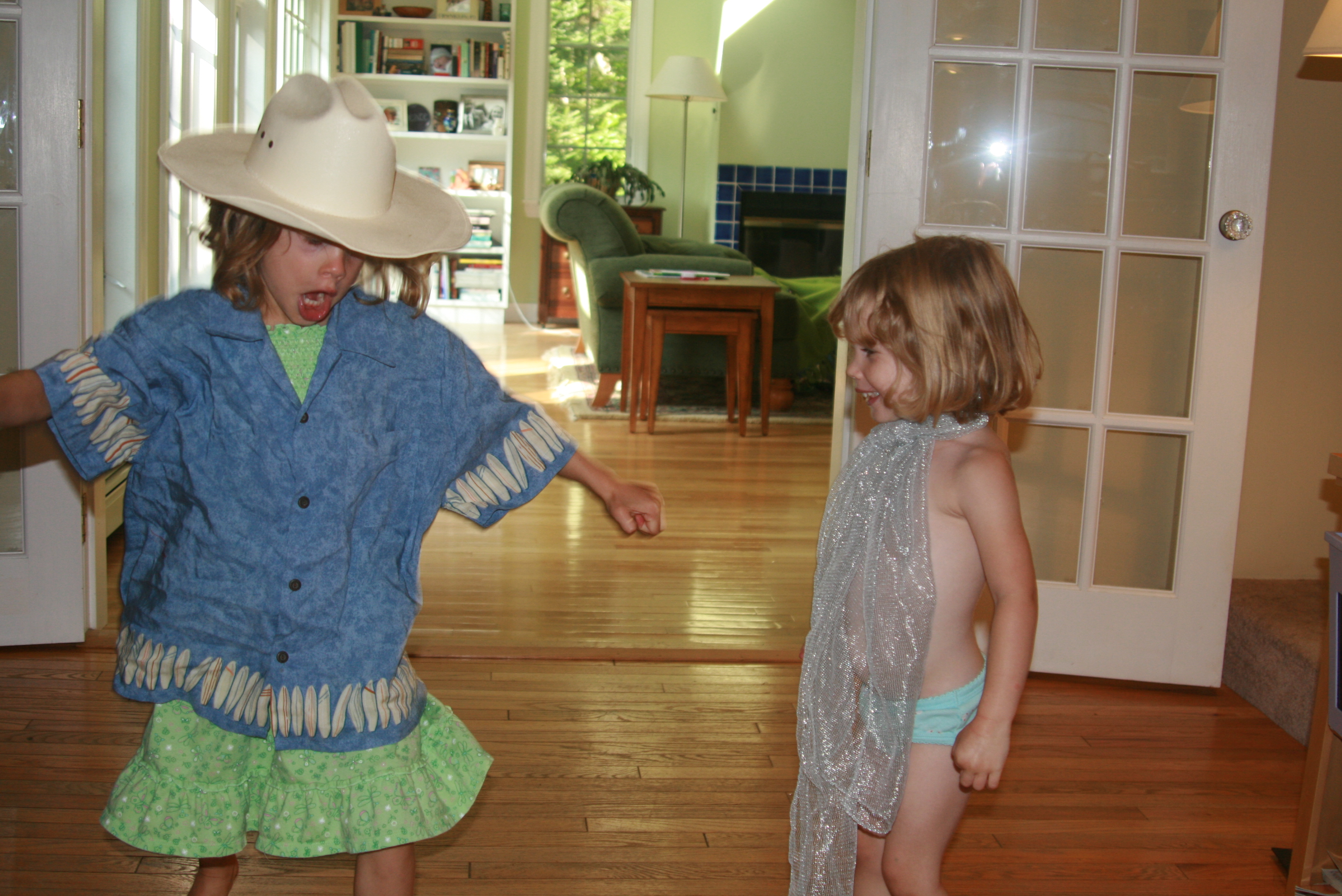 I love the creative costuming, with Tess as the shark — wearing only undies and a silver scarf. She was pretty convincing, too, gnashing her teeth and chasing after surfer Grace (who had surfboards on her shirt and was standing on a paper surfboard). I just didn't know that surfers like to wear cowboy hats.