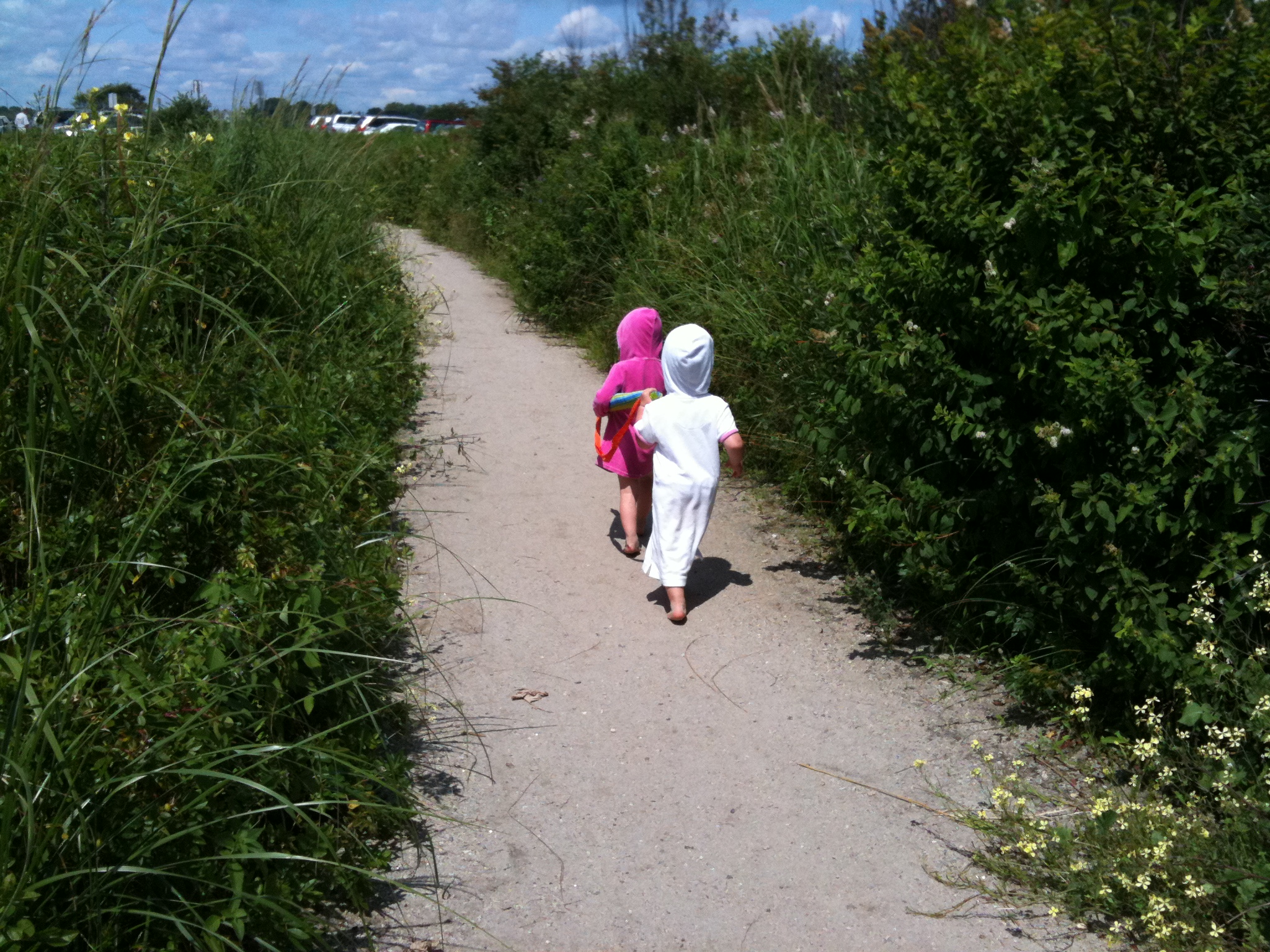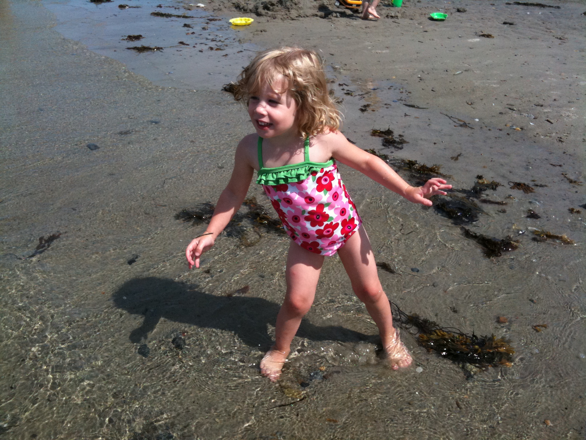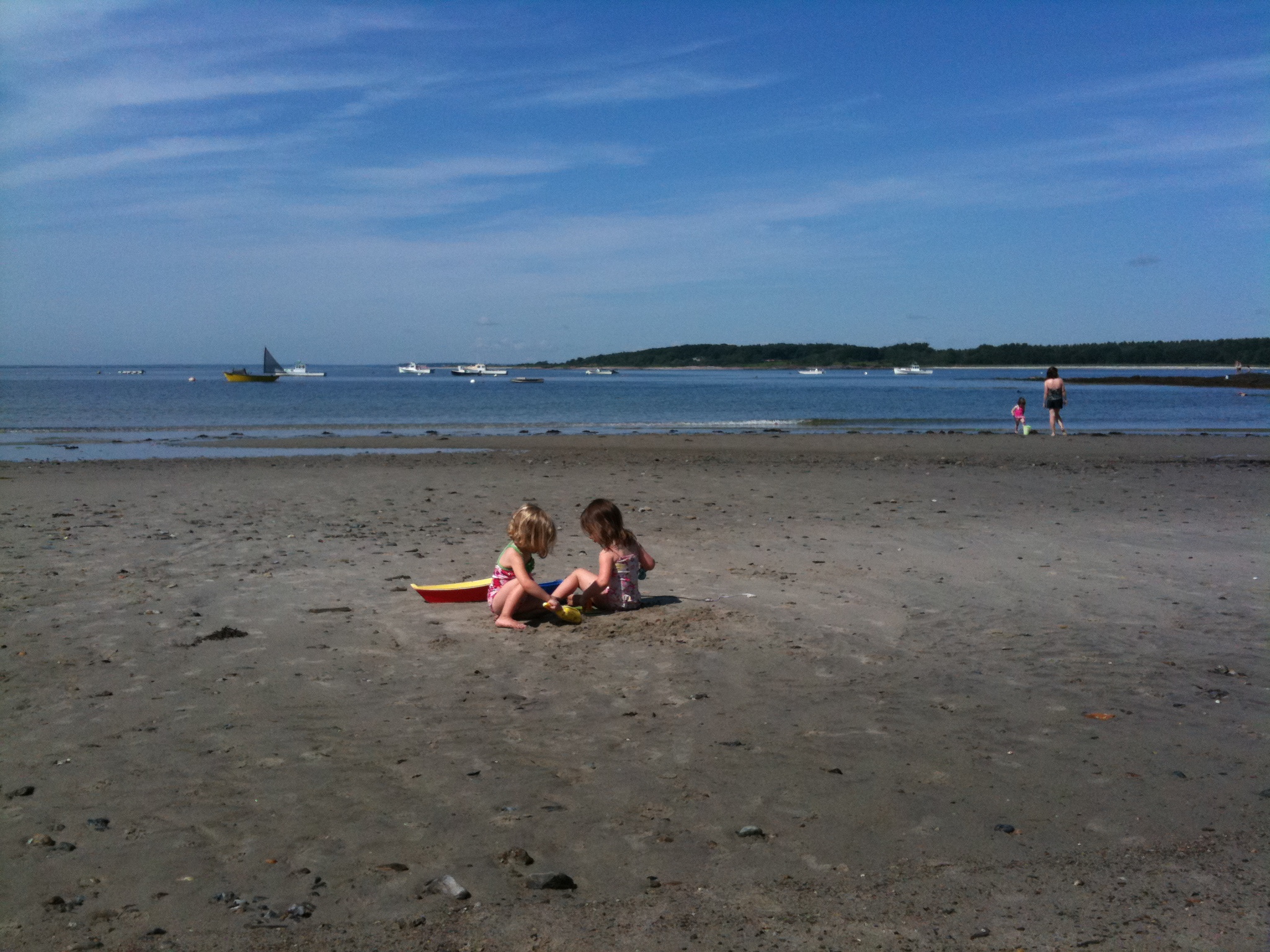 Today we went to the beach with a friend who has two girls the same age as my two girls. The two five-year olds played together the entire time: making a sand castle, swimming and wave-jumping, and concocting 'soup.' The two three-year olds were aware of each other's presence, but mostly played alone or followed the big girls. They did spend a few moments digging in the sand together, and as we walked to our cars at the end of the morning, they each carried one end of the beach umbrella — an idea they had all own their own. They even discussed their cooperation in a very grown-up fashion. It was adorable.