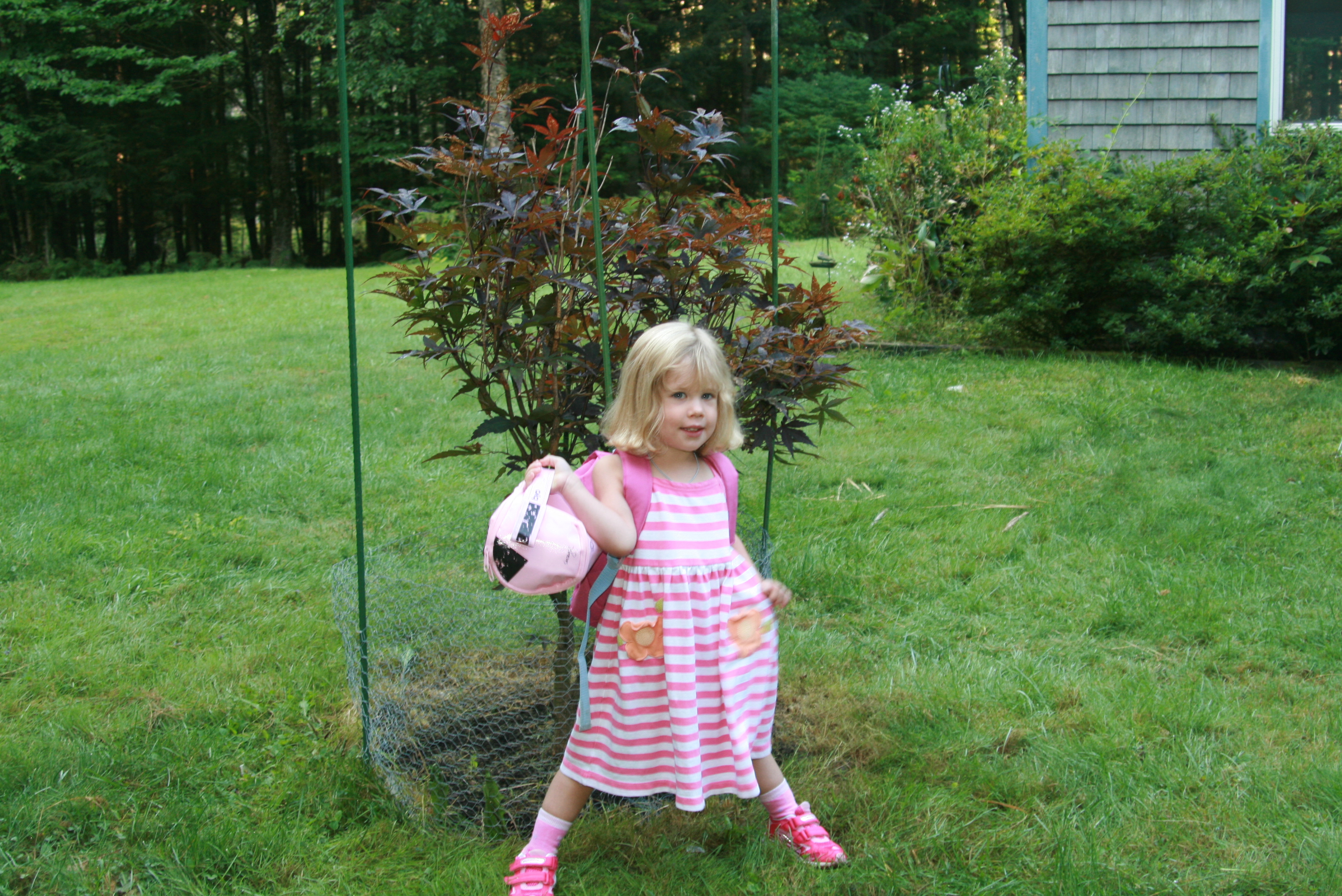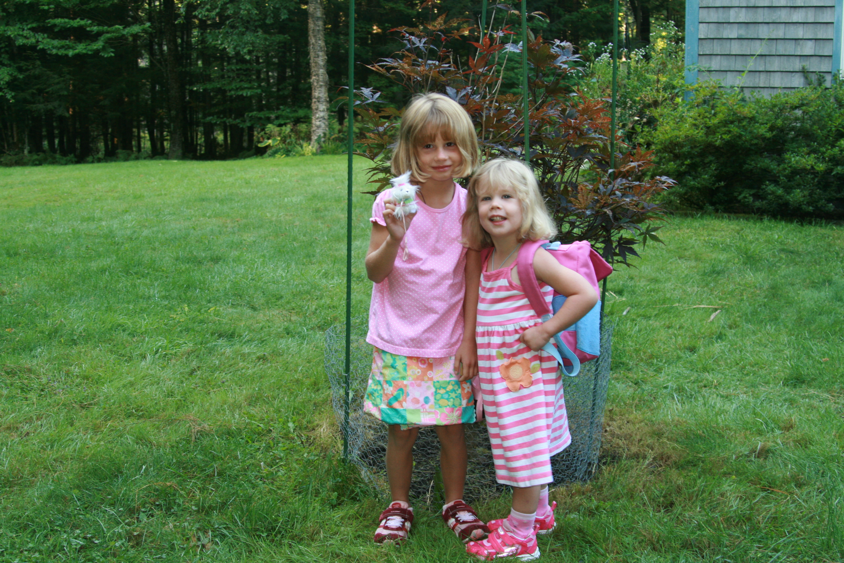 After we got both girls' cubbies set up at school, the four of us headed outside together to join the other kids. Tess's teacher pointed out that the preschoolers' name tags were hanging in some shrubbery, and asked her to find her own. Grace, who was an amazing big sister (and kindergartner!) today, immediately took Tess's hand and helped her find her name. When her teacher then announced it was time to head inside, Tess simply turned around, galloped up the hill, and grabbed the teacher's hand.