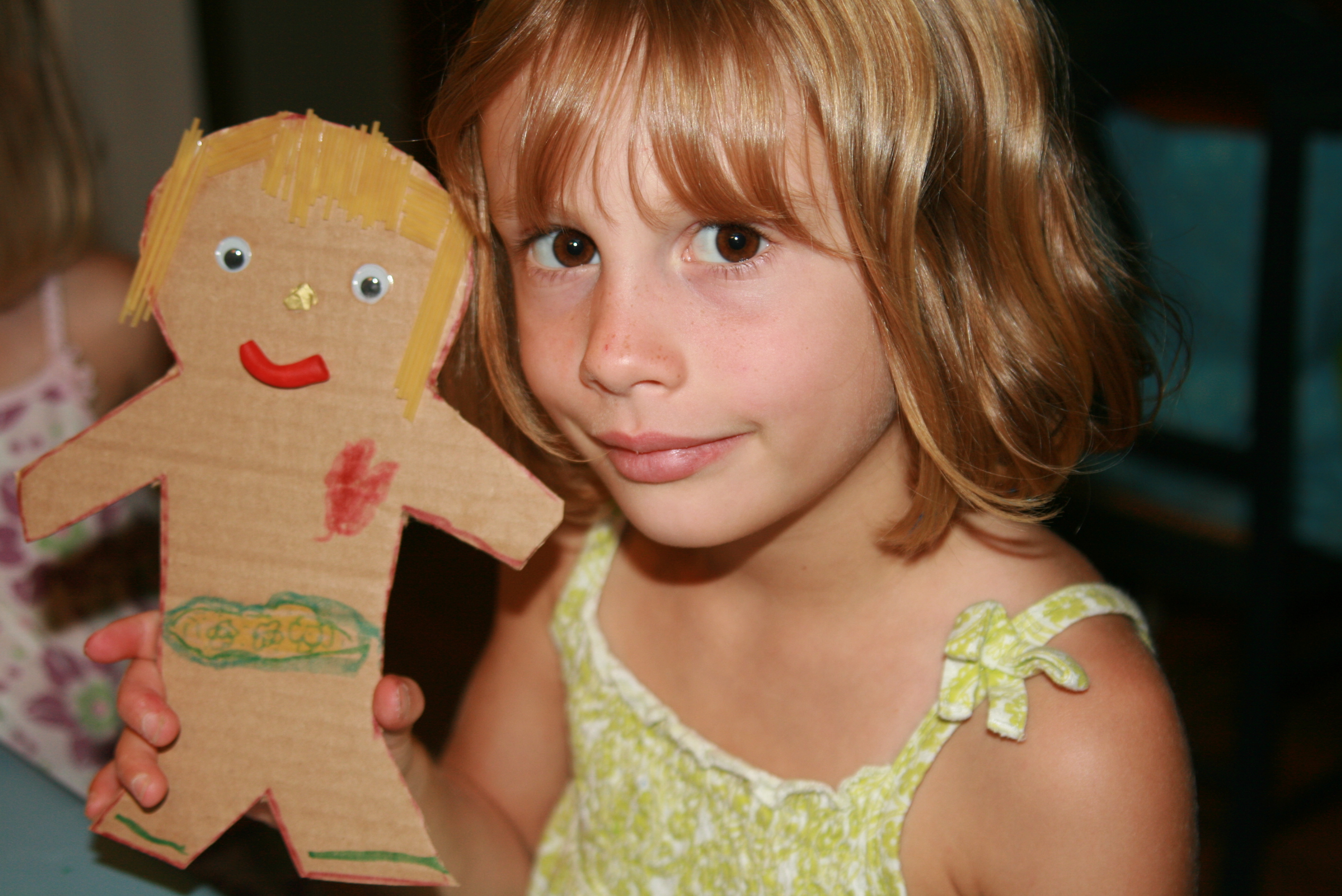 Grace has the most wonderful kindergarten teacher who puts a lot of thought into coming up with fun activities. Grace's "homework" (they really don't have homework) last weekend was to create a "me" doll, using a template, with help from her family. Of course, Tess wanted to make one, too. We used pasta for hair (and mouths, and Tess's nose), and the girls chose fabric for me to cut into dresses. Grace even gave hers a heart and underwear (obviously) under her dress. Then they put on a "me" doll performance: one invited the other over to play, and they jumped on a "trampoline" (the piece of paper in the above photo). Sadly, Grace's doll had to go off to school, and now Tess's is getting lonely.