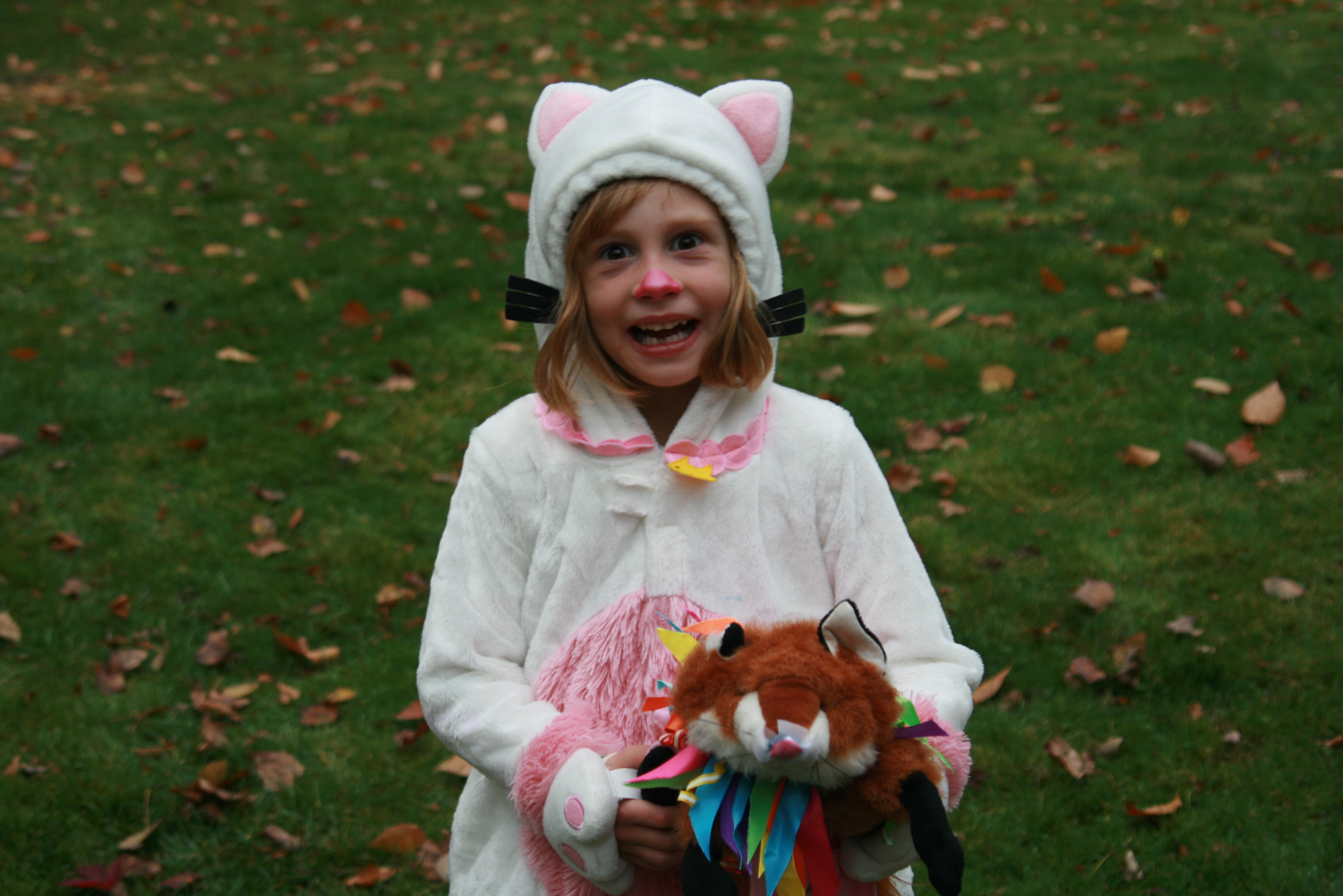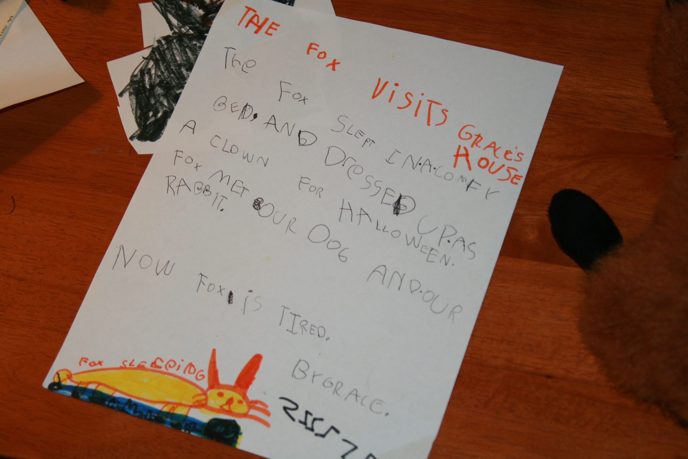 Last year on election day, Grace's school voted on a mascot. The red fox won, and now Grace's classroom has its own resident (stuffed) fox, named Foxy. Each weekend, a kindergartner gets to take Foxy home for special one-on-one time. Foxy comes with a journal, and each child (with help) takes a page to chronicle his/her adventures with Foxy. Last weekend, it was Grace's turn — this was especially exciting since it was Halloween weekend. Grace drew and cut out a red nose and taped it over his black nose, and he wore a frilly headband around his neck so that he could be a clown for trick-or-treating. I'm pretty sure Foxy can't wait to come back to our house — just as soon as he wakes up from his nap.
