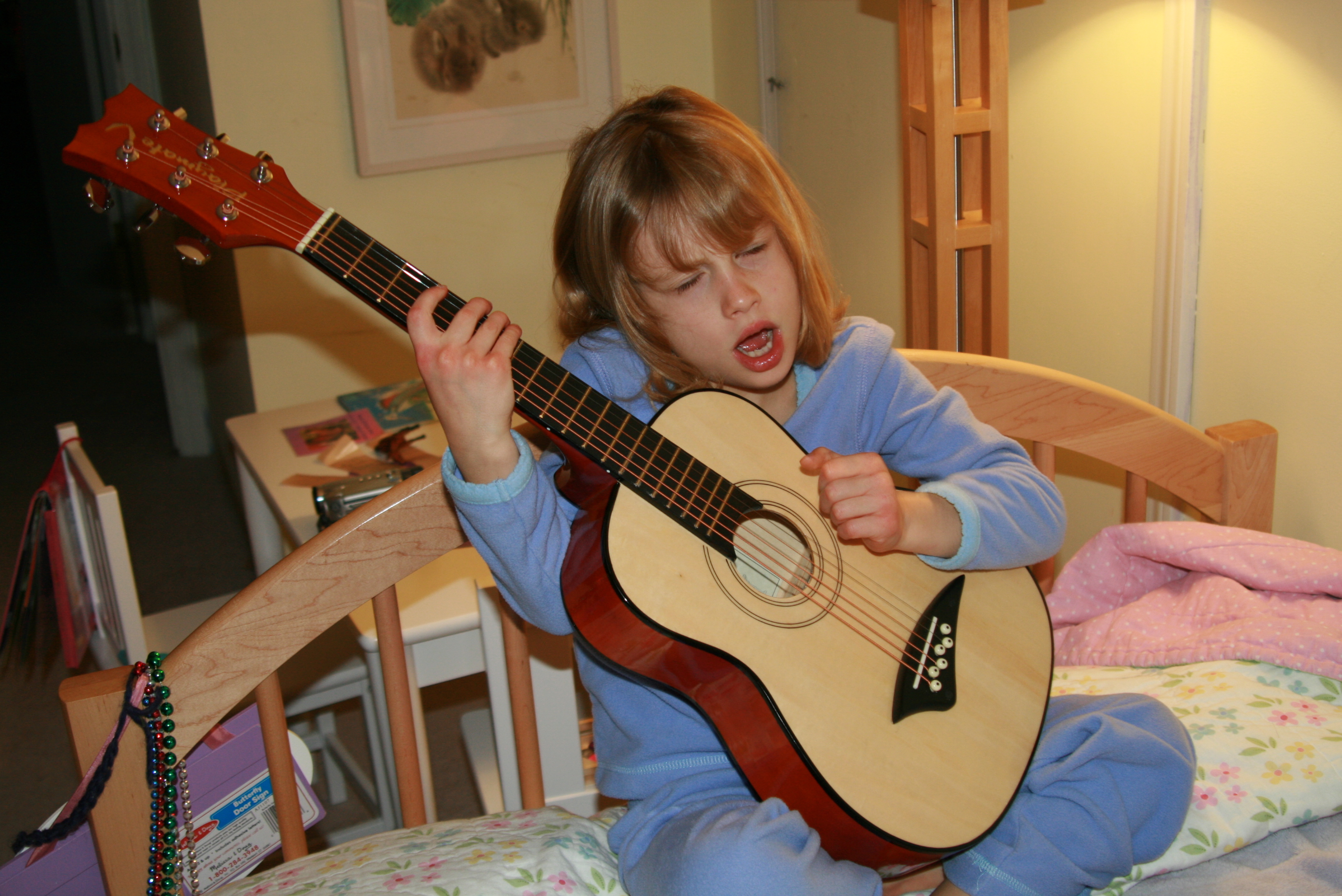 Grace's very full, very special day ended with a special guitar performance. She serenaded us with tunes like, "What are the colors of the rainbow" and "Me and Julio down by the schoolyard," accompanied by some very frenzied strumming. (Thank goodness she starts lessons next week! That kid needs to learn some real chords!)
