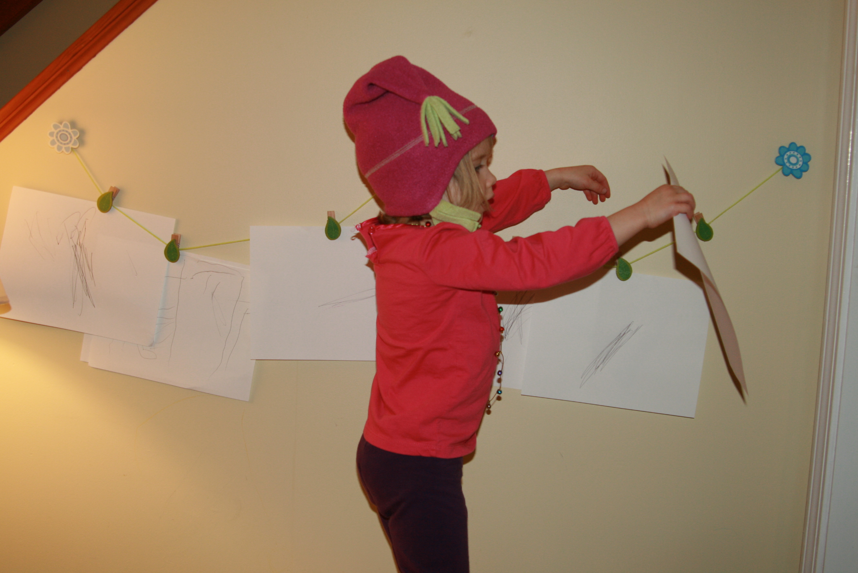 Yesterday, we stopped at the Christmas tree farm on our street to buy some wreaths. Grace was very helpful as we chose the prettiest ones, and is very excited to go back this weekend to get a tree. It's starting to look slightly festive around here. For several days now, Tess has been asking me if we can get out the Christmas decorations. I keep telling her no, not because I don't want to decorate, but because it feels like a big project and we just haven't had the time. So yesterday, Tess took it upon herself to do some decorating. She removed all of the beautiful artwork from the clips by their art table and replaced it with her own "decorations." It was a very good effort, but now I feel like I really do need to get out the "real" decorations! (And yes, Tess now wears her winter hat all day long, even when napping.)