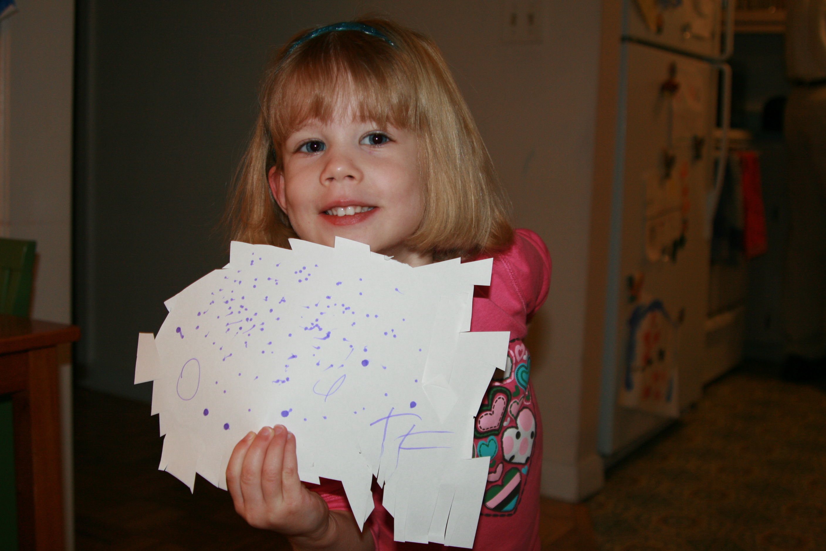 Tess completely surprised me the other day when she sat down at the art table and made a snowflake all by herself. She cut the edges of the paper, then decorated it with dots of color. She even wrote her name (if you look carefully, you can see all 4 letters). Beautiful!