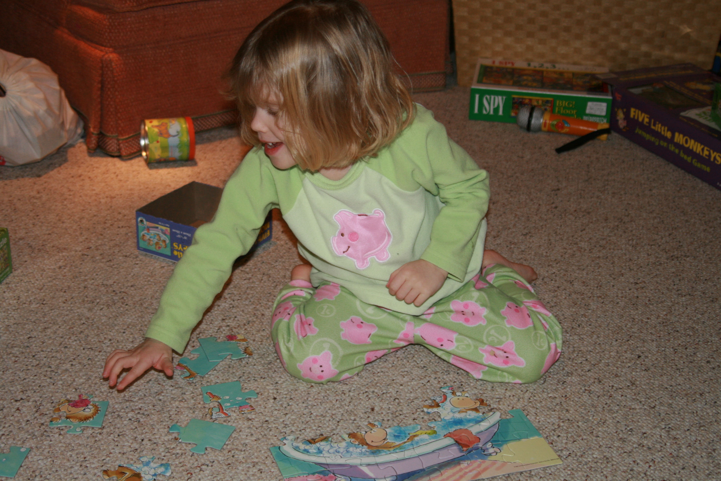 Just before Christmas, Tess pulled out one of Grace's 100-piece puzzles and started working on it. She asked for my help, but did a lot of it by herself. I found it astonishing that she had the patience to diligently work at such a complex task, but then again, it sort of fits with her personality. As luck would have it, she received several puzzles for Christmas, so the puzzle fascination continues. (Note in these photos that she is doing it upside down.) One day last week, she did her monkey puzzle six (!!) times — 3 times at homes and 3 times at the coffee shop while I chatted with a friend. Thank goodness for the puzzle obsession.