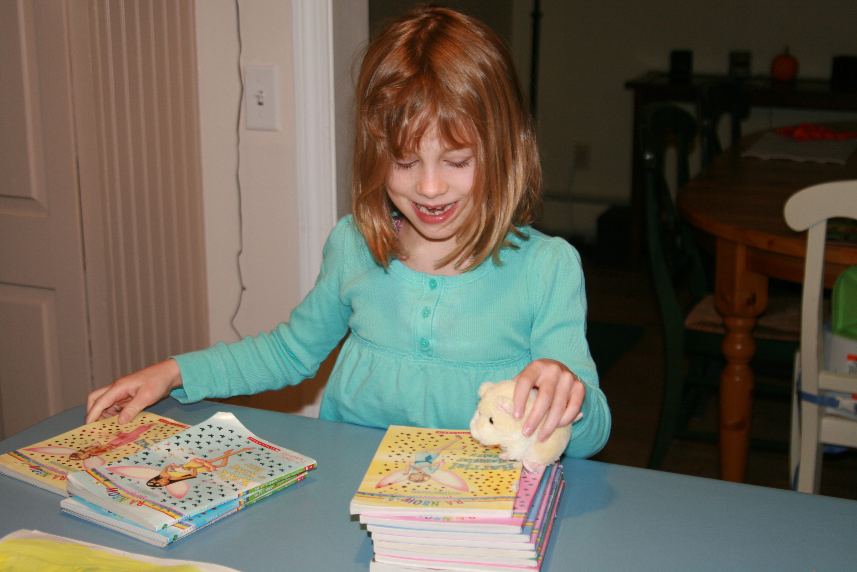 Those of you who have come within a two-mile radius of us within the past two months or so are already aware of Grace's obsession with the Rainbow Magic series of fairy books. It all started when a classmate brought a couple of these fairy books to school, and Grace took an immediate interest in them. It probably helped that her friend's books were from the "Pet Fairy" series. I mean, girls who have fairy friends and help them find their lost fairy pets? That's a 6-year-old animal lover's dream.