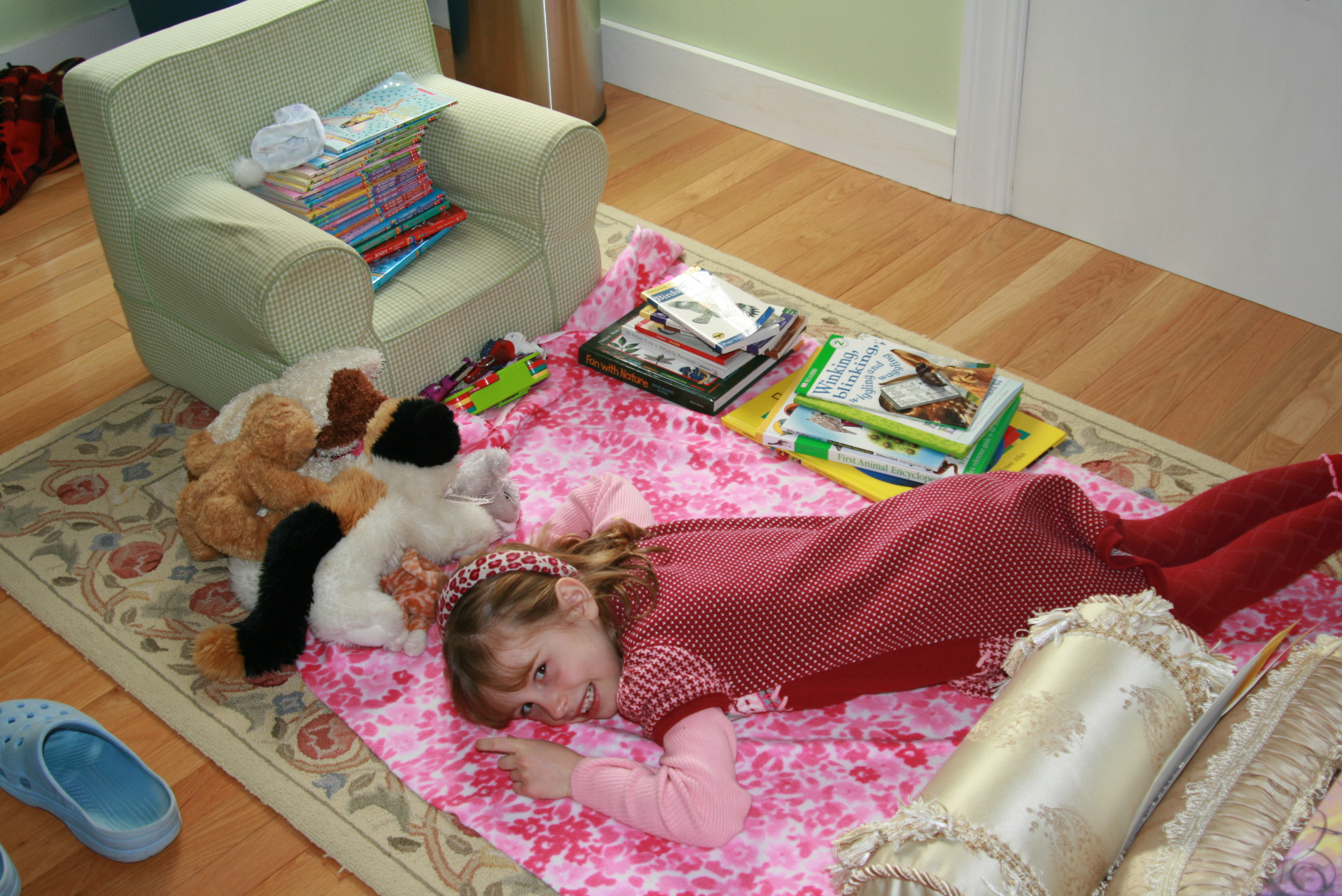 The other day, inspired by a book we had been reading, Grace decided to start her own animal rescue club. She got together all of her animal guidebooks, favorite animal friends, exploring tools, and fairy books (not animal related, but must be with us at all times). She even made a special sign for her door, all by herself. In case you can't decipher 6-year-old spelling, it reads: "2 people only. Brown eyes only. WAIT." I am pretty sure all of this was to include me and exclude Tess. I eventually convinced her that her club should be open to everyone, but I still love the sign.
