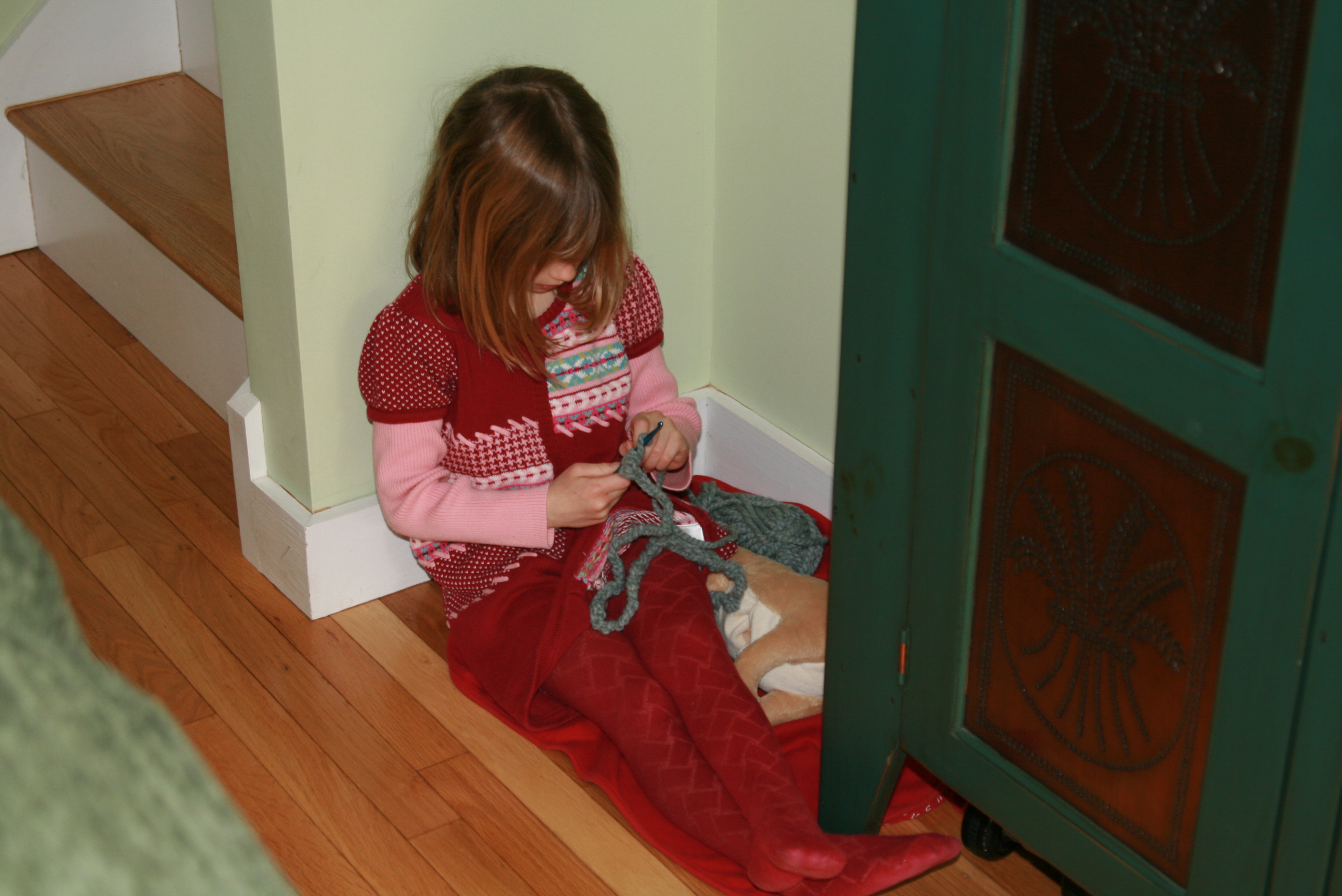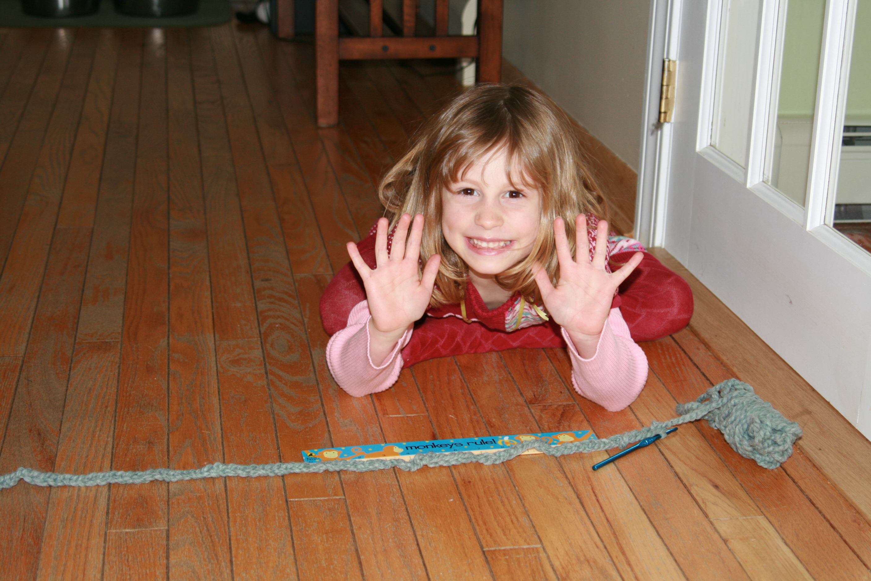 One day last week, as we were walking in the door after school, Grace said: "I can't wait to go settle down and knit." A few minutes later, I found her sitting quietly in a corner of the living room, with her ball of yarn and crochet hook (and an animal friend). A little while later, she asked if we could measure her rope. It was 10 feet long. By the time Adam got home from work, she had used up all the yarn. Her rope was 21 feet long. I love that child.