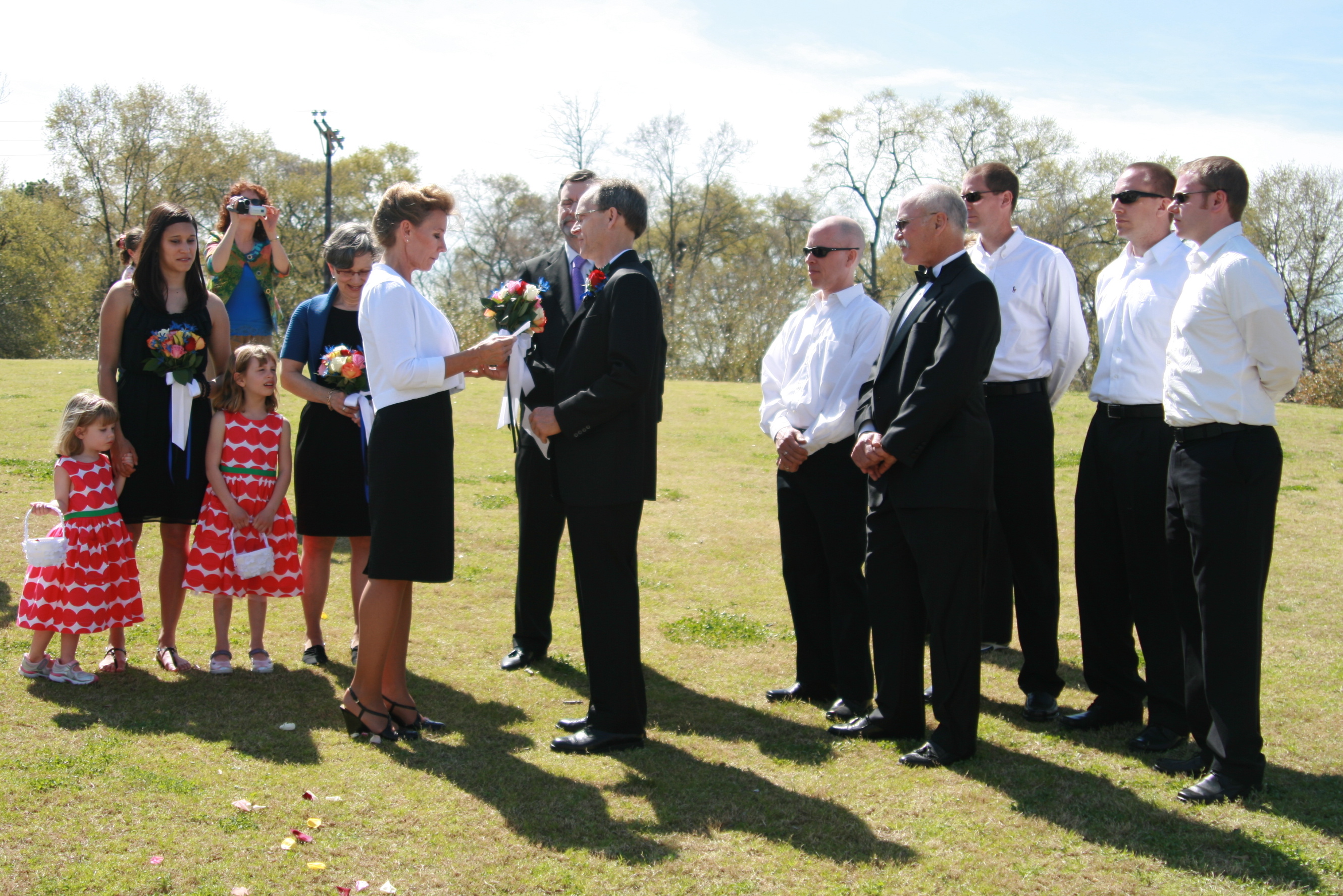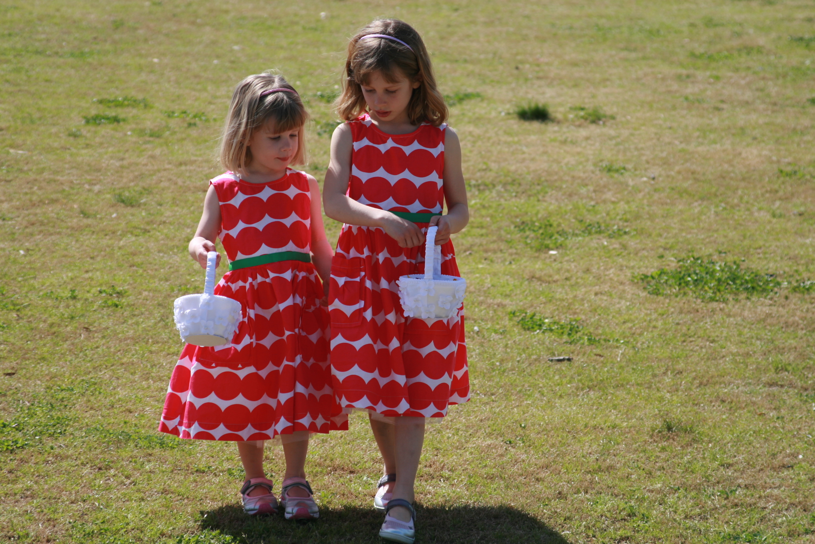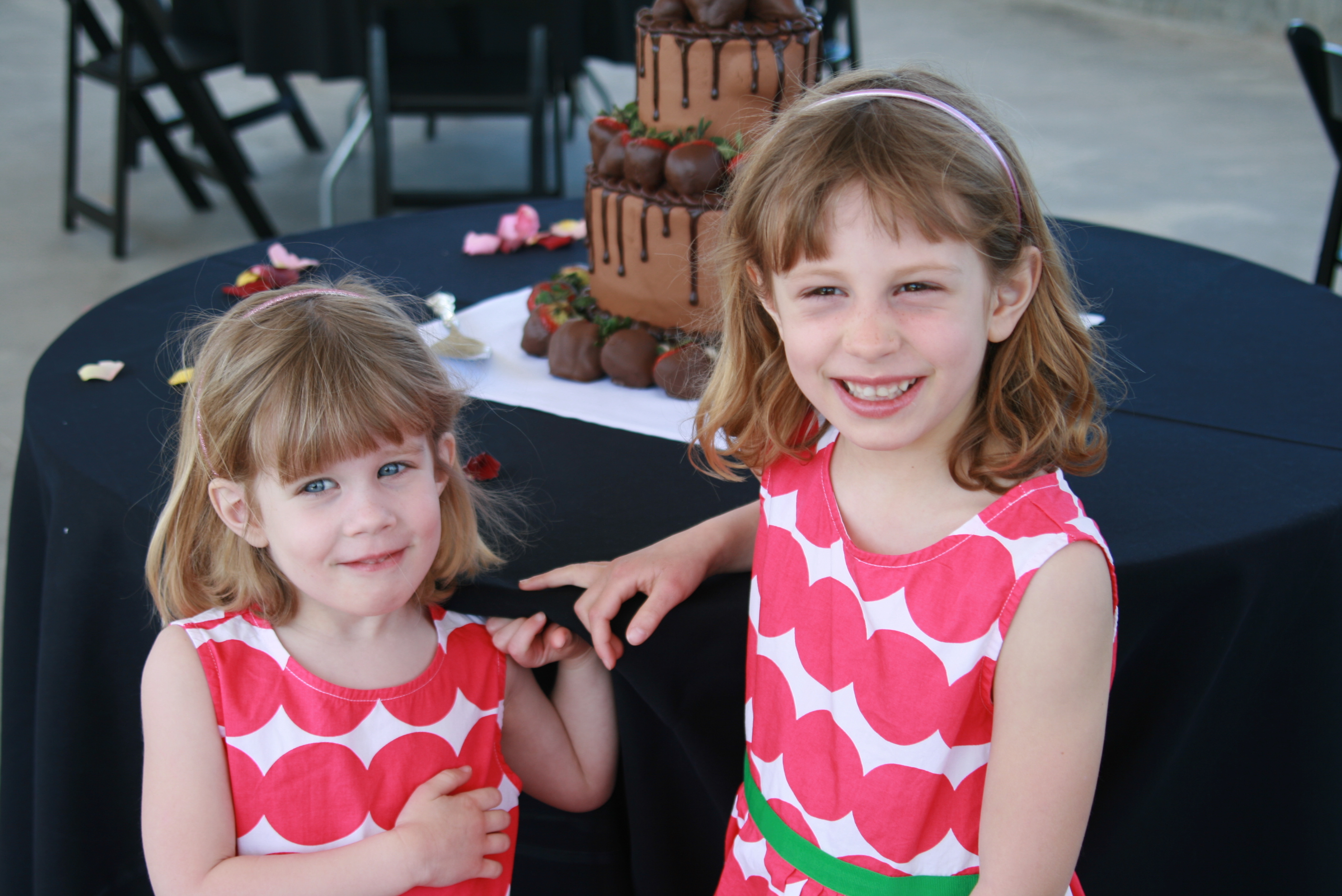 The main event of the family reunion was, of course, the wedding. The girls were thrilled with their pretty dresses (petticoats!), sparkly new shoes and cute little baskets full of rose petals. They were also very serious about their duties, though, and asked questions and practiced, then walked very carefully down the aisle. They even stood very still and remained quiet throughout the (short, thankfully) ceremony, even though I had been so focused on the walking and the flower petals that I forgotten to coach them on what to do when they actually arrived at their destination. I was very proud of them. And they were adorable.