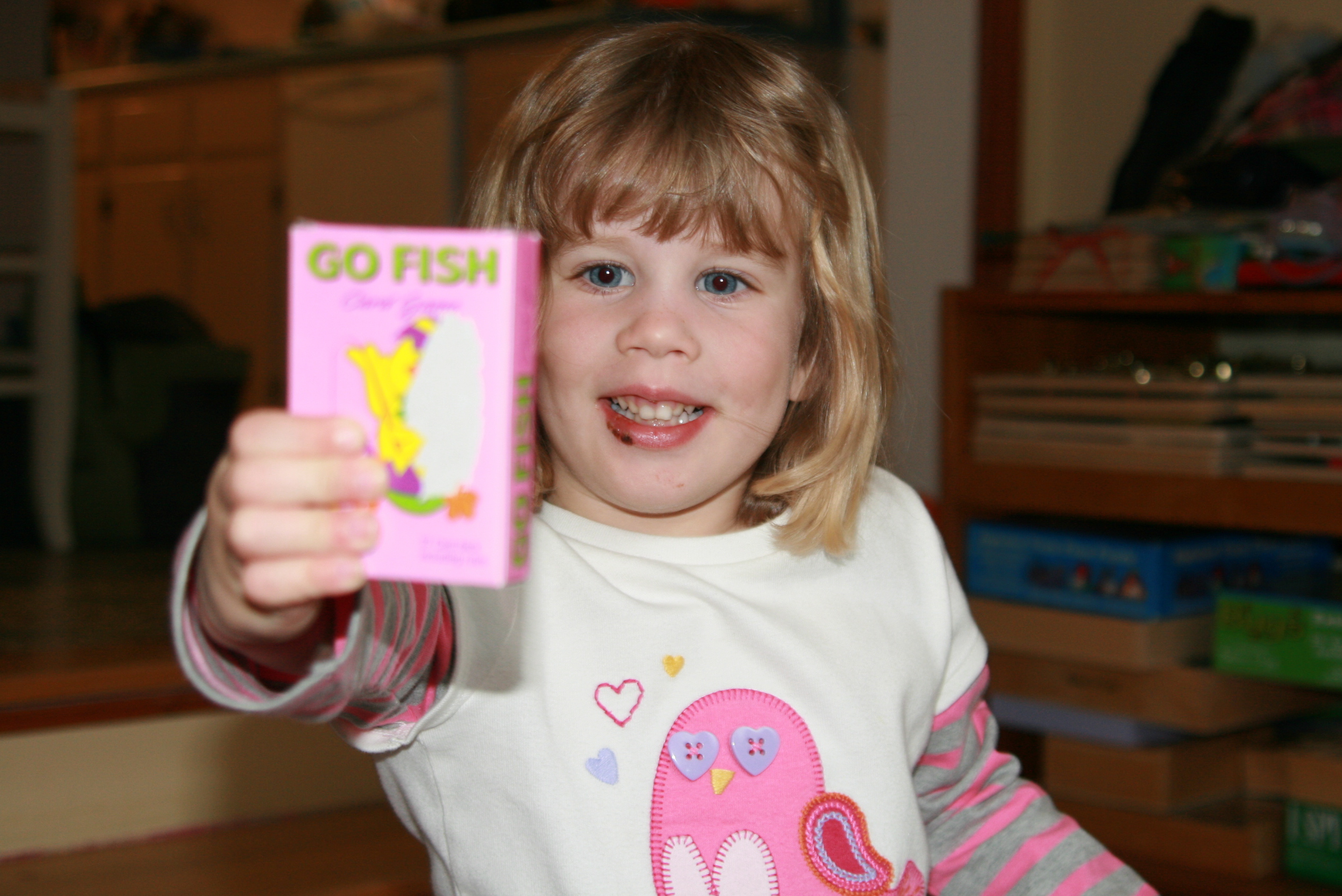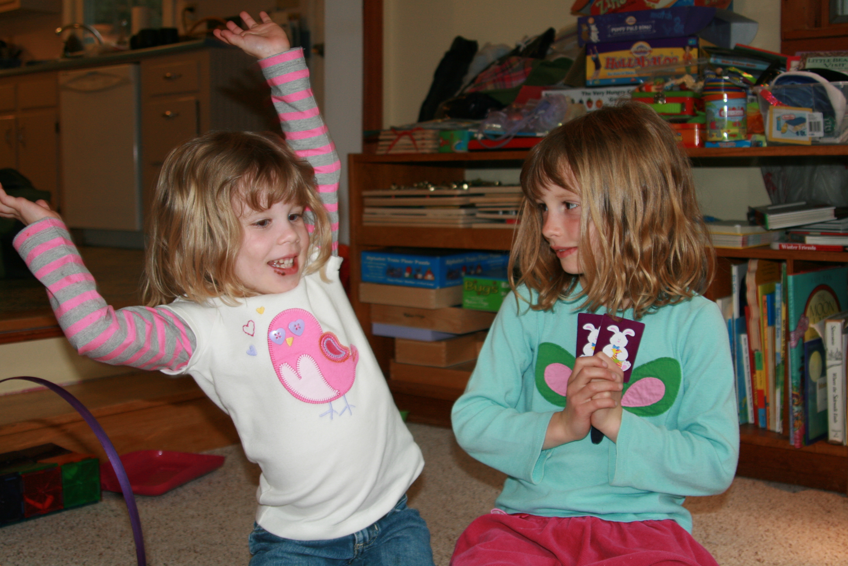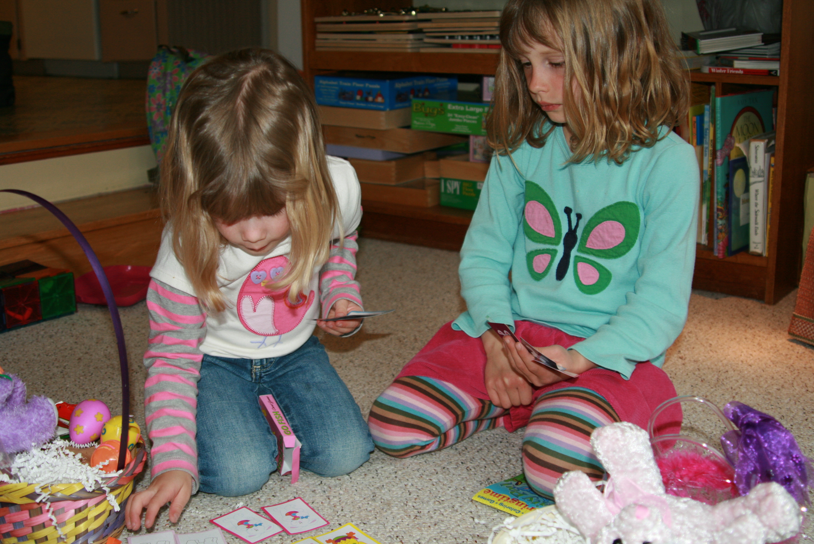 One of the things Tess got in her Easter basket was a cute game of Go Fish. We've tried playing this with her before, back when Grace's whole Uno craze began, but it didn't really click until today. And it only clicked today because Grace very kindly explained the game to Tess and got her started. And then Tess won, and did a little happy dance. And then she won again, and there was more dancing. And all the while, sweet Gracie, who hates to lose, just smiled. She was proud of her little sister.