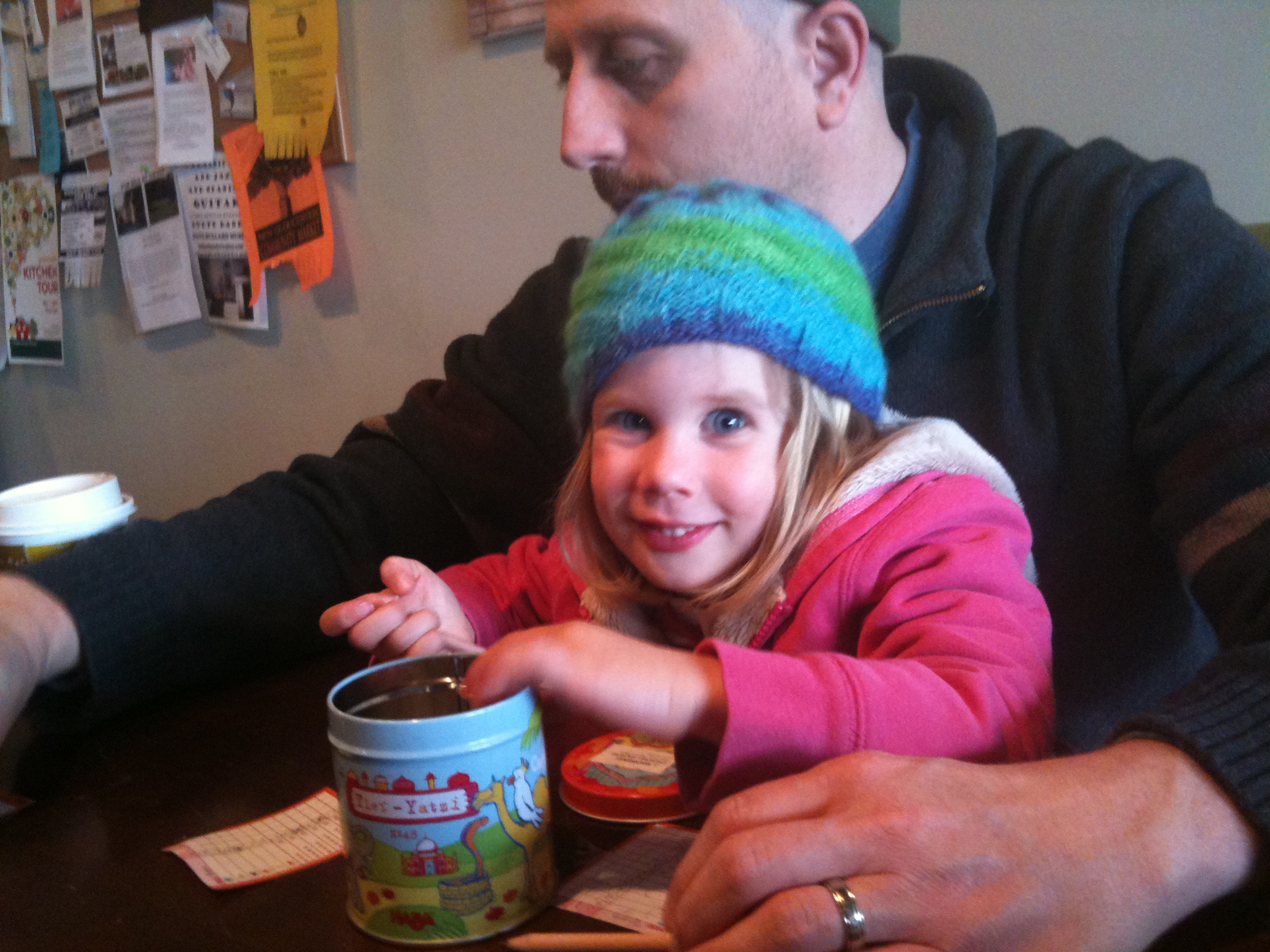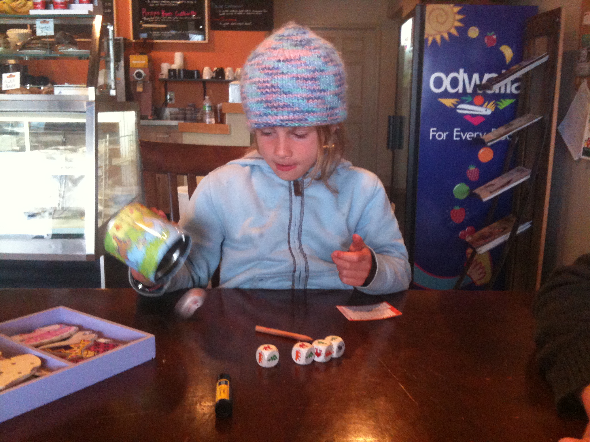 Adam and I both grew up playing Yahtzee. Long, exciting, competitive games of Yahtzee. So when we got to the coffee shop on Saturday and realized one of the girls had brought along Animal Yahtzee, we were ecstatic. The animals are so simple to match up that even Tess can play (although she needs some help with her scorecard). We played for a really long time and had a lot of fun. And we realized that this is the first game that we can all really enjoy together. I see a family game night in our future…
