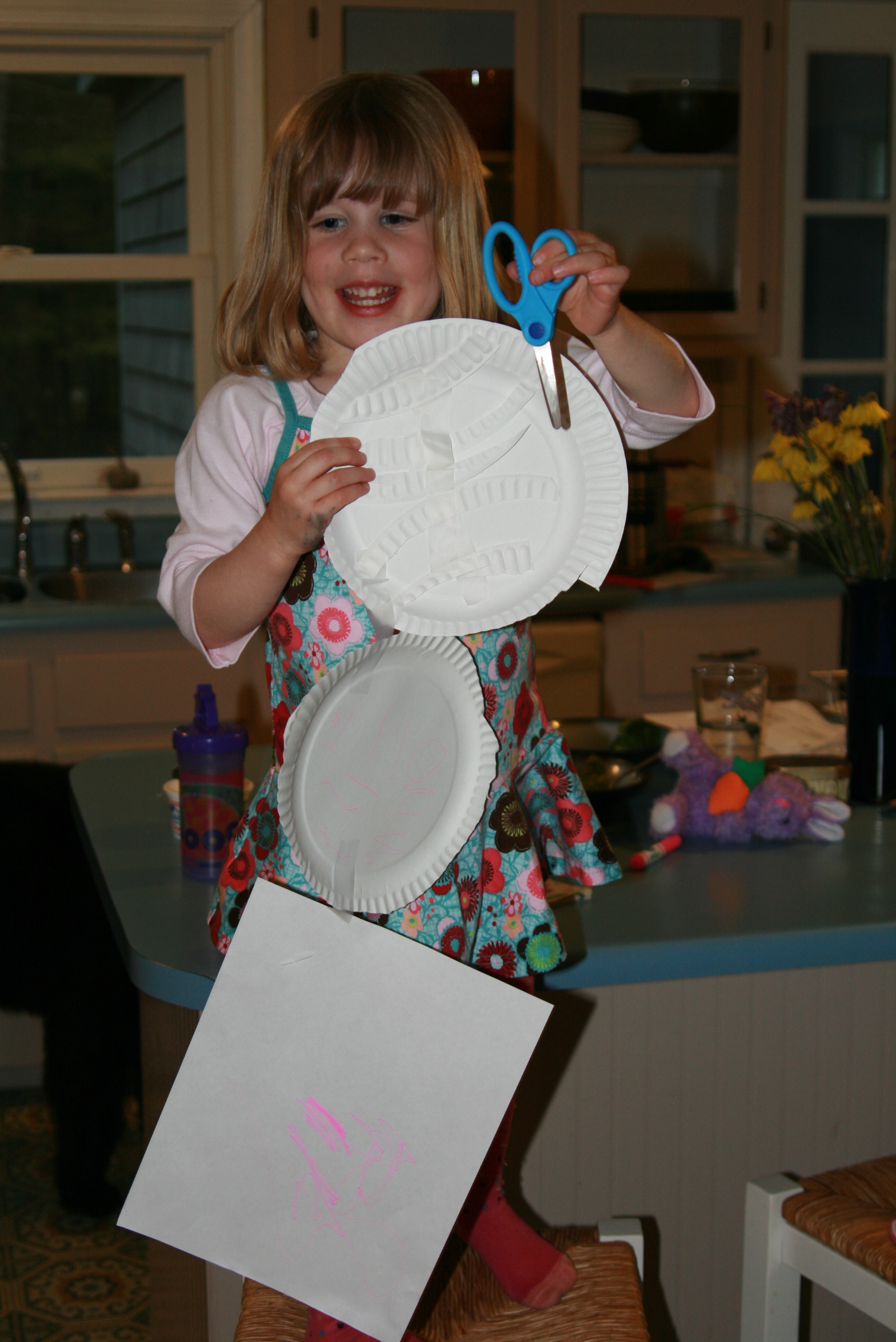 Over the past couple of days, I have been working on sorting and reorganizing our art supplies so that the girls can actually find the things they need. They are very excited about this, and it seems to have been effective, because both were hard at work on projects before dinner tonight. Grace made an octopus out of a paper plate, a hole punch (wow, where has that been hiding?), and pipecleaners. Tess used a couple of paper plates — and scissors! — to make a… um… a mobile! She was very proud of this. I especially like how she cut the edges off of one plate and taped them to the other plate.