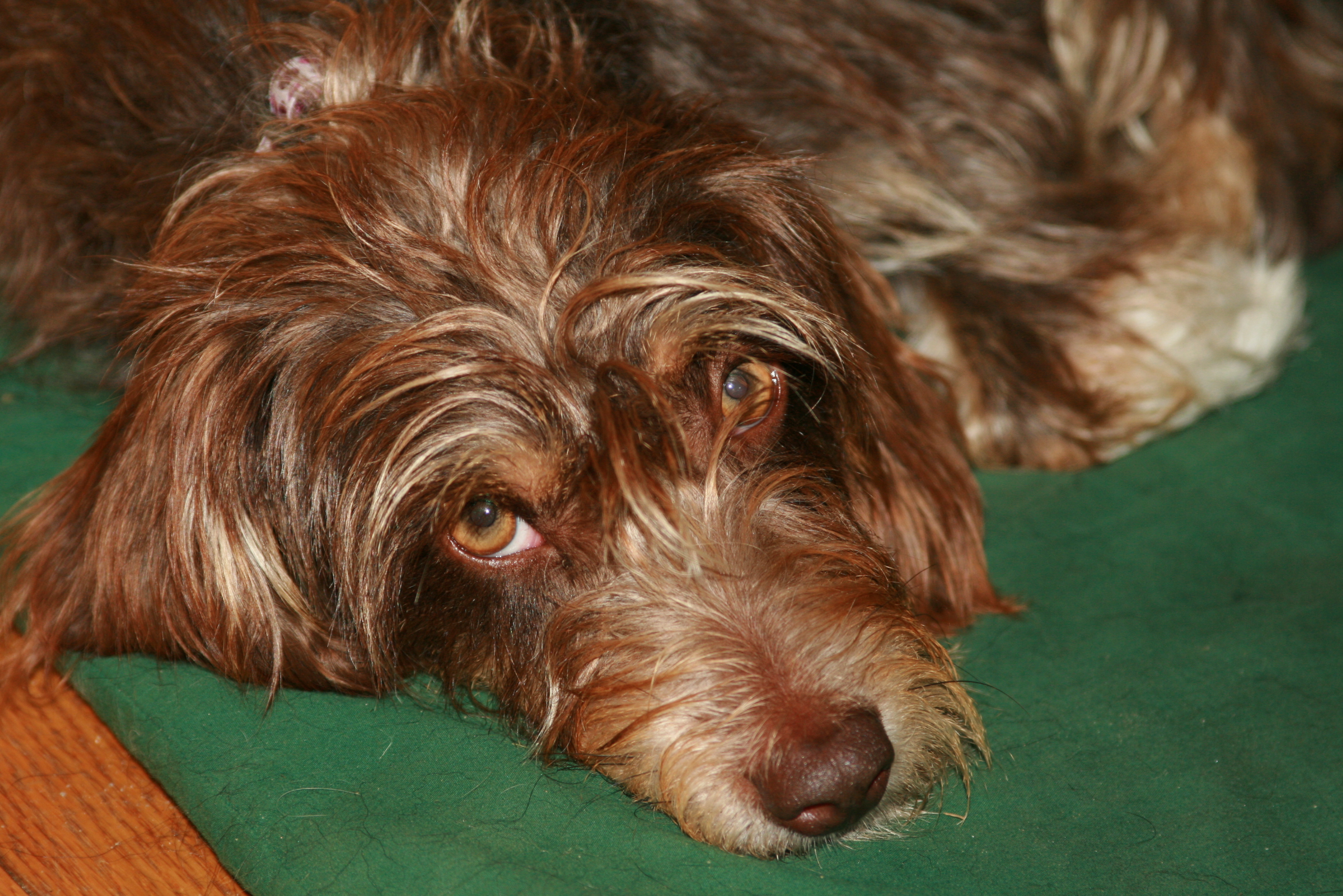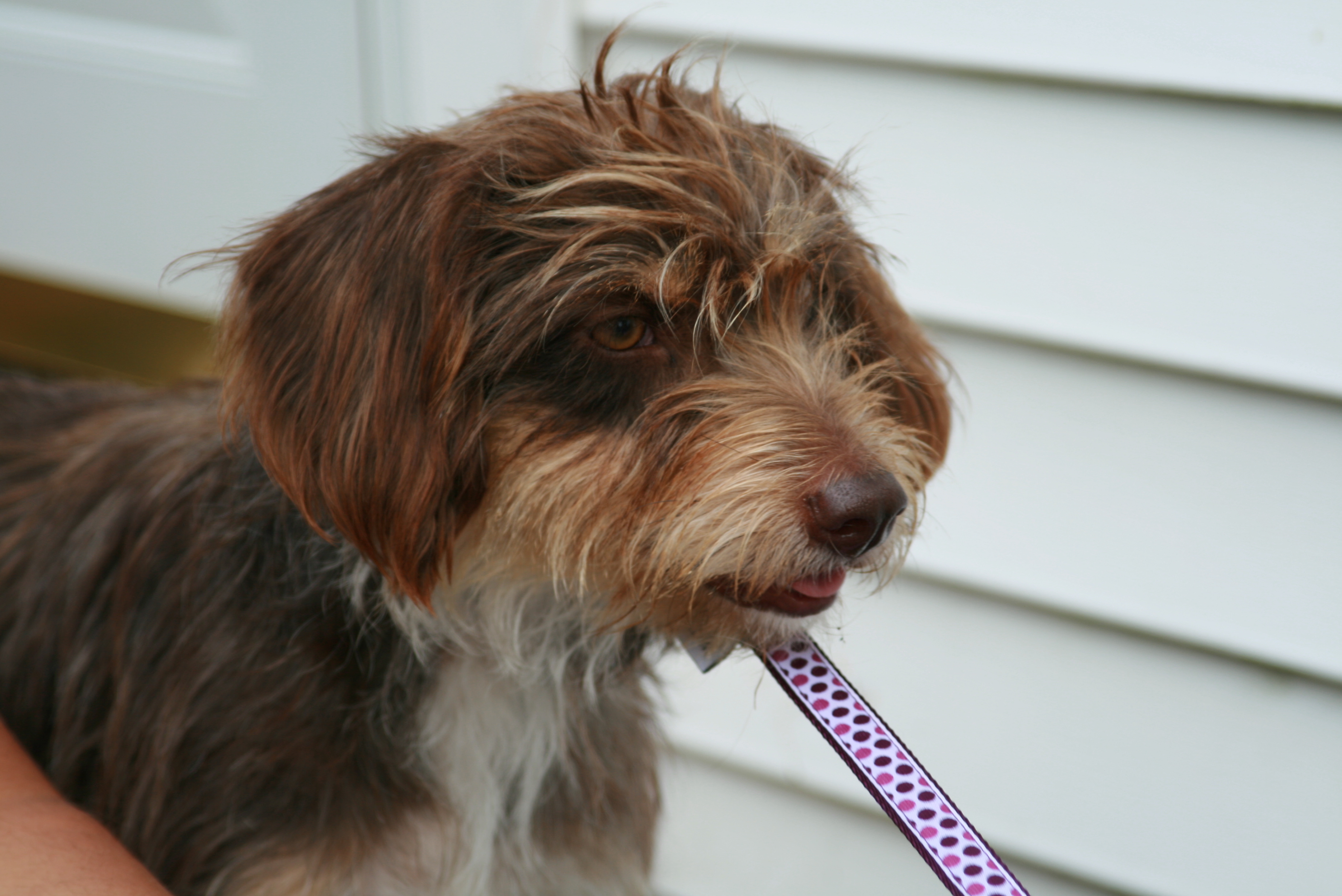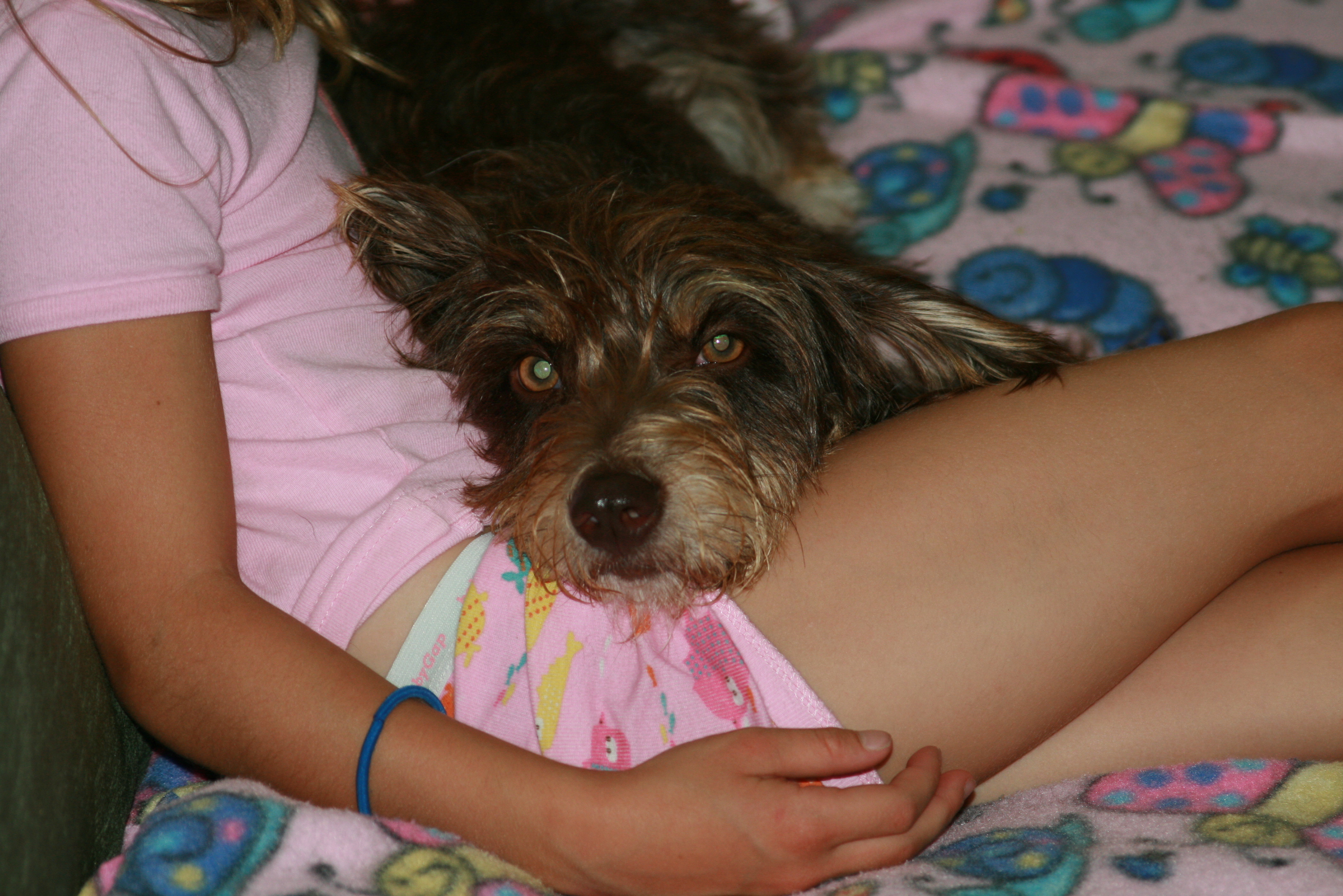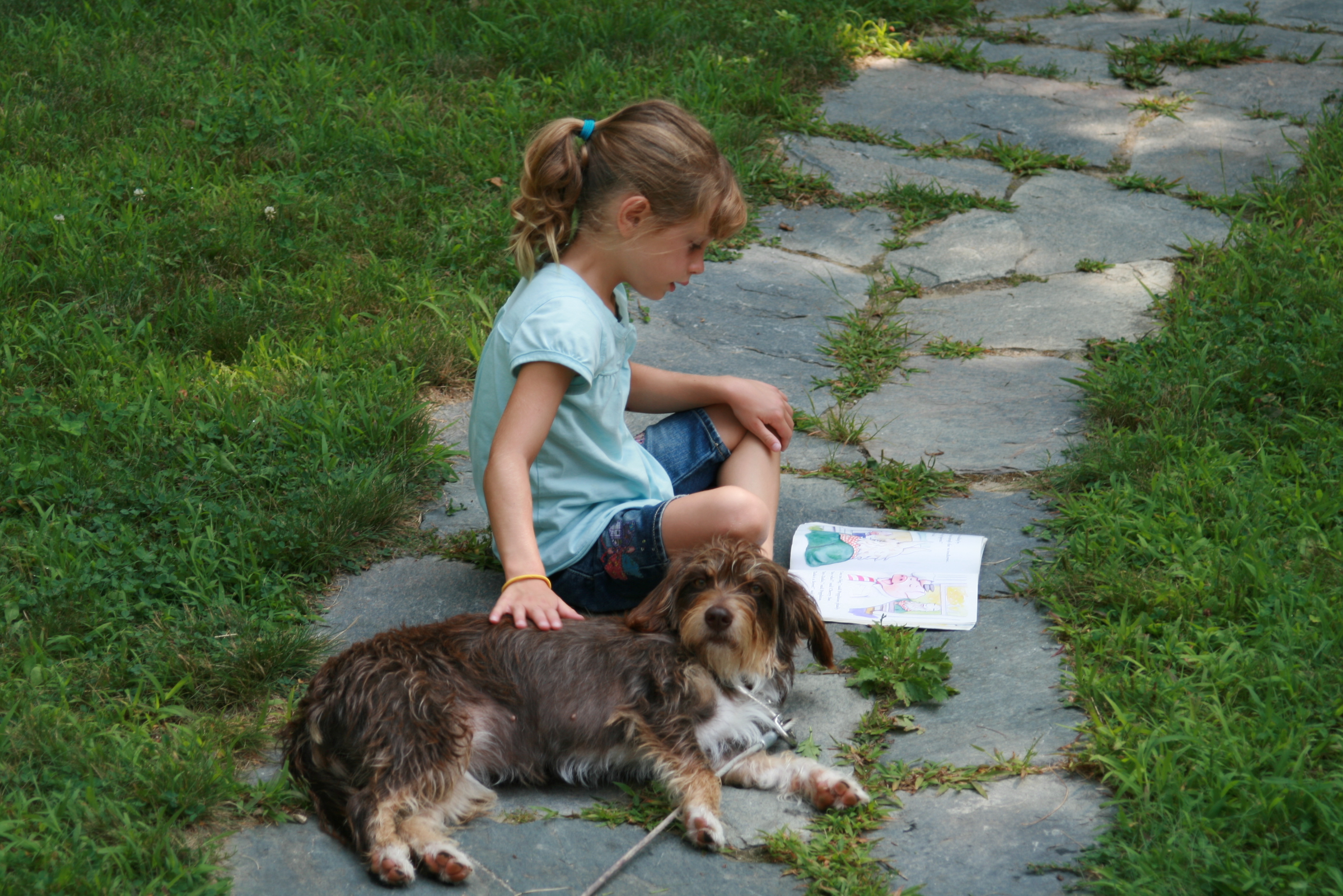 This is sweet Penny, our "new" dog. She's a rescue from Louisiana, driven up to Maine with nine other dogs who had all been cared for by the same generous foster mother. Penny was a stray and had heartworms and ear mites when she was found. They said that she's a dachshund/terrier mix, but our vet refused to even hazard a guess. And it doesn't really matter, because she's perfect. She's sweet and calm and quiet and playful — all of the things we were hoping for. Her favorite thing to do is to flop over onto her back to have her tummy rubbed. And apparently, she likes to be read to by six-year olds. Like I said — she's perfect.