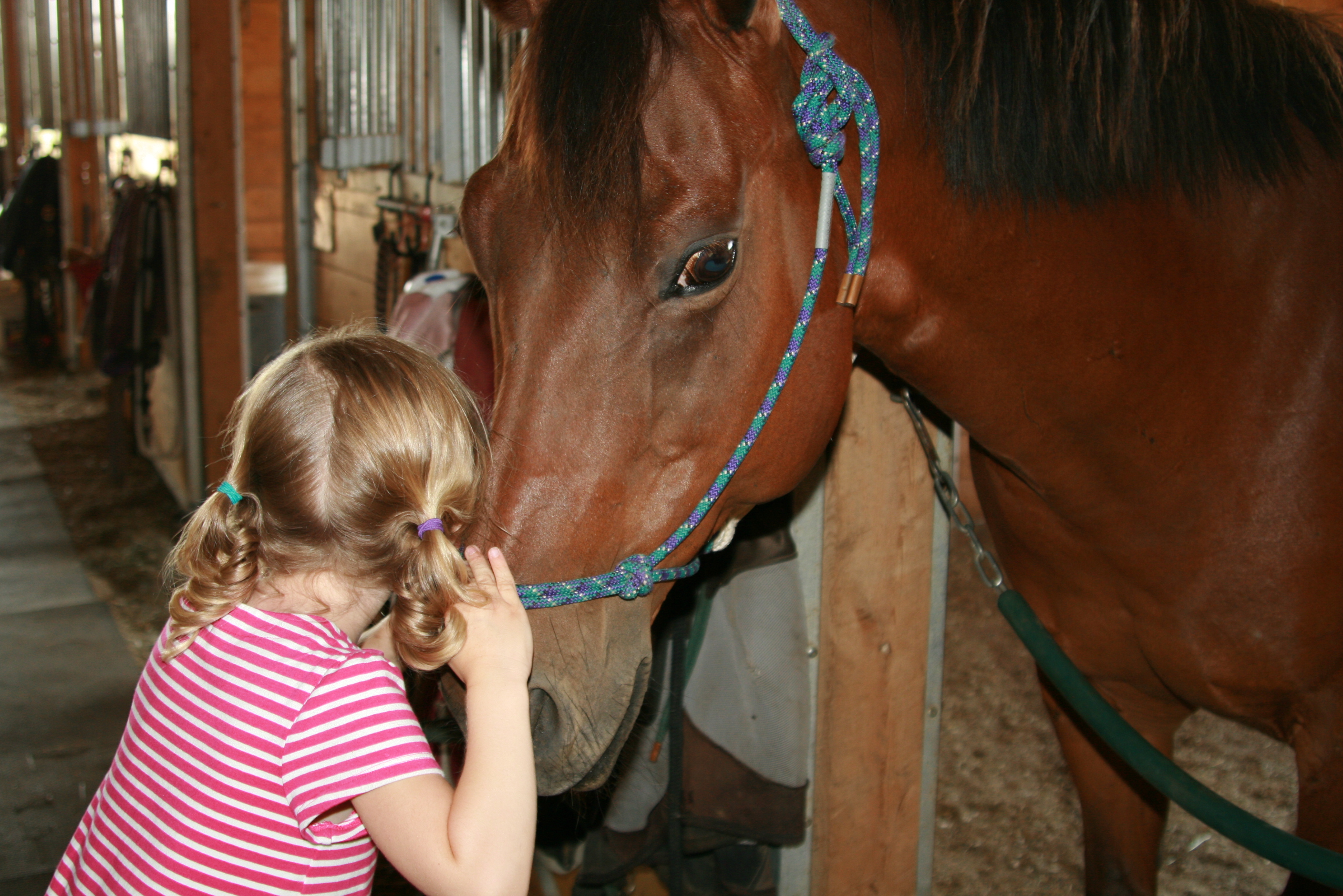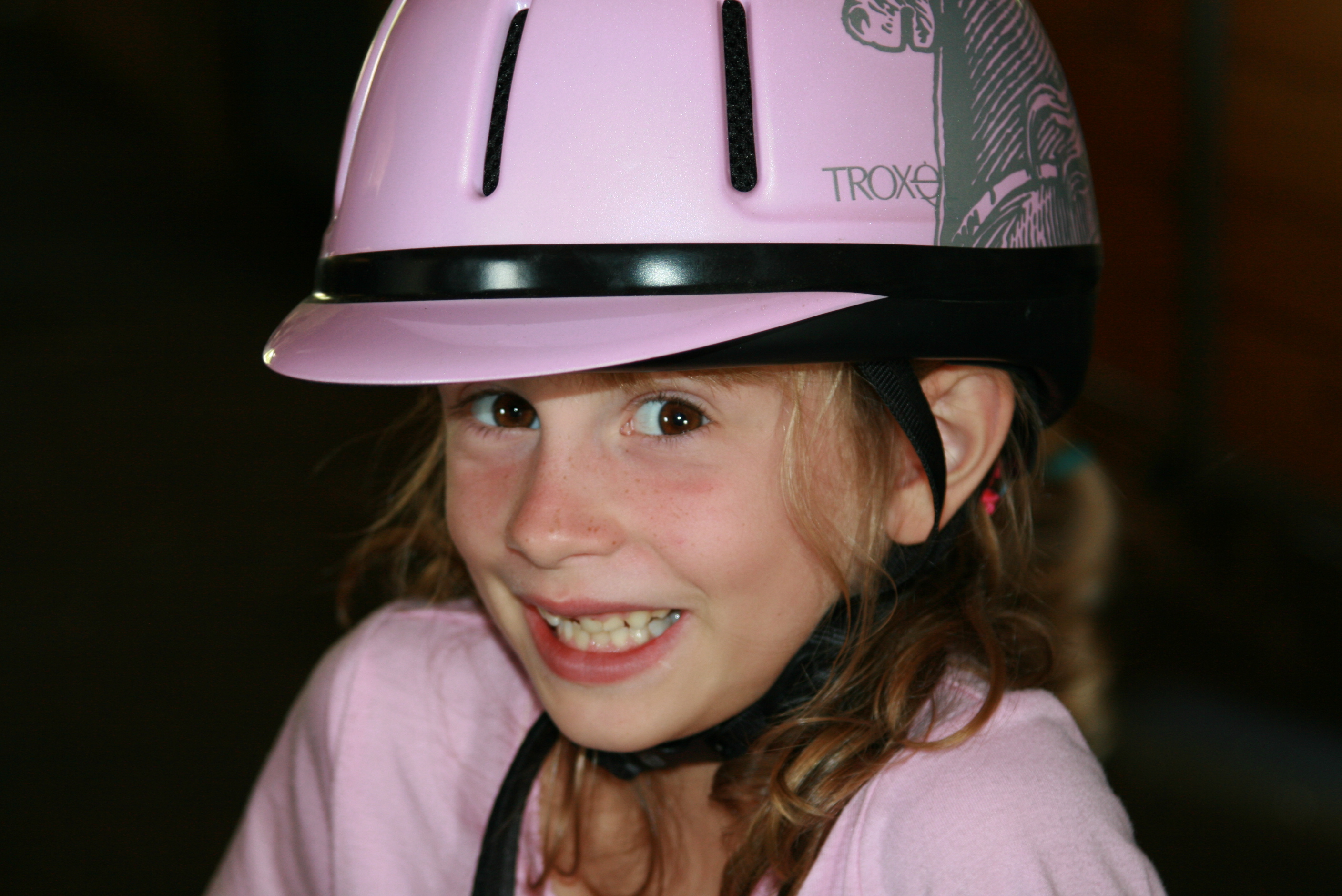 Recently Tess has been taking an interest in the goings-on at the barn. It started with wanting to watch Grace groom the horse, which was followed by wanting to pet (and hug) the horse. Now, Tess wants to help Grace do the grooming. And on Friday, Tess put on a helmet and asked Grace's instructor if she could ride the horse, too. Before I could blink, there was little Tess, perched on top of the horse, being led around the ring by her big sister. And of course, they had matching grins — huge grins.