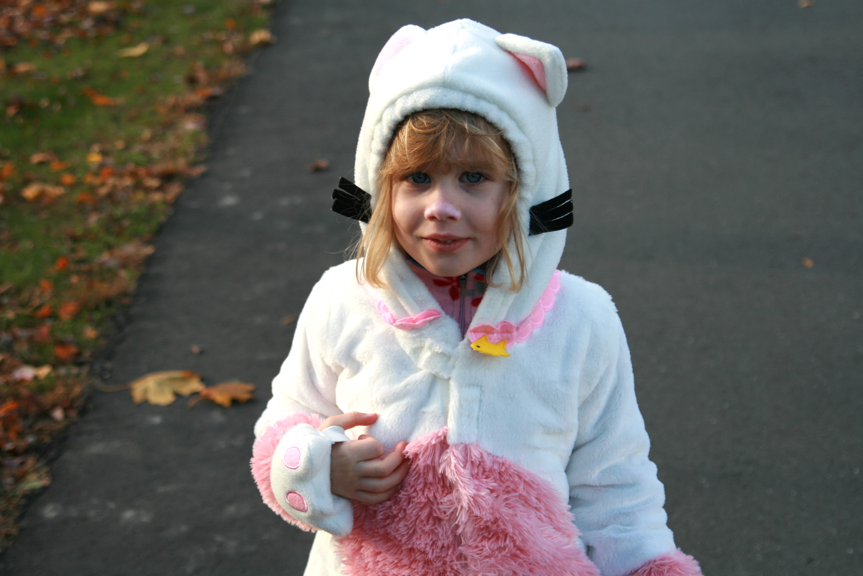 Last Halloween, I had to carry Tess around for trick-or-treating, because some of the bigger kids' costumes scared her. This year, she wanted to hold my hand the whole time. I didn't mind one bit. After all, walking up to complete strangers — and speaking to them — must be intimidating to a four-year old. I had given her some coaching ahead of time about saying "Trick-or-treat!" and then following that with "Thank you!" Tess took this very seriously, practicing those words before we left the house. And when it came down to it, she did a great job. As we walked away from one candy-giver, my little kitty whispered to me, "Mom, I forgot to say 'thank you.'"