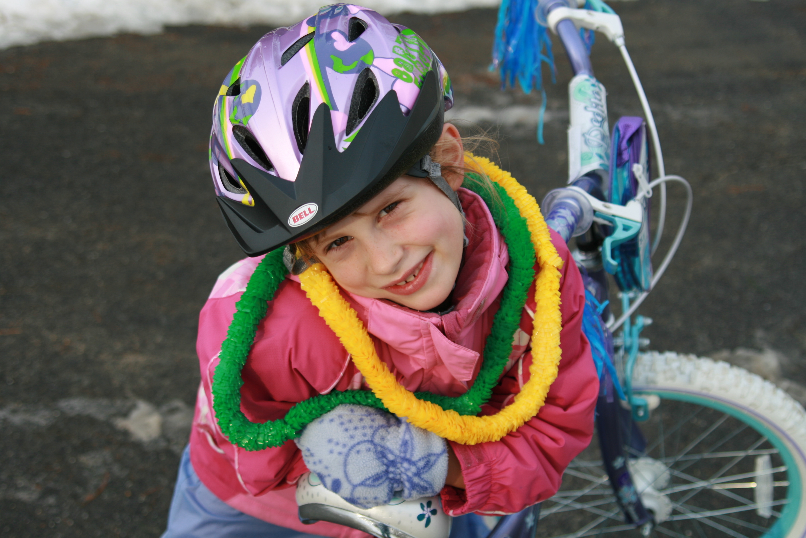 On Sunday, the girls rode their bikes down our road to a neighbor's house. This was Tess's first try on a real bike with training wheels, but she caught on quickly and had a grand time. She really felt like a big kid riding a bike like her sister's — but her bunny-eared hat reminded us that she's still little. For now, at least.