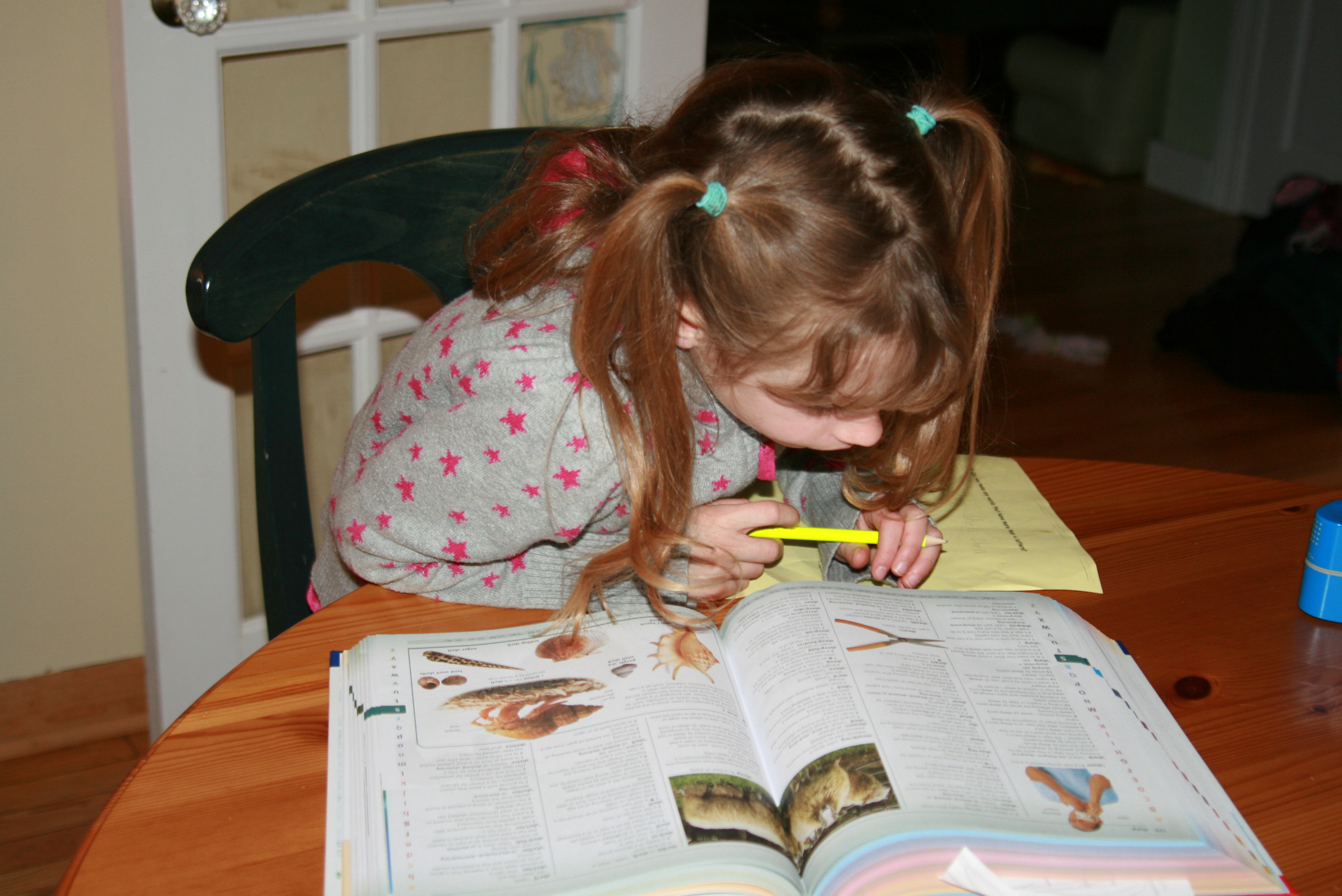This was the scene after dinner last night, when both girls refused to take a bath because they needed to do their "homework." Tess was working on a new workbook about shapes, and Grace was acting as her teacher. Grace was also working on the optional "math mayhem" homework she receives each Monday. It's the only homework she ever gets, and she insists on completing it Monday night even thought it's not due until Friday. The kid loves a challenge — and besides, who doesn't love math homework that involves a dictionary?!