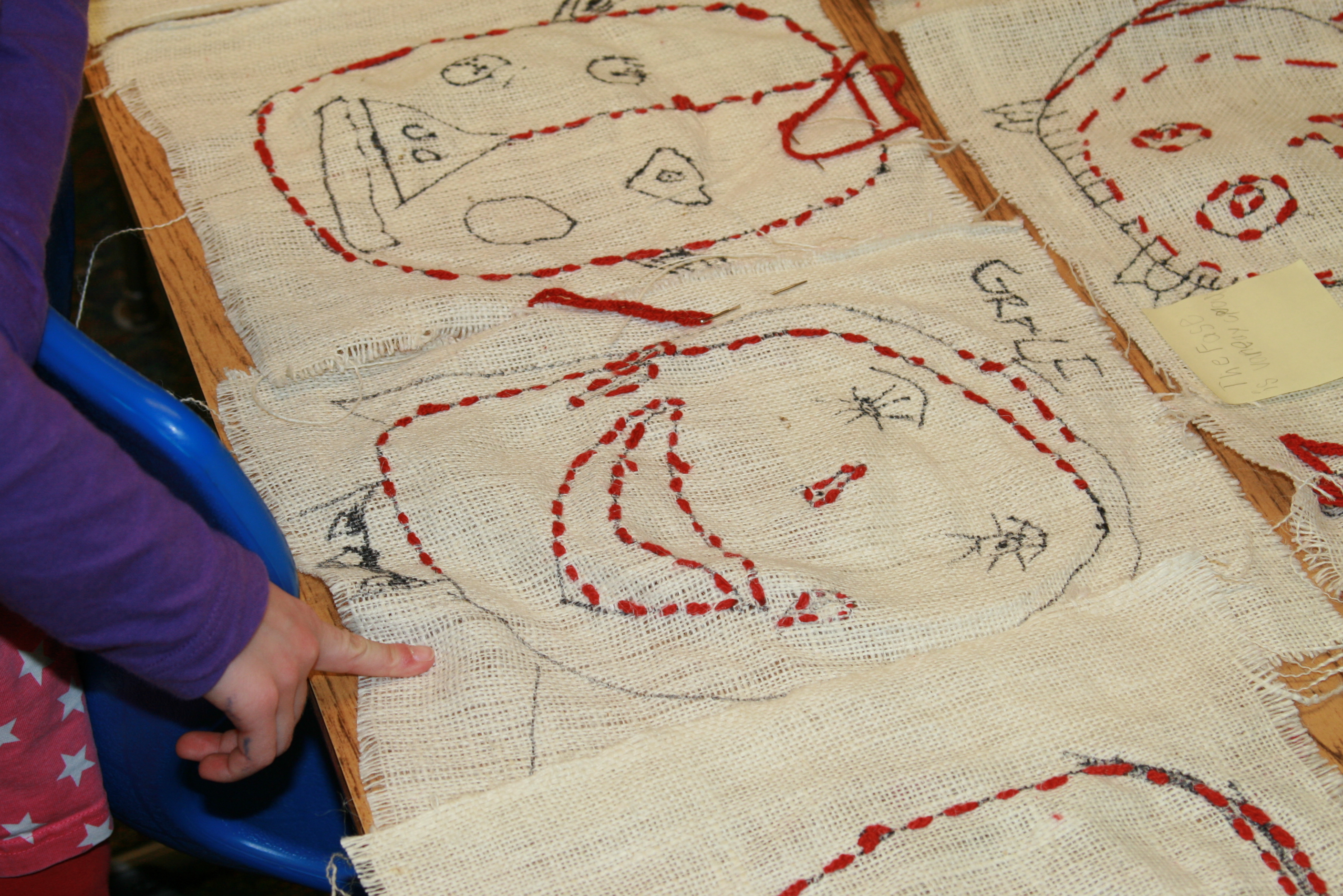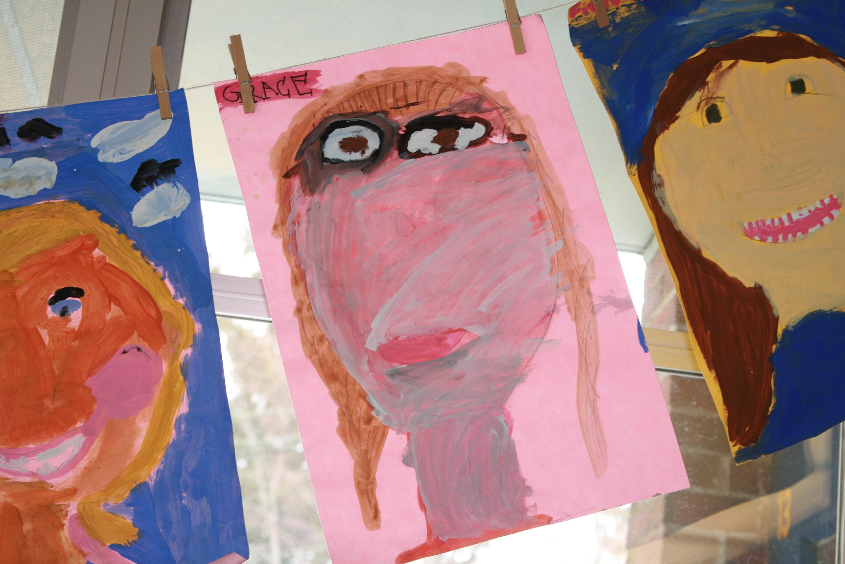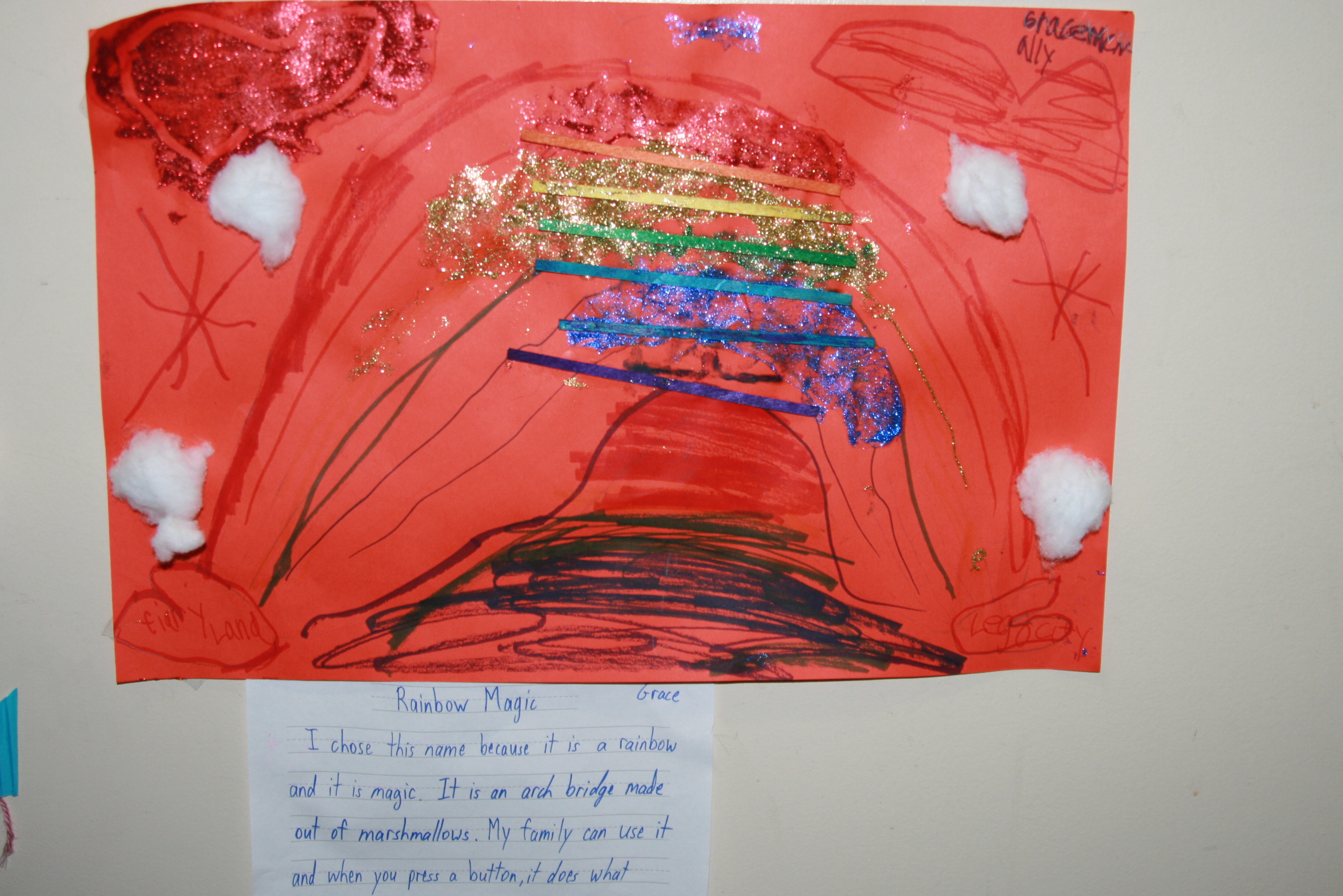 Last Friday, the school had an art walk for parents and students. Recent works of art were displayed in the hallway and in each classroom. Students went from room to room with a pad of sticky notes, writing comments and praise, and sticking the notes to the art for all to see. This was a lesson in art appreciation, and it was wonderful to watch. Of course, I particularly enjoyed my own girl's artwork, which included two types of self-portraits (how great is the sewing?!) and a "dream bridge" (influenced by the Rainbow Magic books perhaps?).