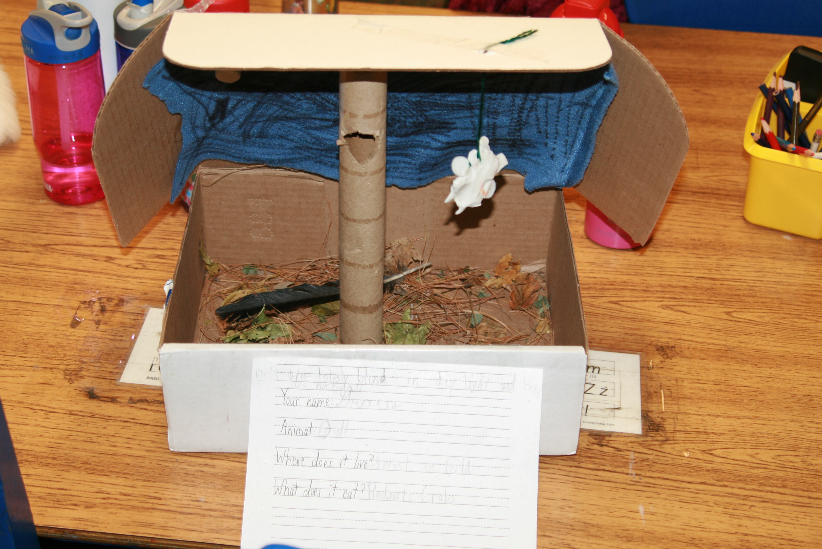 As an added bonus, we also got to see their final projects for their science unit on habitats. Each kid had studied an animal and created a physical project about its habitat. Grace's was the owl. She made a very cool owl habitat out of a box and a paper towel roll, plus some felt and pine needles and such. She made her owl out of clay and and hung it from the top of the box. Very creative.