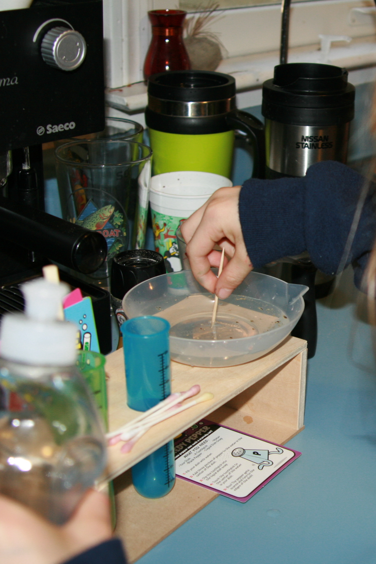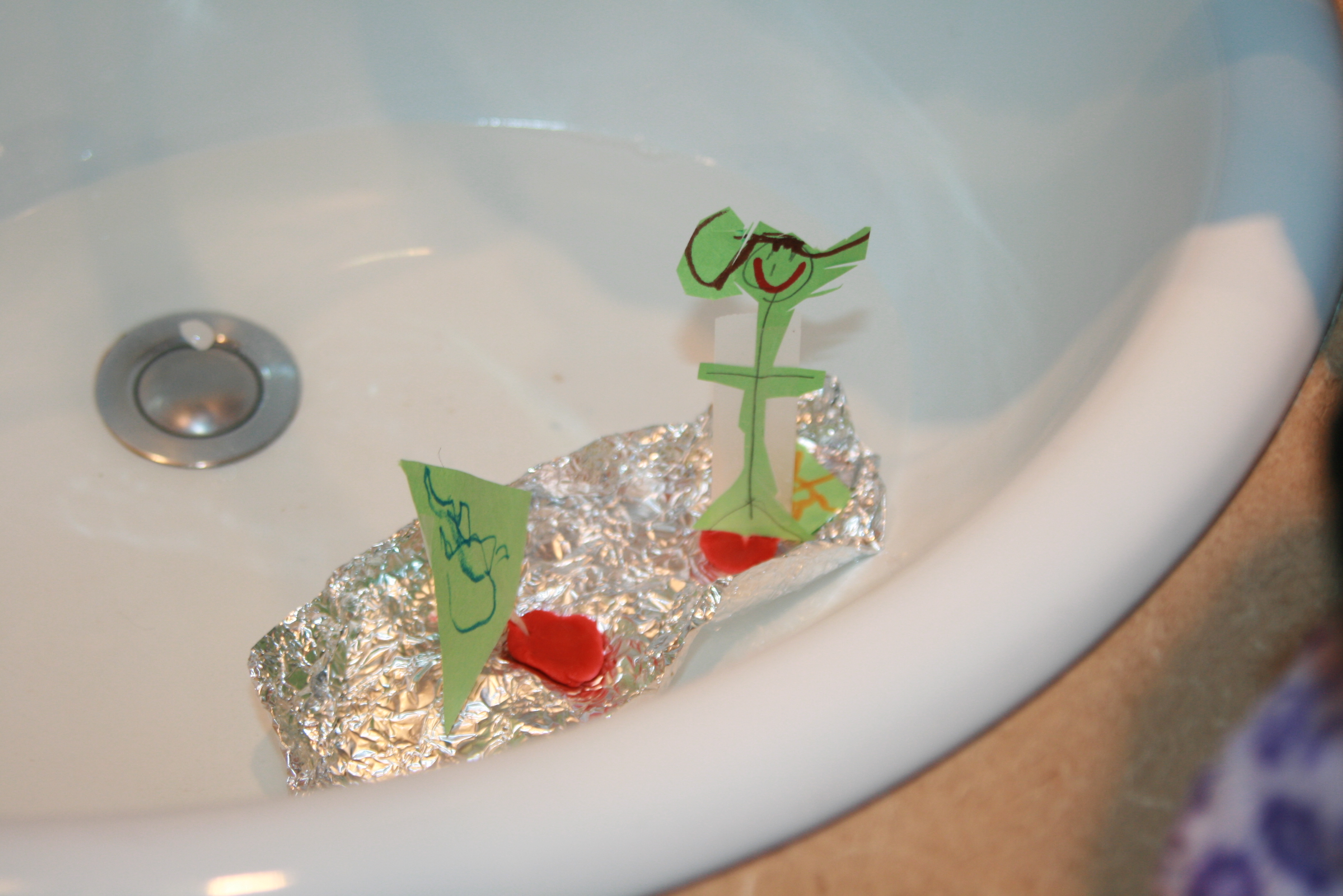 We spent lots of time outside this weekend enjoying the beautiful weather — I promise! We raked, played baseball, got ready for winter, etc. But we also spent time inside experimenting, using simple science kits a friend gave us. The girls made bubbly water, wrote with invisible ink, and made pepper flakes shoot away from a toothpick (very cool!). Then later, while Grace and I went to visit our neighbors, Adam helped Tess make a boat out of aluminum foil, clay, and paper. It was seaworthy! Hooray for experimentation!!