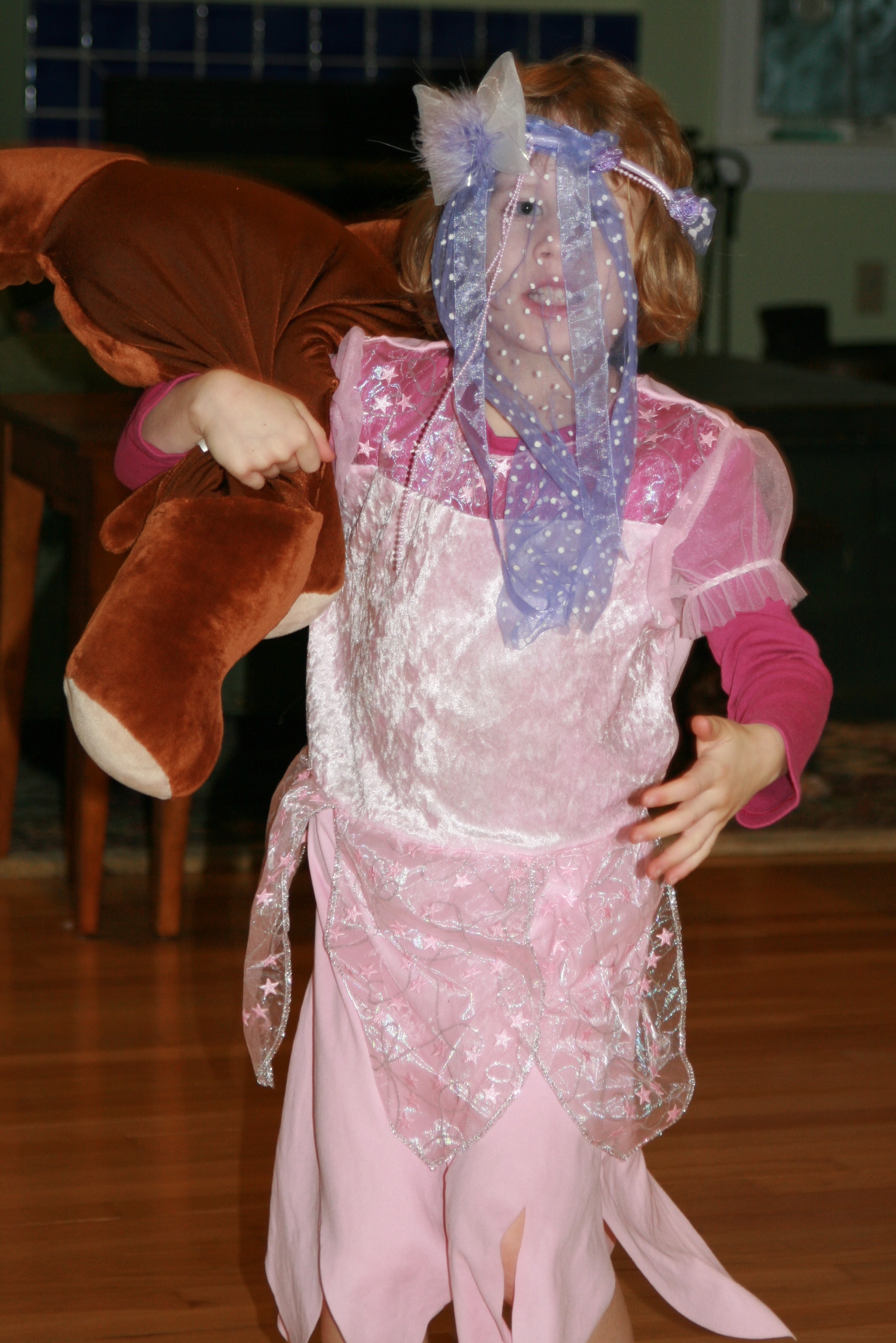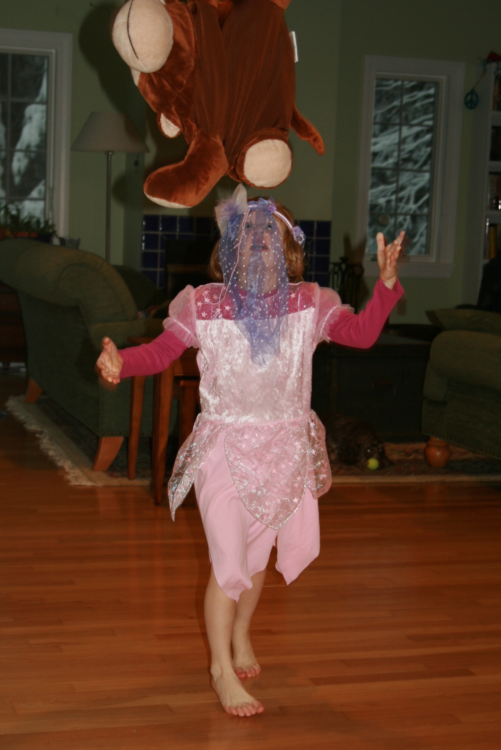 Tess may not be the queen of hula hooping (not yet, at least), but she can throw that monkey (named Bobo) with the best of them. I just wish you could have heard the song she was singing as she danced and tossed around poor Bobo. I also wish I had been able to catch part one of her act on film — she was dressed up as a fairy and sang a very sweet fairy song. I can't wait to see what she comes up with for our first annual Christmas Eve family talent show (the rest of you family members had better be ready to face some stiff competition next month!).
