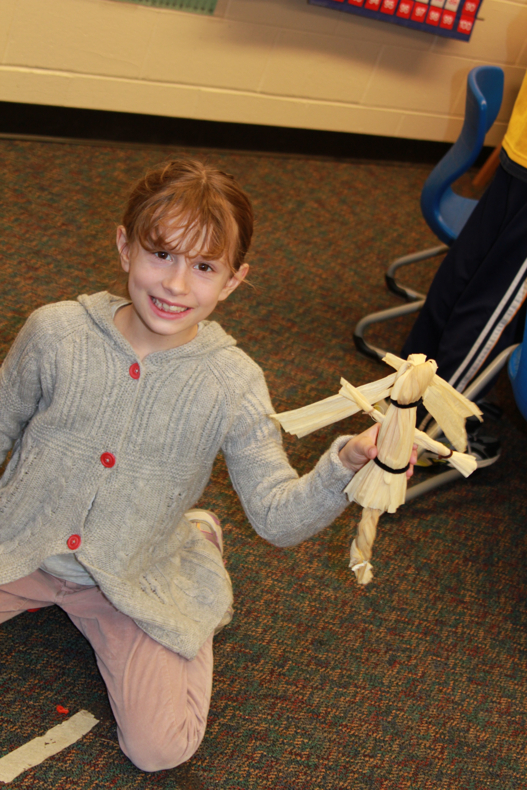 Today I had the pleasure of helping out in Grace's classroom as they made cornhusk dolls. This was part of their unit on the Wabanaki Indians. I helped kids braid thin strips of cornhusks for the arms and legs, and helped them twist pipecleaners around the bodies. Of course, Grace didn't need any help, but I loved watching her interact with her friends. It's no surprise that she finished hers early, so she and a friend also made a teepee. Awesome.