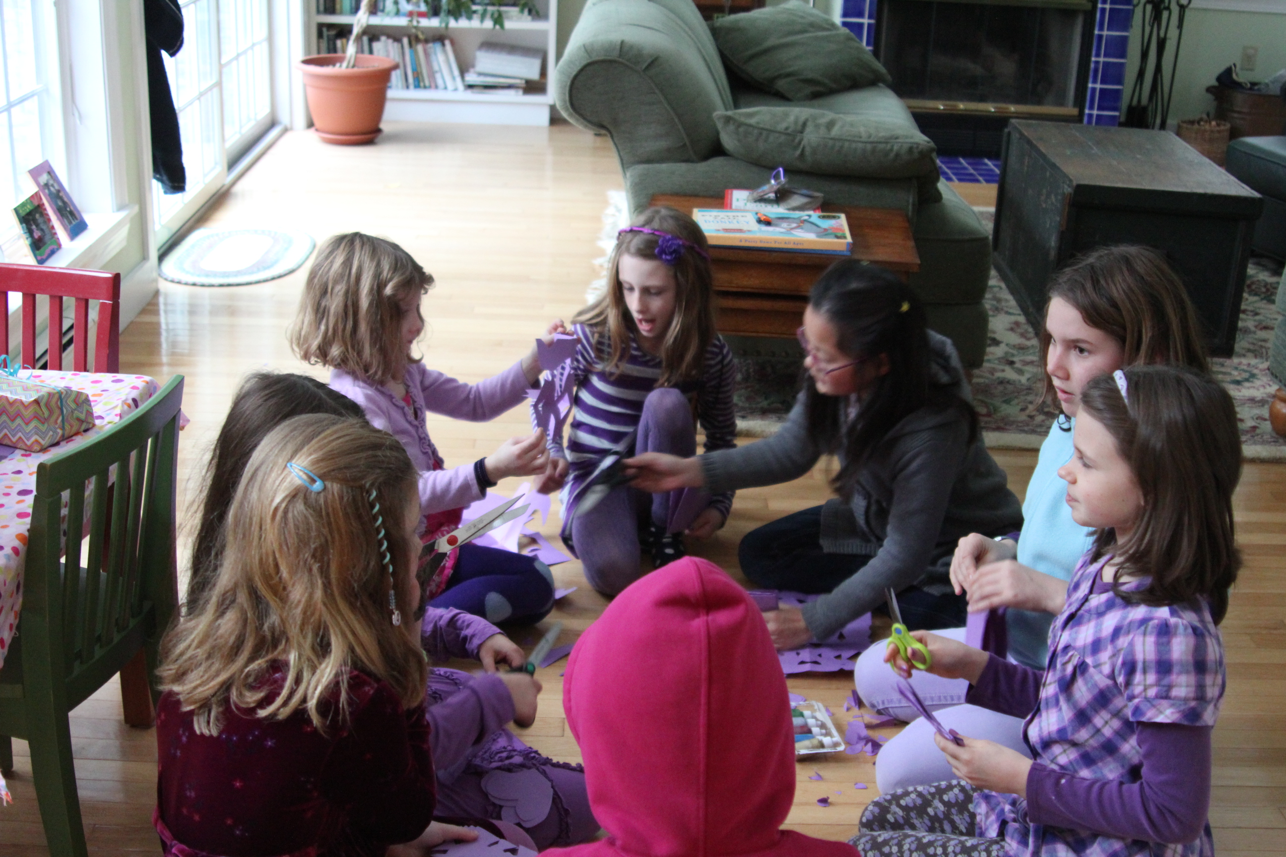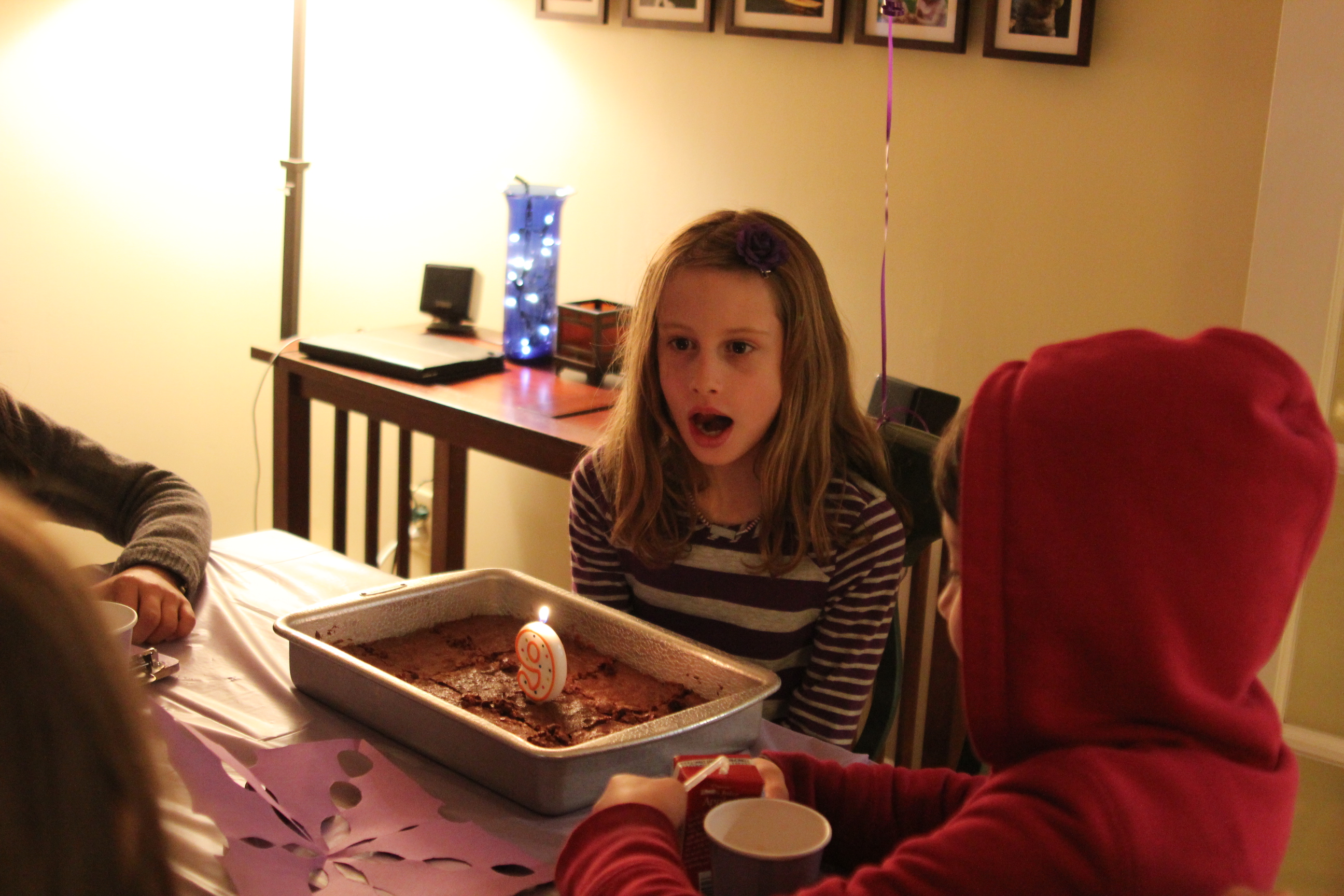 It has been a few years since Grace had an actual birthday party. In fact, this is the first one that she planned mostly herself. The theme had to be purple. There must be purple party favors, and the braiding of purple friendship bracelets, and a pinata (with self-made purple confetti!). Her guests enthusiastically went along with the purple theme, wearing purple clothes and even presenting Grace with purple presents. My girl was very happy. It was…perfect.