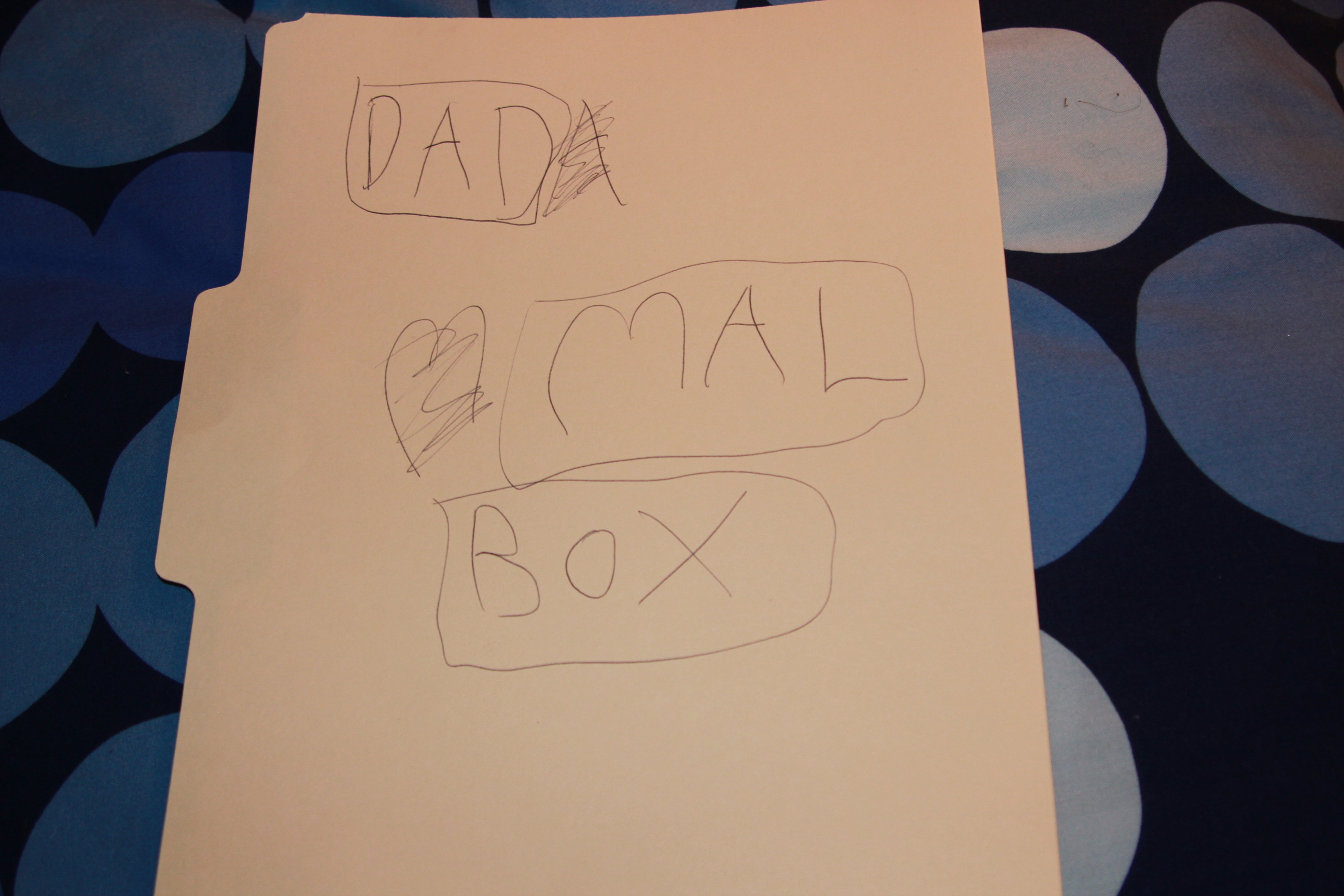 It rained all weekend, which was good in that it forced us to stay home and have some down time. Tess stayed in her pajamas all weekend, except for a couple of hours on Saturday when we went to a friend's house for dinner (she changed into fleece pants for the occasion). I love quiet weekends, because the girls always come up with creative ways to pass the time. This weekend they dressed up as witches, played a made-up game involving an alligator, made haunted houses out of paper, and had a dance party. My favorite thing, though, were the mailboxes they made for each of us. And every once in a while, we would all get mail. Very sweet mail (Adam's mail box and two pink notes by Tess, blue note by Grace).