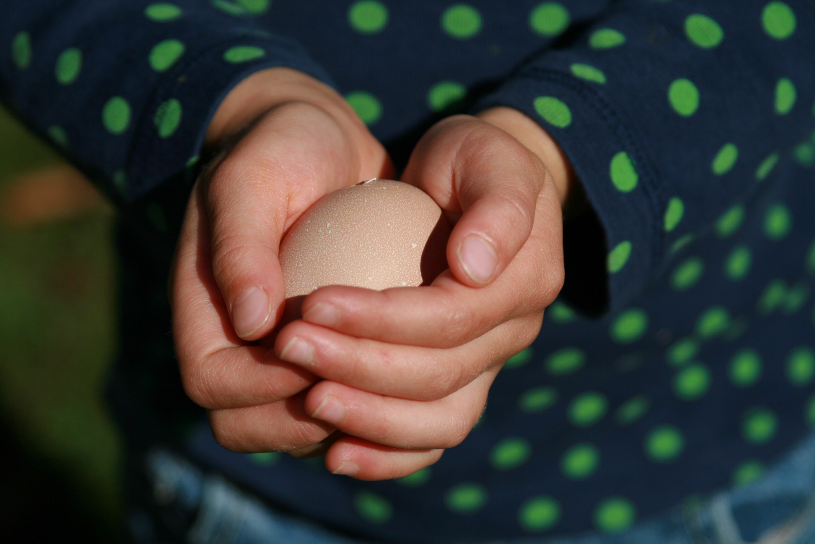 Ta-da!! Upon returning home from our morning outing, Grace went to the coop to check for eggs. And much to her surprise, she actually found one. It was on the ground in front of the coop — not in the nest box, or even inside the coop — but I figure that's better than being laid under a bush or in the woods. We assume that Sally laid it, (don't ask why, chicken farmers just know these things), and in the photo below, you can see Grace congratulating her. It's a beautiful egg— nicely shaped, brown with a few little white spots — but it does have a puncture mark, like maybe someone pecked at it. But we don't care — it's OUR egg, from OUR own chicken, and now, besides just being fun to watch, those critters are finally starting to earn their keep!